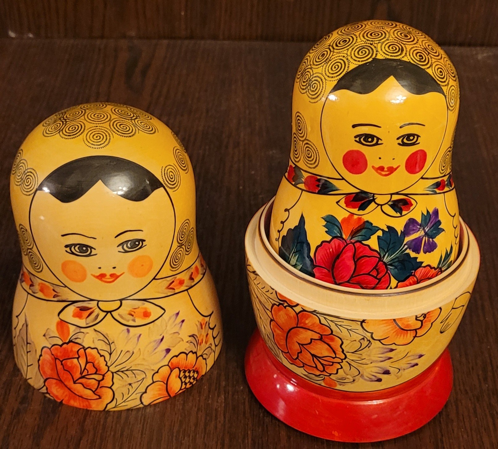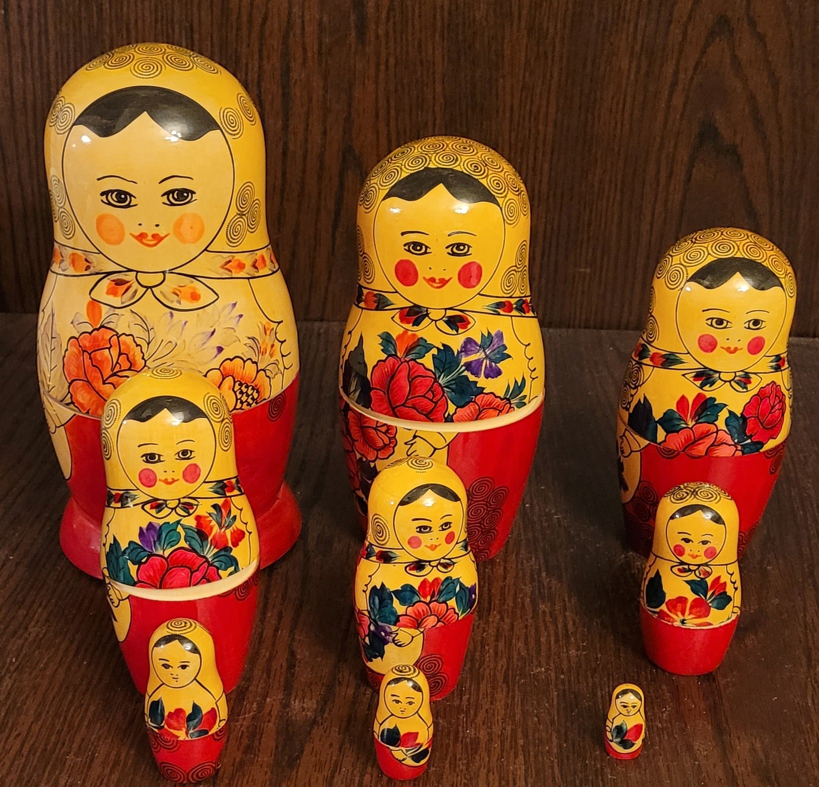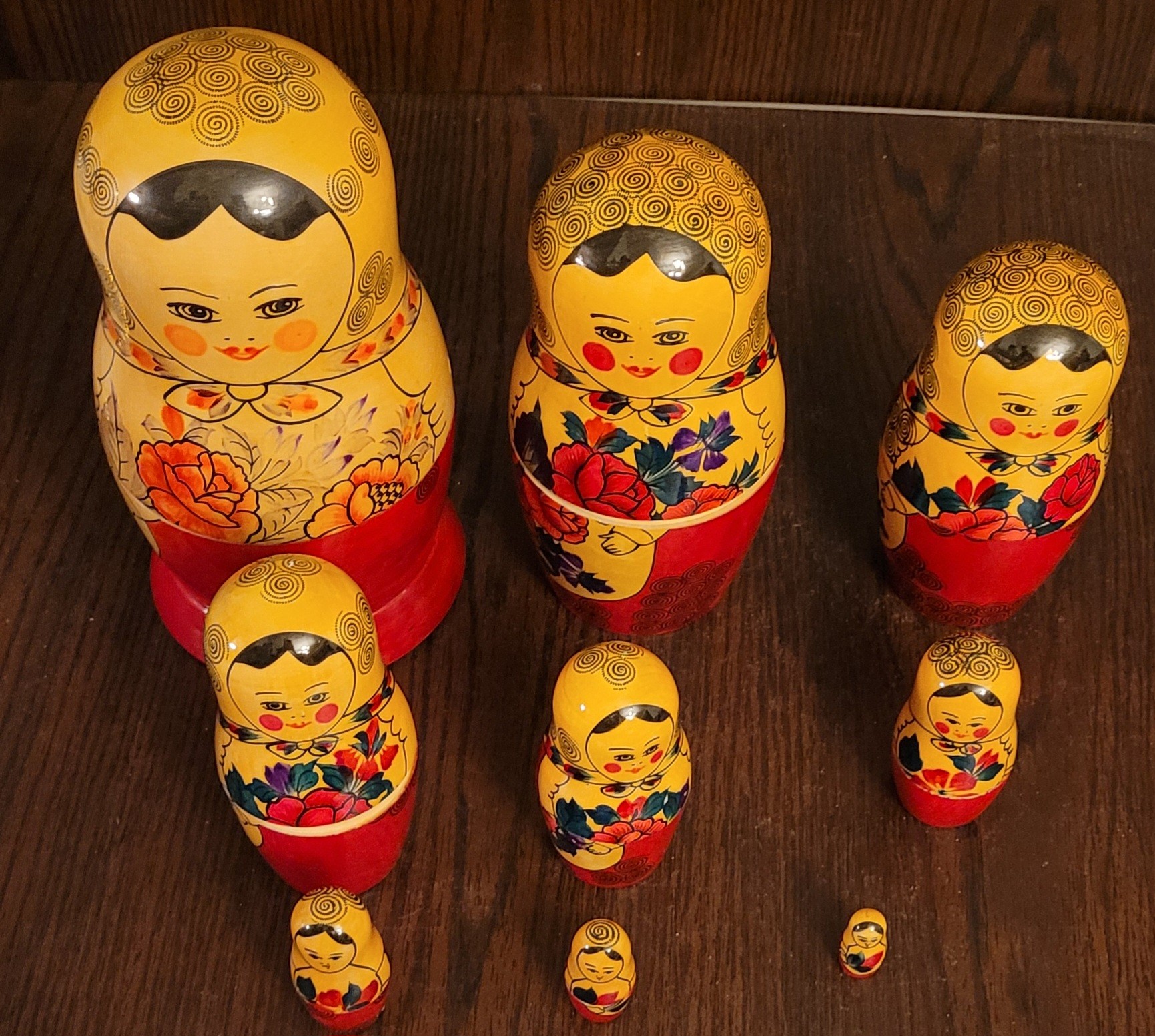 This set of Russian Matryoshka Nesting Dolls is a beautiful addition to any collection. The set includes nine pieces each. The dolls are handcrafted and made with precision, showcasing the rich culture of Russian Federation. The provenance of this set is not available, but it is evident that it has been owned and cherished for years. The intricate design and attention to detail make this set a must-have for collectors and enthusiasts alike. Add this stunning piece to your collection today!