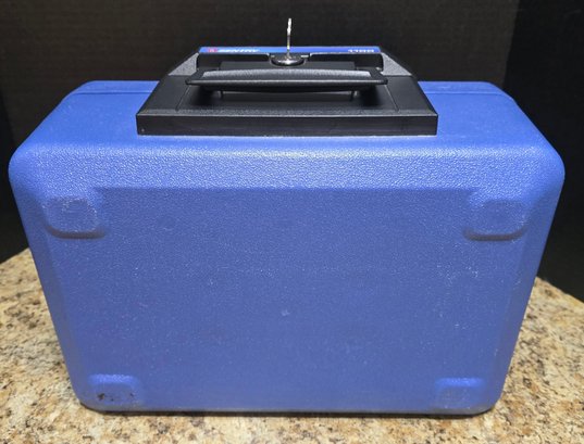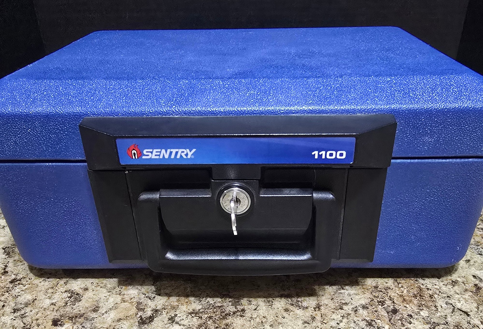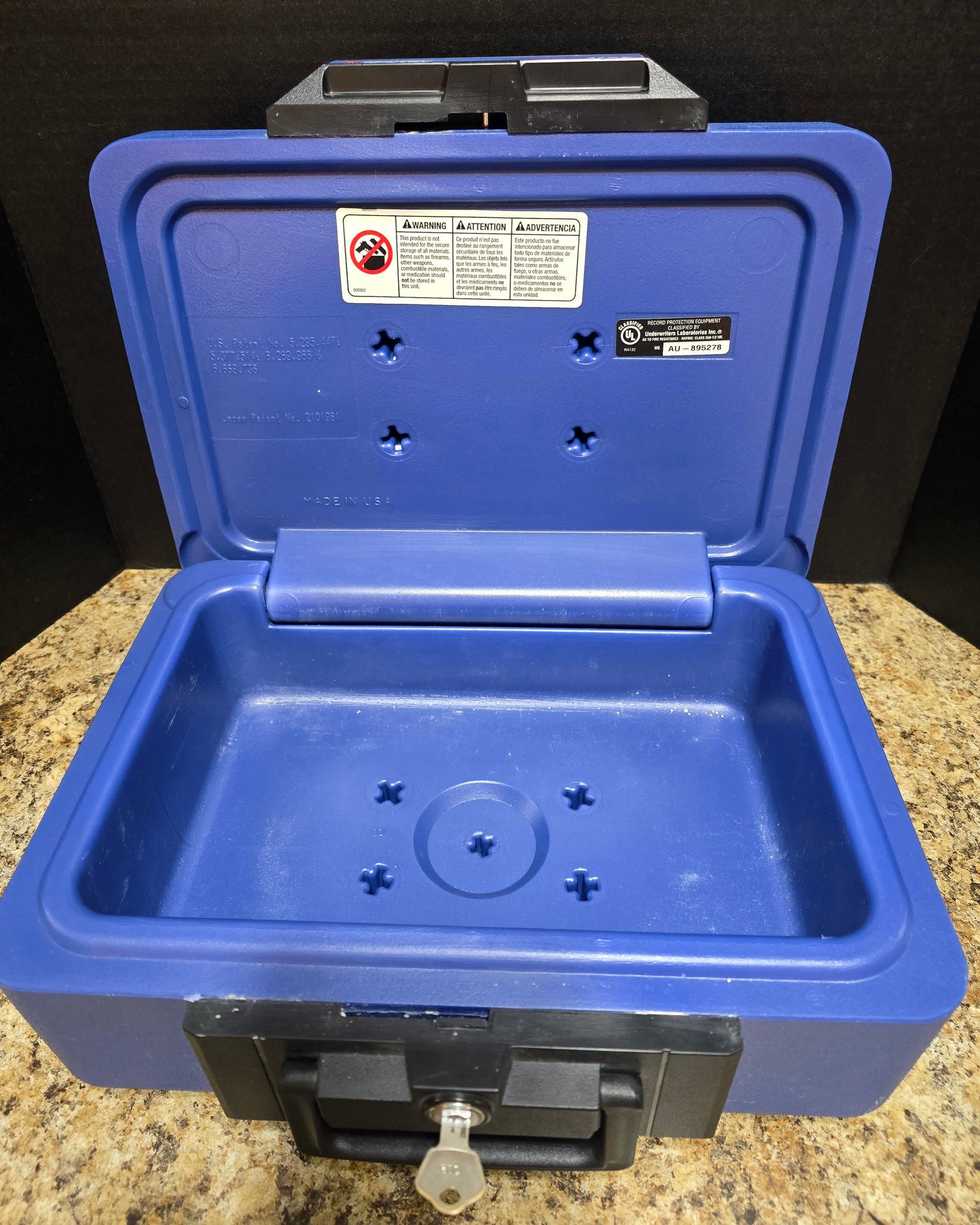 SentrySafe 1100 Fire-Safe Security Chest in Arctic Blue. Comes with key. Measures 14.25 x 11 x 5.5. Please see all pics for details.