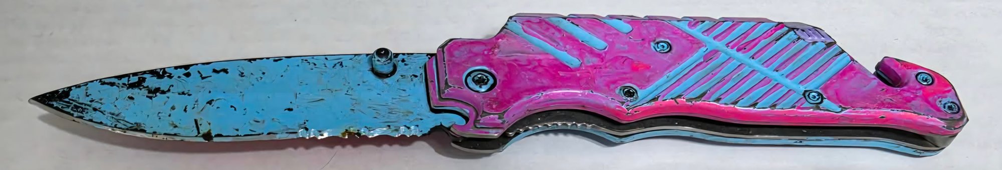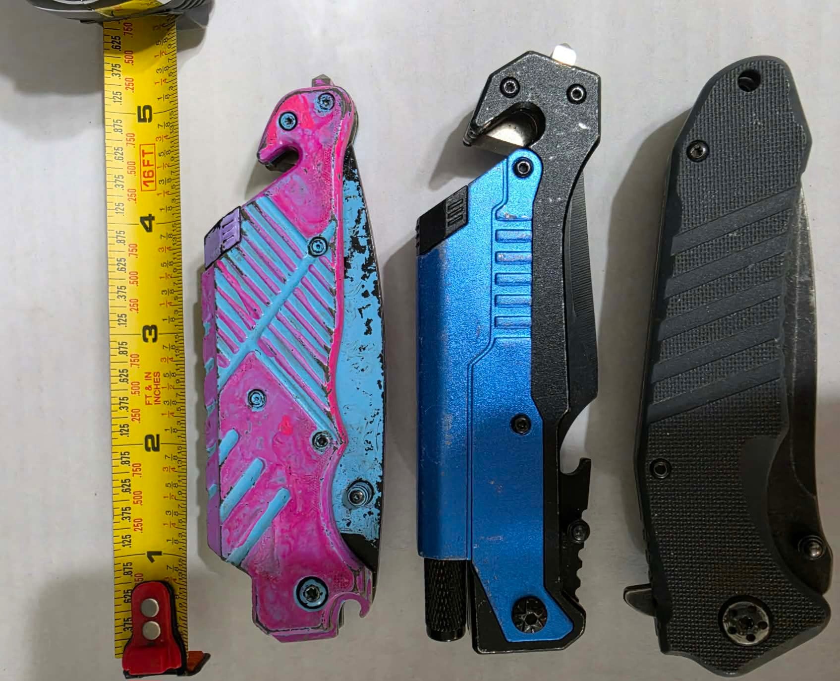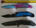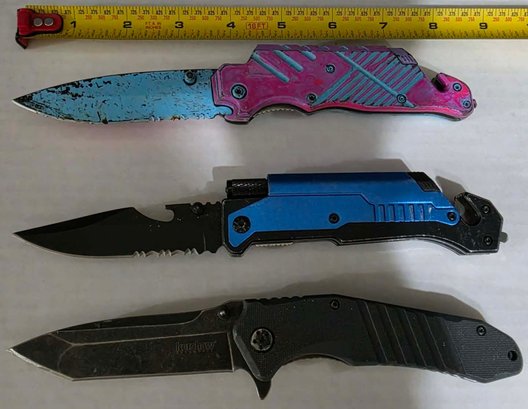 Set of 3 knives. One Kershaw. The blue one does have a flashlight but couldn't get it to work. The other is painted.