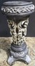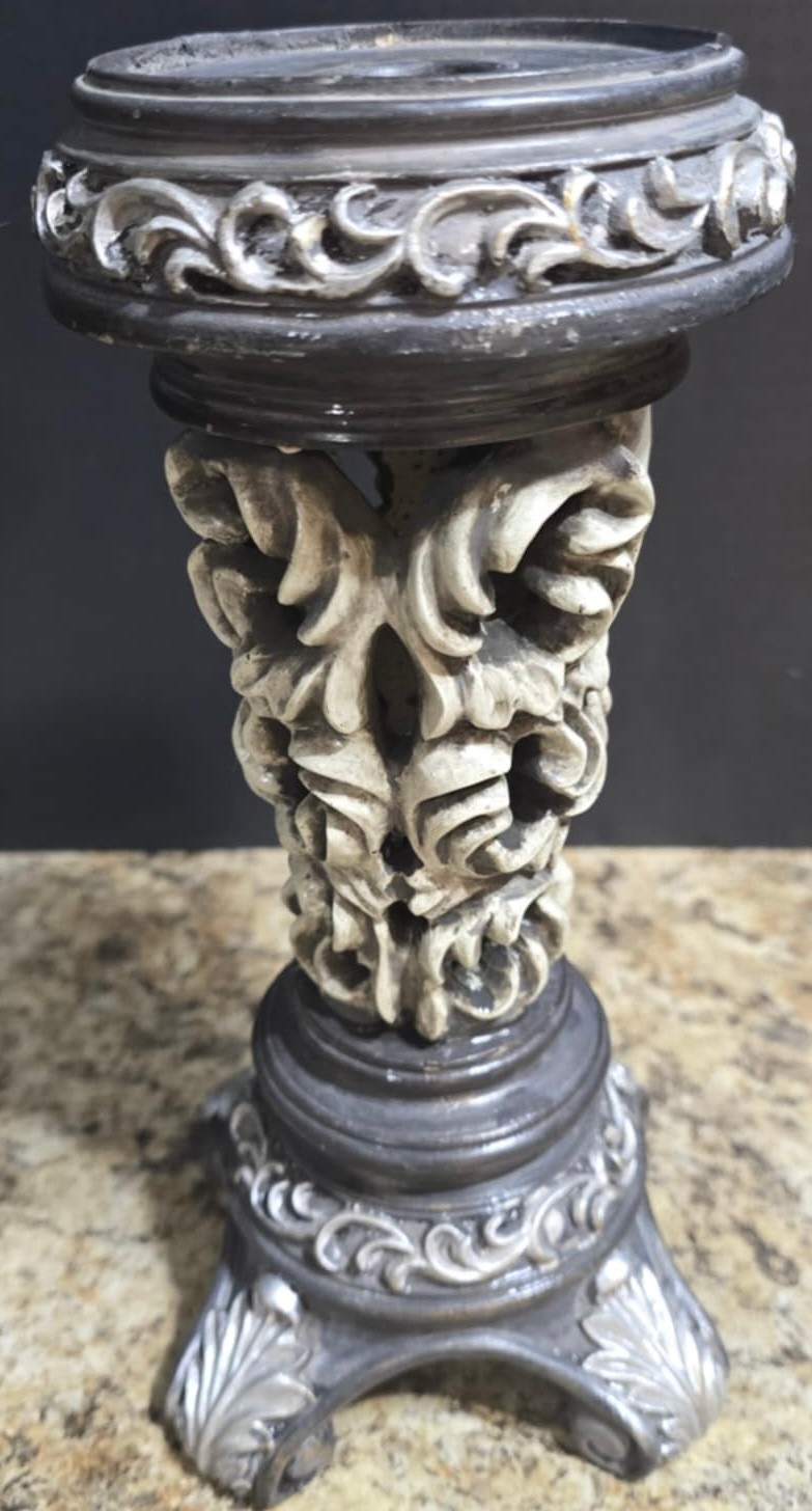 Set of distressed vintage-style carved resin candlestick holders with a dark, antiqued finish. The taller one does have a crack and chip under the top. Measures 11.5 x 4 and 10 x 4.