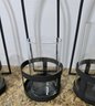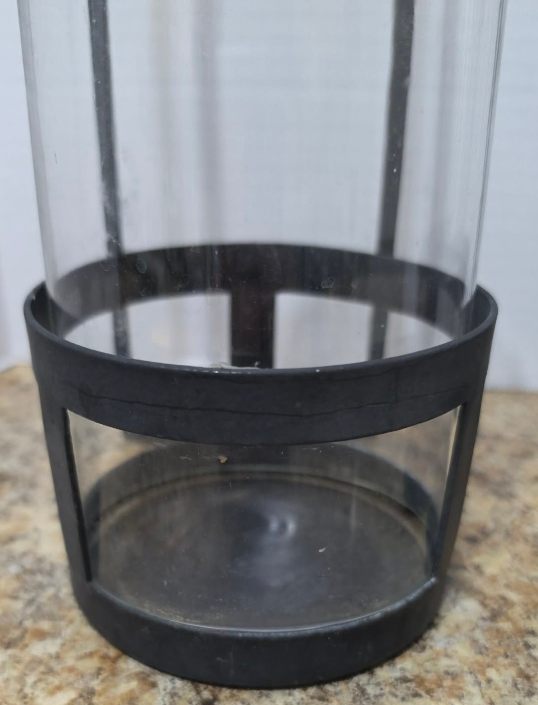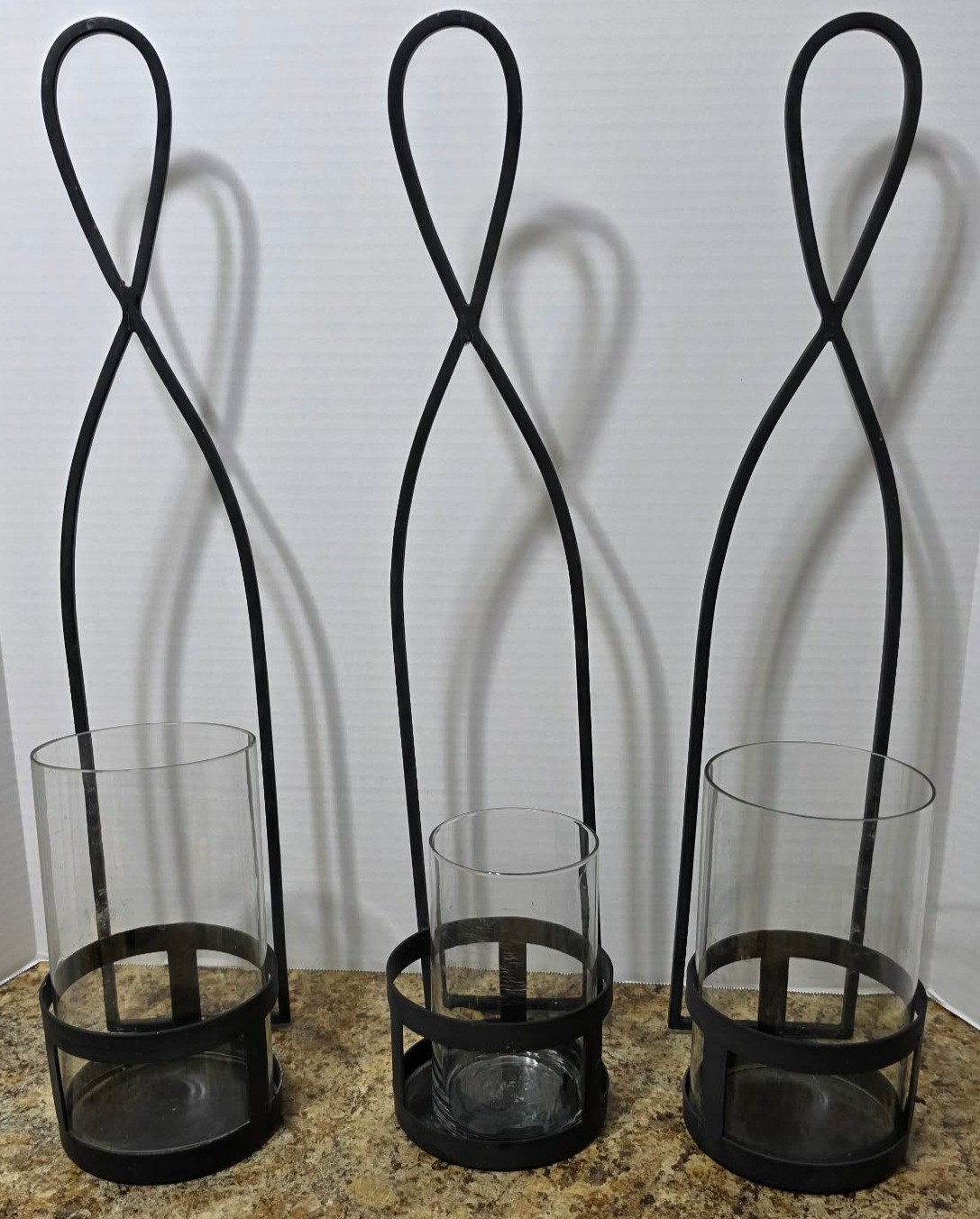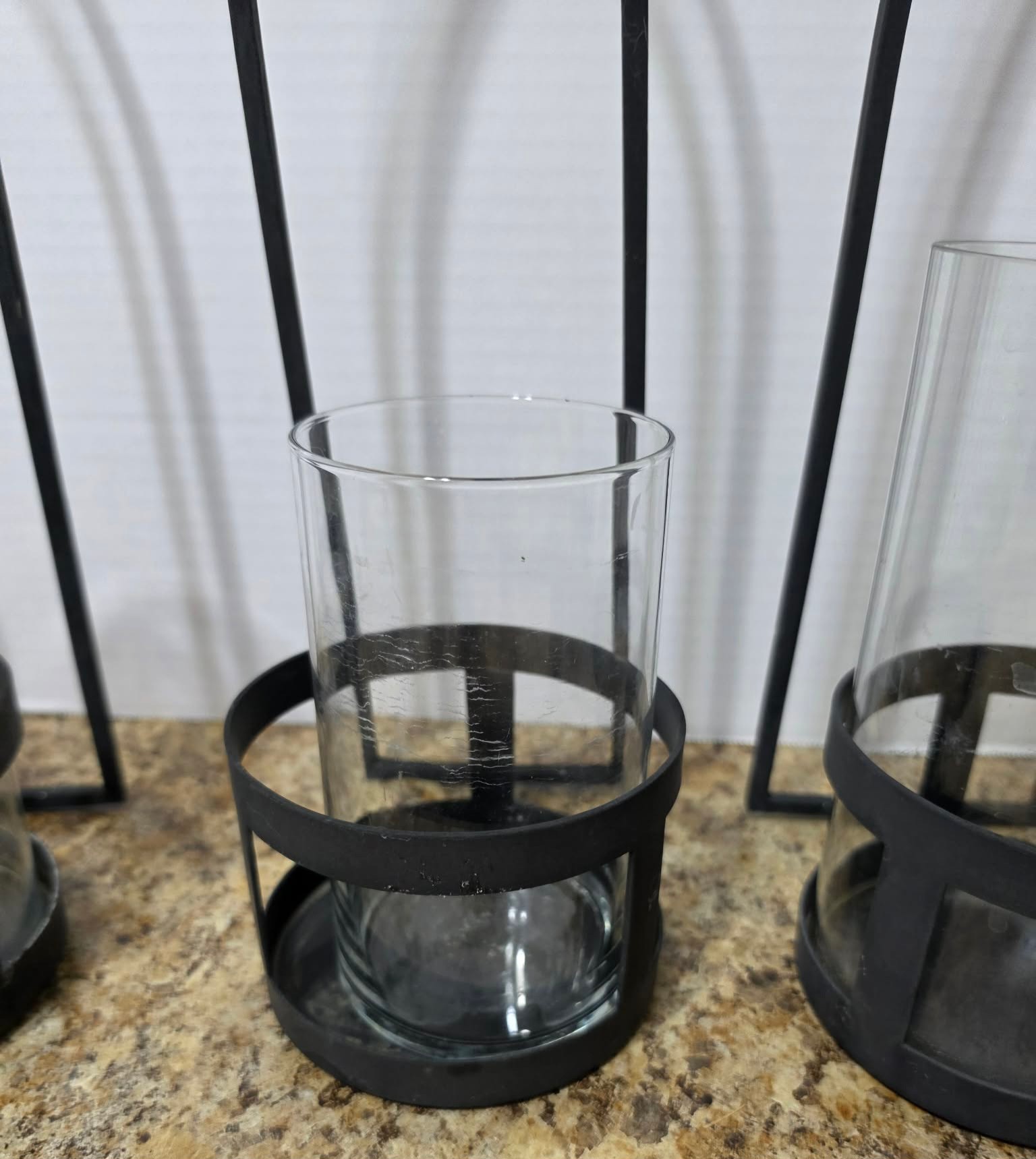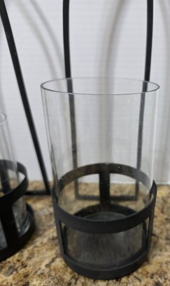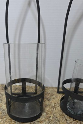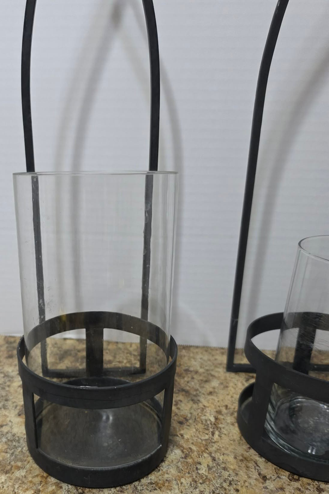 Set of Elements brand black metal wire hanging lantern with a clear glass insert designed for use with wax or flameless candles. one Glass Insert is smaller than intended. Measures 21h.
