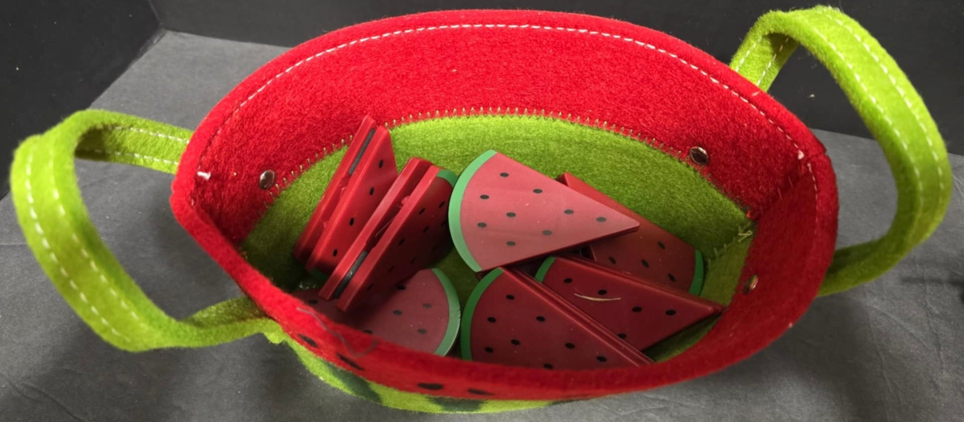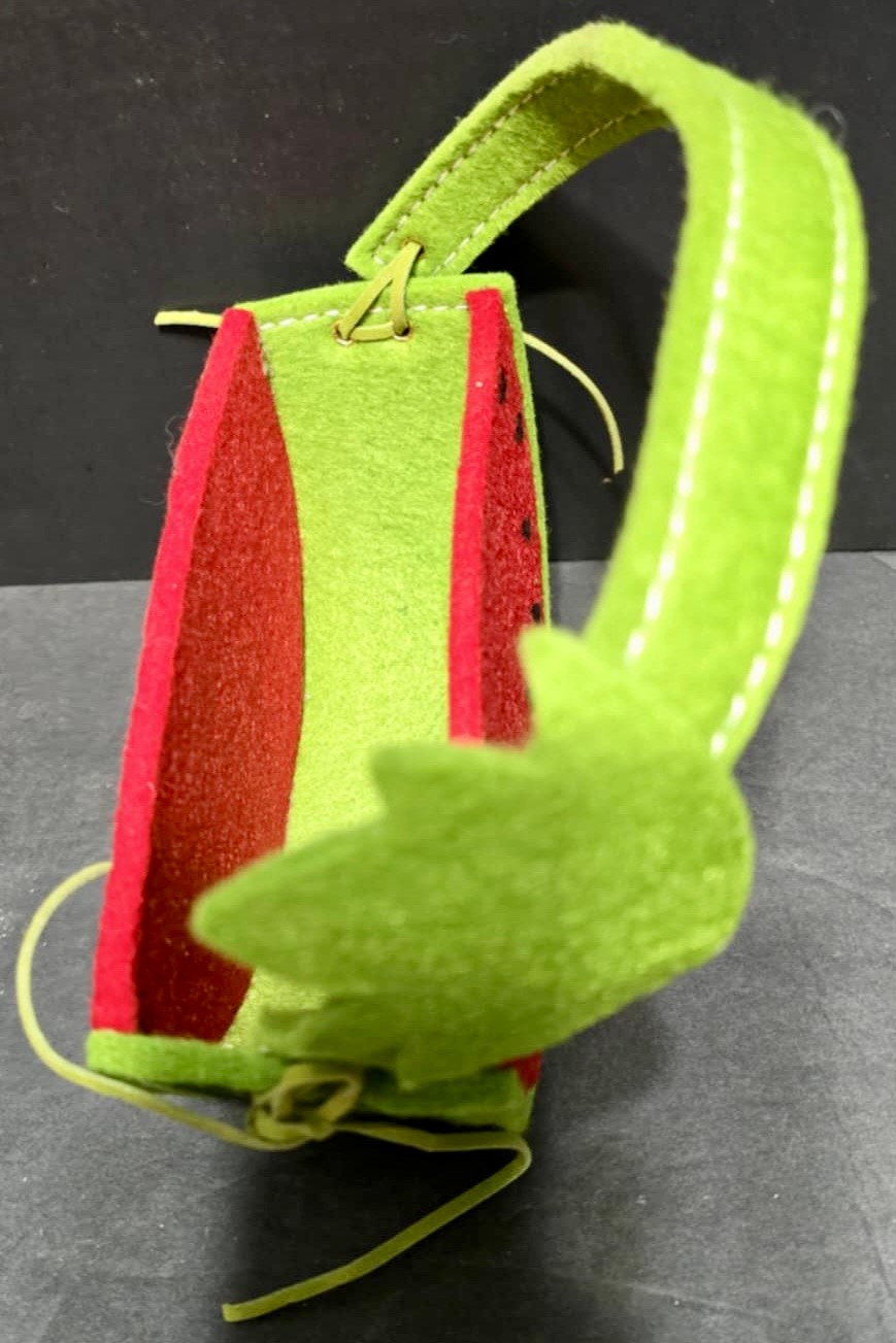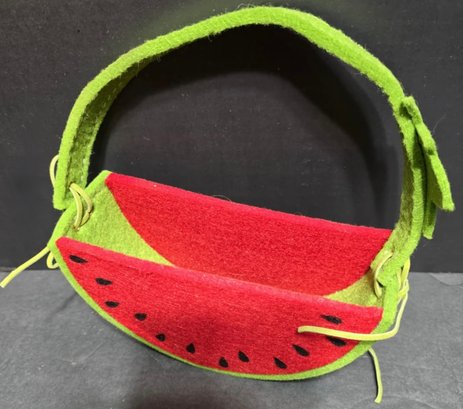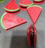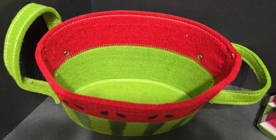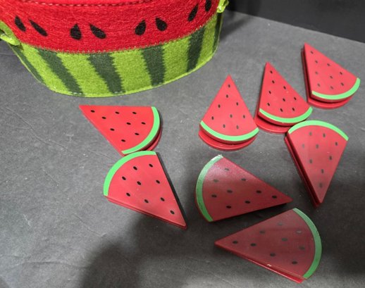Set of felt watermelon-themed baskets or bags used as organizers. Includes wooden watermelon napkins rings. Wooden watermelon napkins holder and composite watermelon clips. Largest basket is 10 x 7 x 5.
