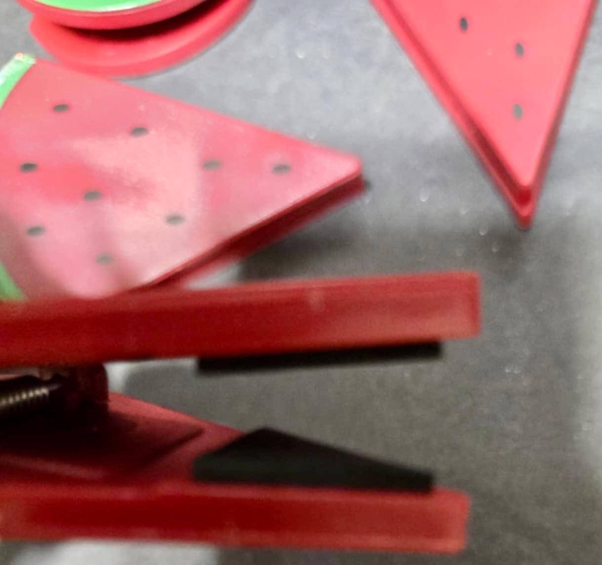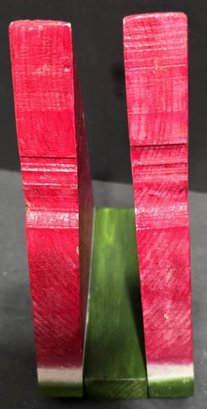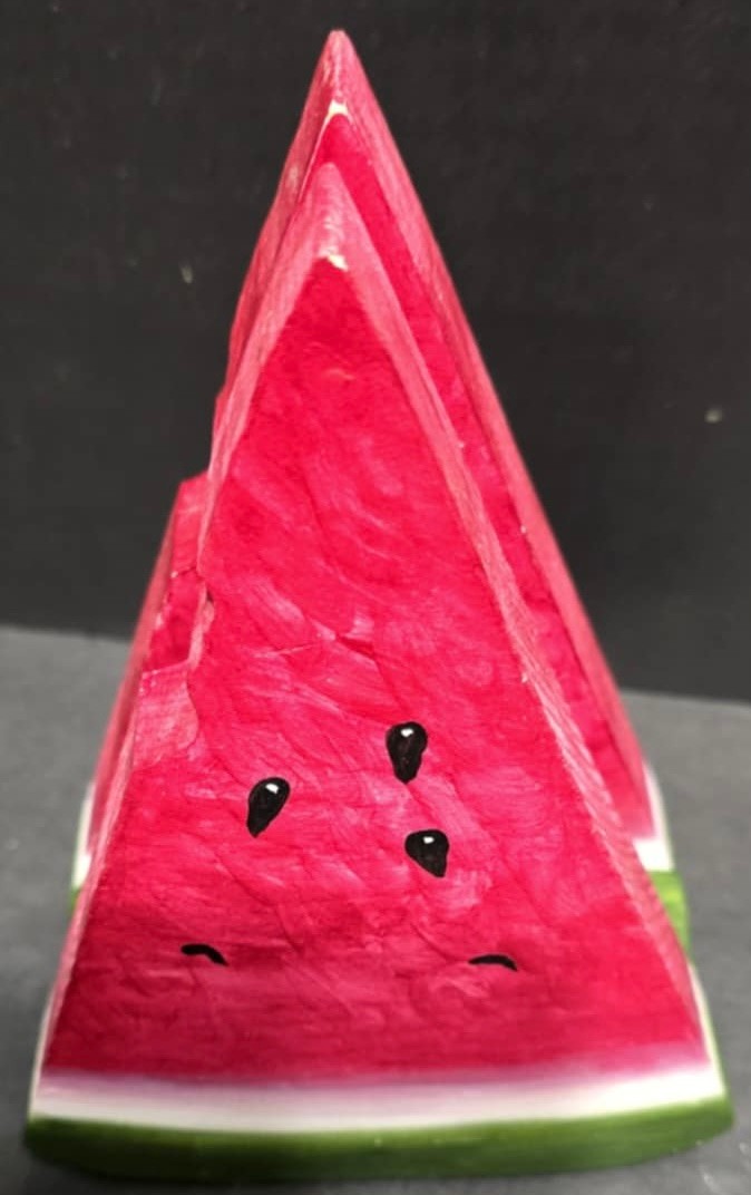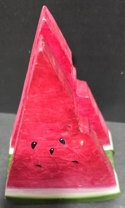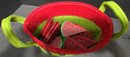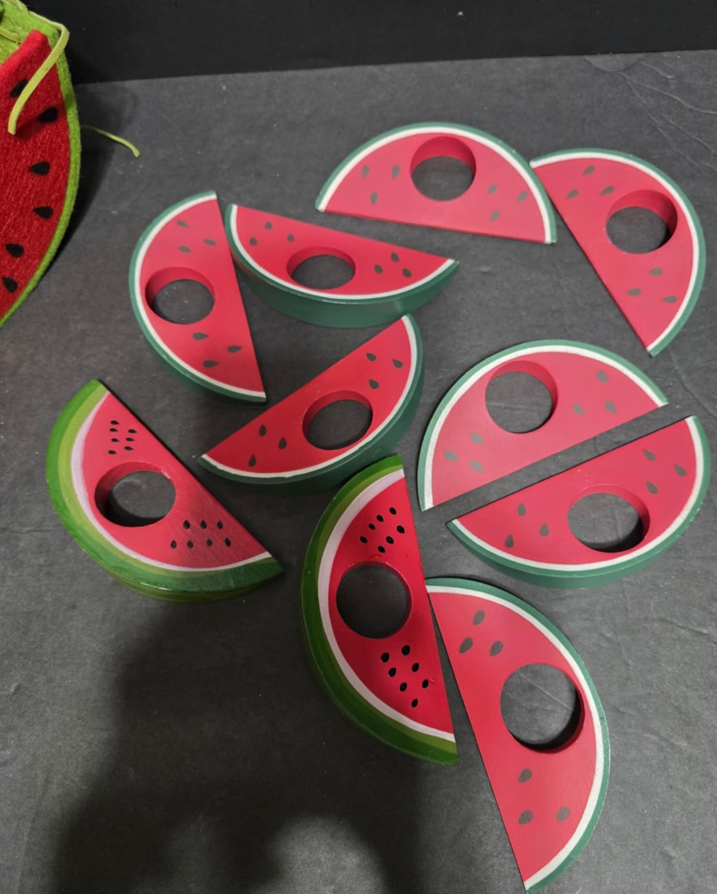 Set of felt watermelon-themed baskets or bags used as organizers. Includes wooden watermelon napkins rings. Wooden watermelon napkins holder and composite watermelon clips. Largest basket is 10 x 7 x 5.