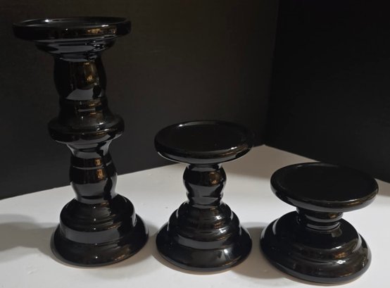 Set of three black ceramic pillar candle holders. Measures 4.5 x 9.25, 4 x 5.5 and 4.25 x 3.5. No cracks or chips noted.