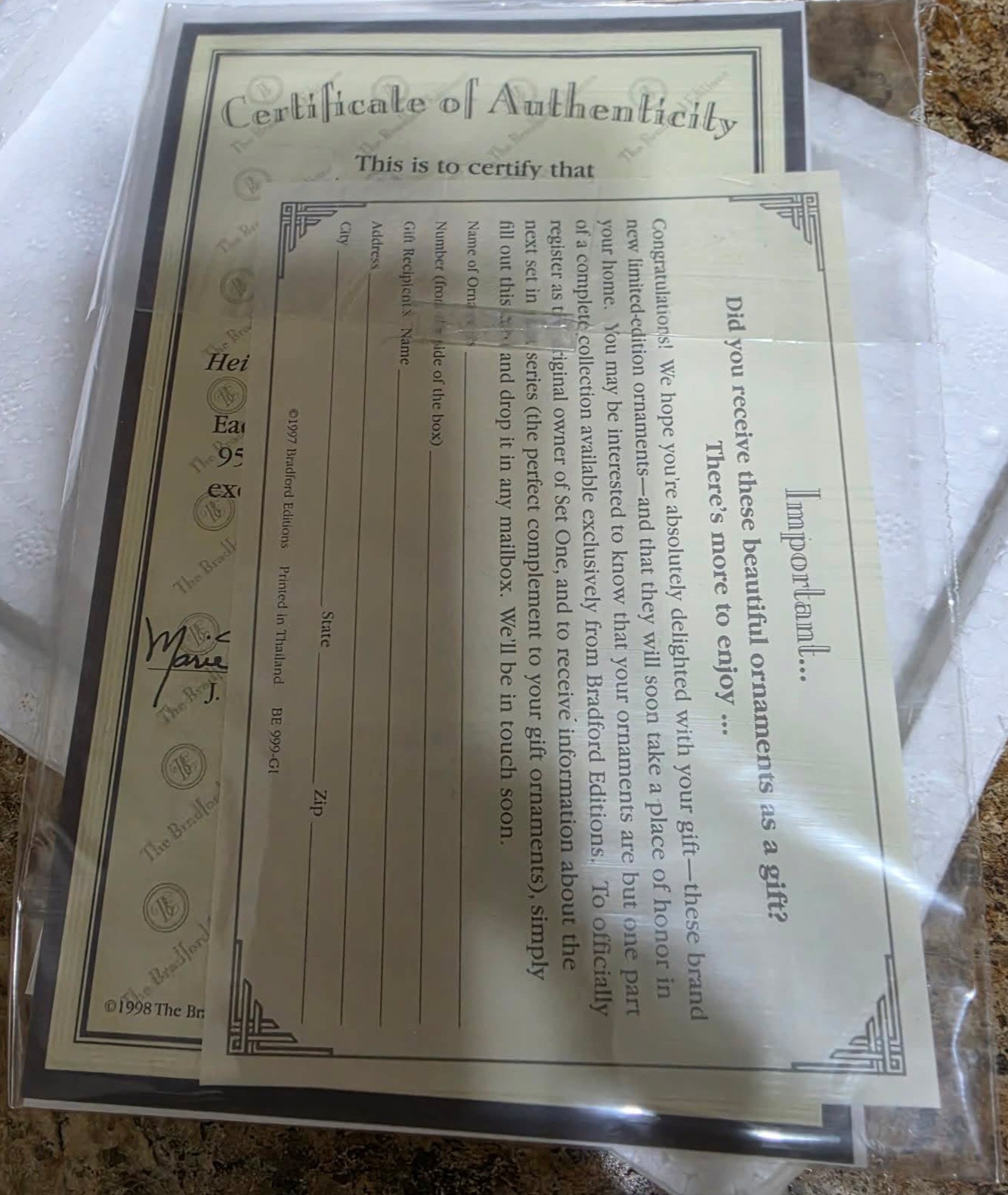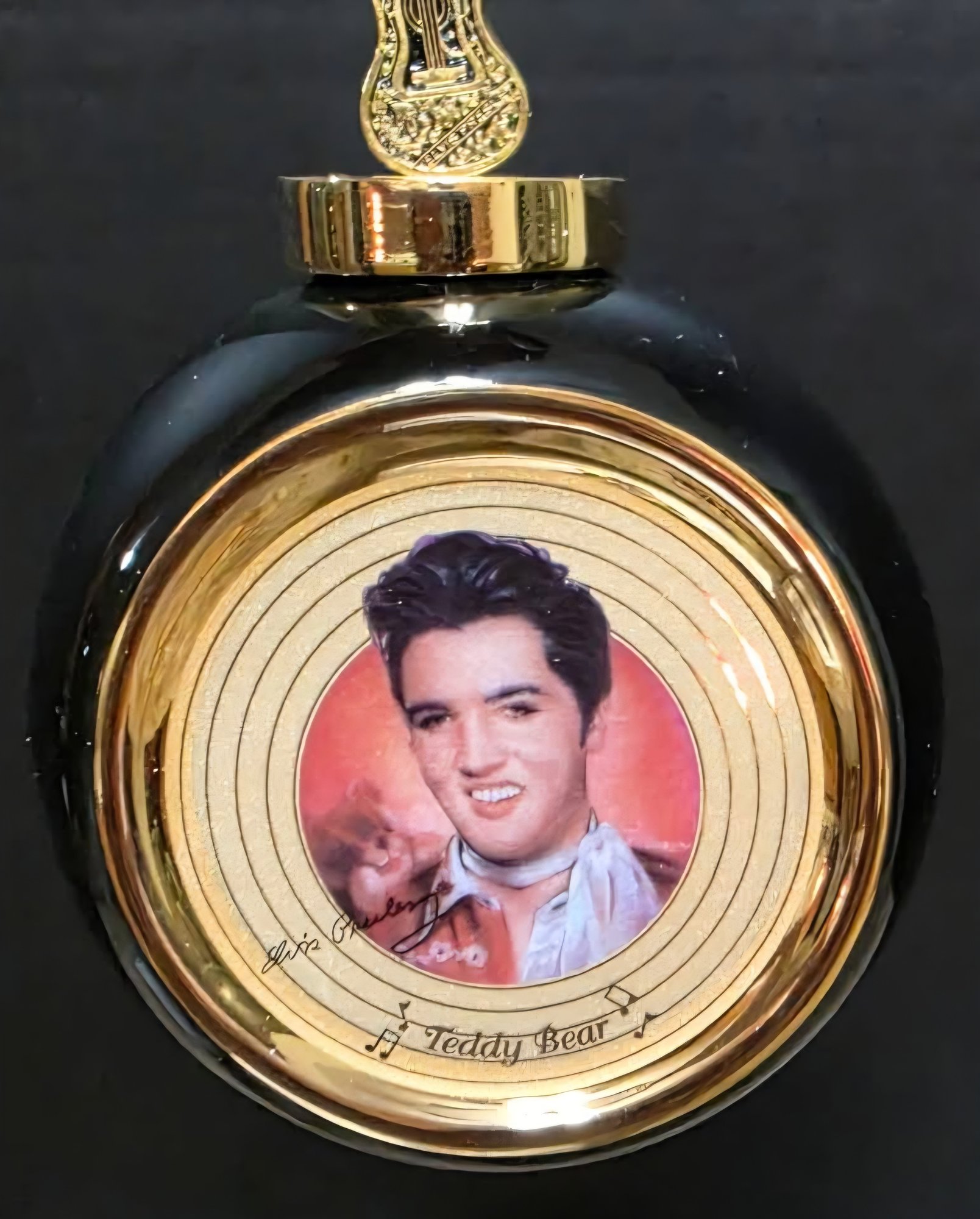 Set of two "Solid Gold Elvis" Heirloom Porcelain Christmas ornaments from the Bradford Exchange. Measures 4"h.