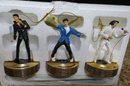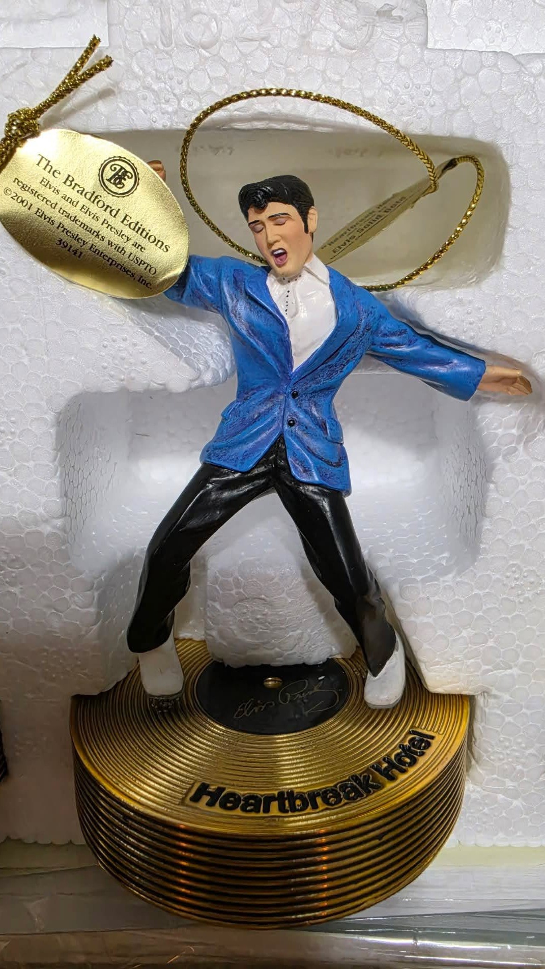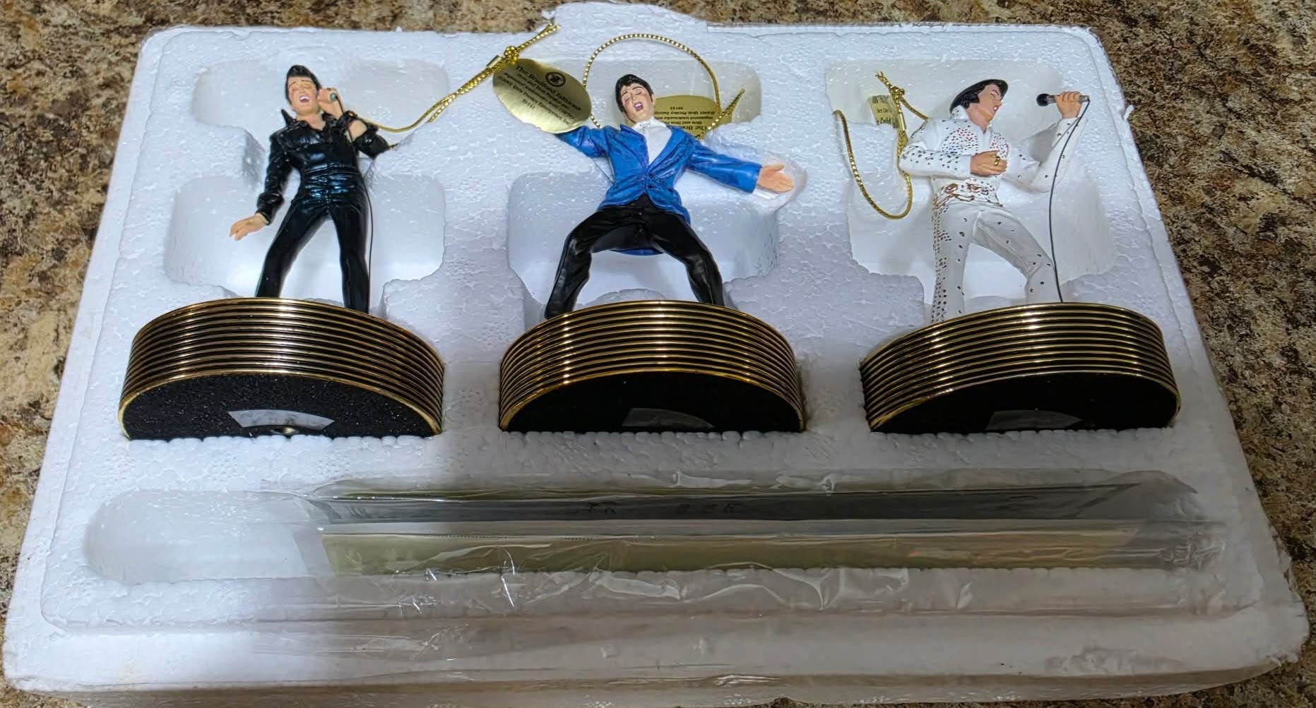 Set of vintage Elvis Presley "Solid Gold" musical ornaments from The Bradford Exchange. Measures 4"h. No cracks or chips noted.