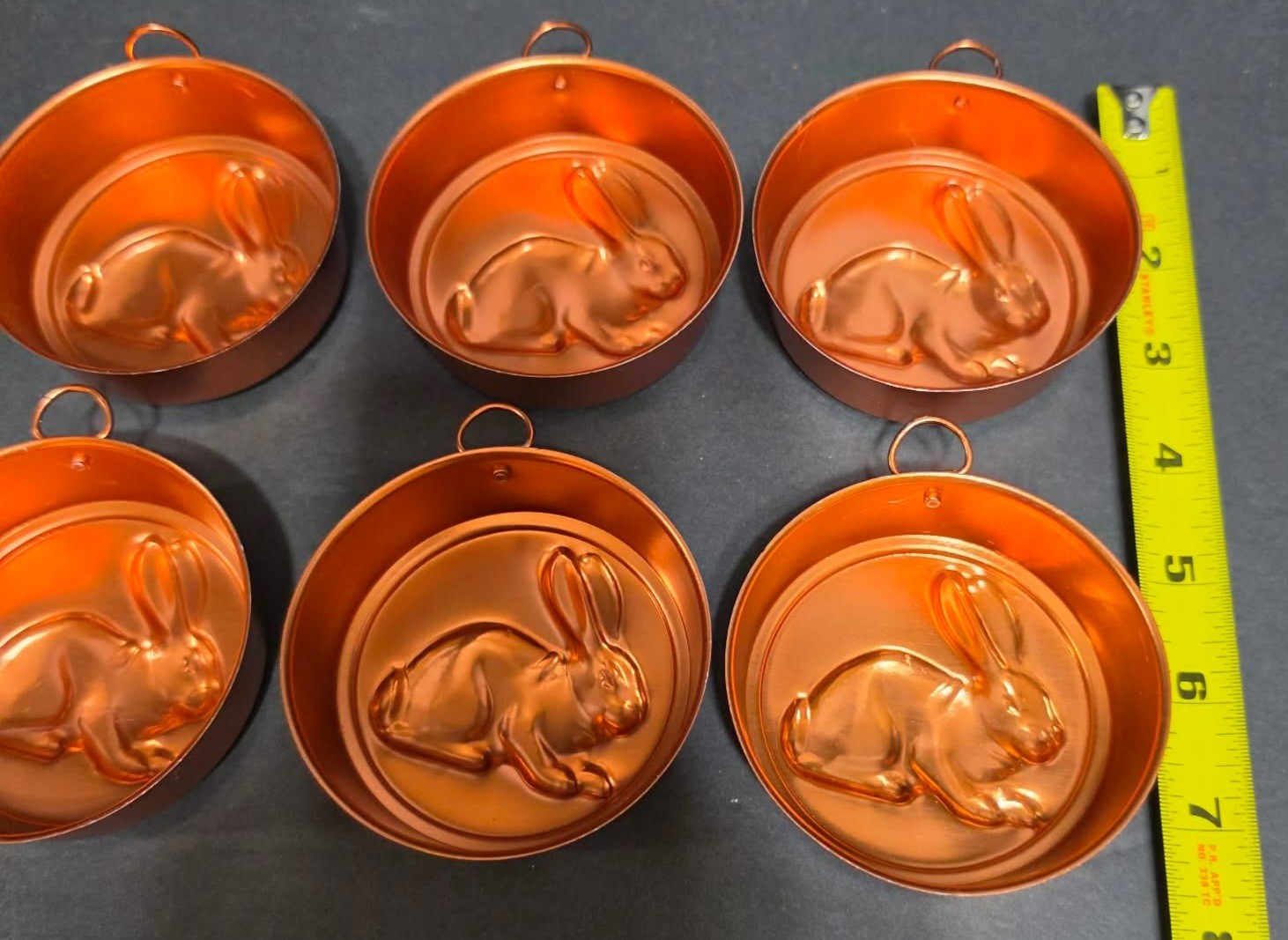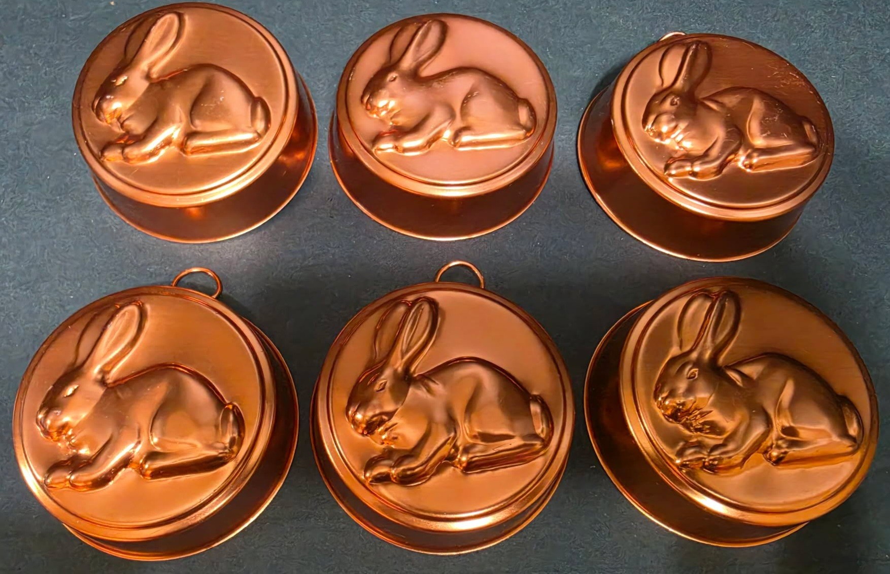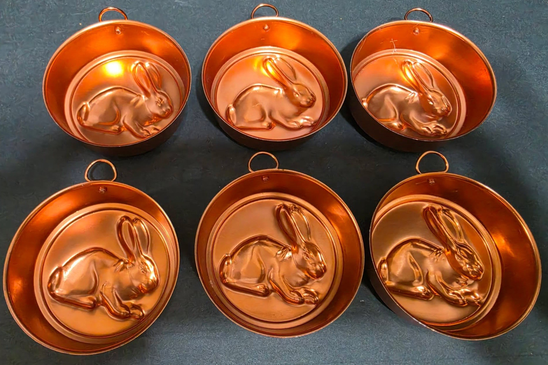 Set of vintage miniature aluminum jelly or cake molds shaped like rabbits. One is bent a little.