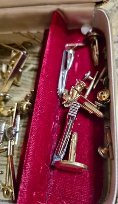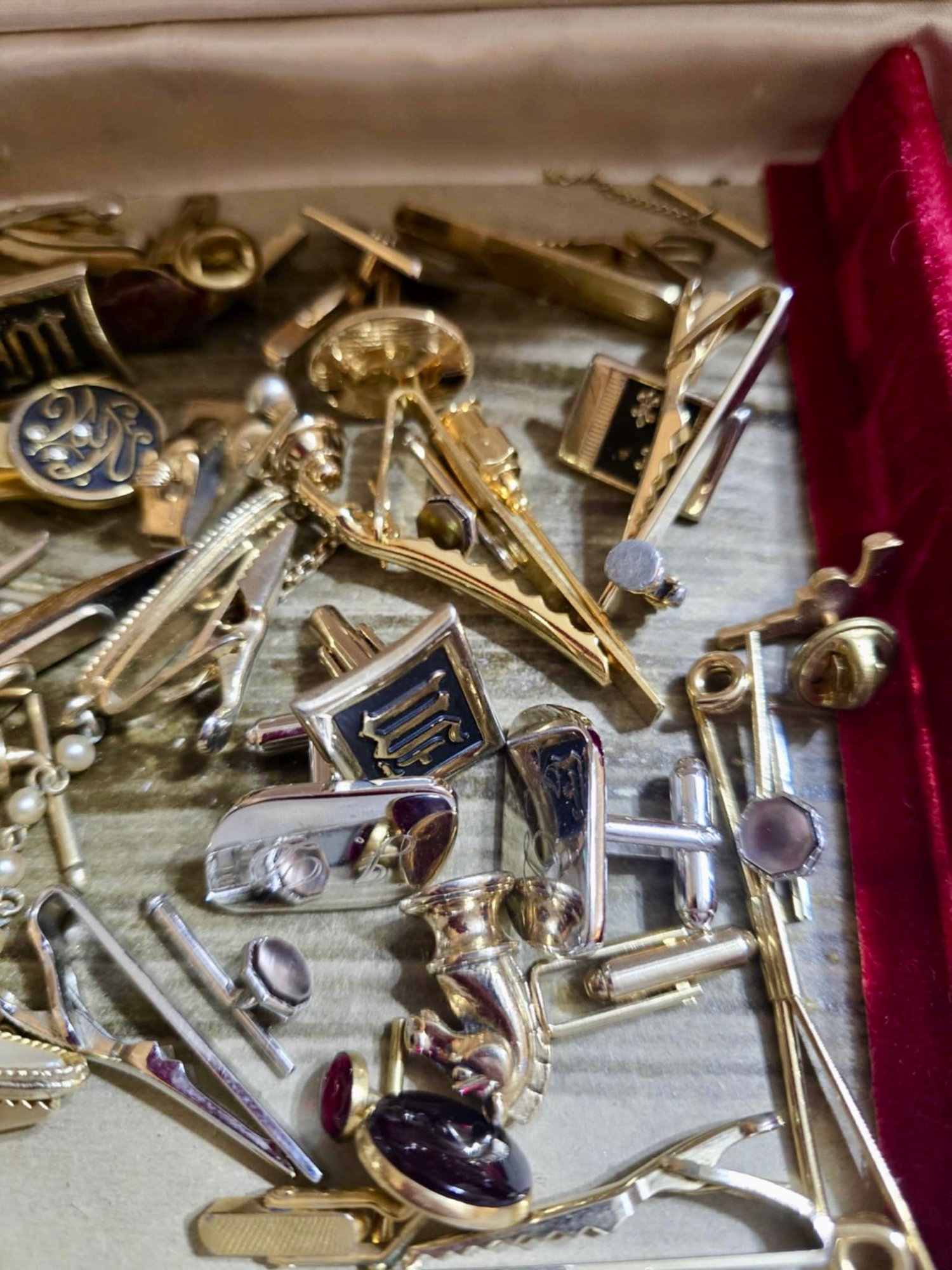 Small box of mixed tie tacs, cuff links and tie bars. Many mismatched.