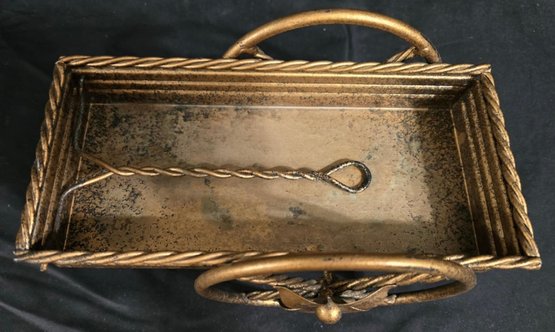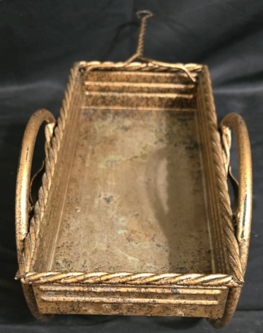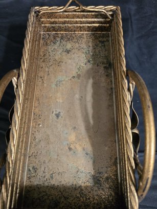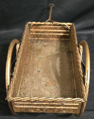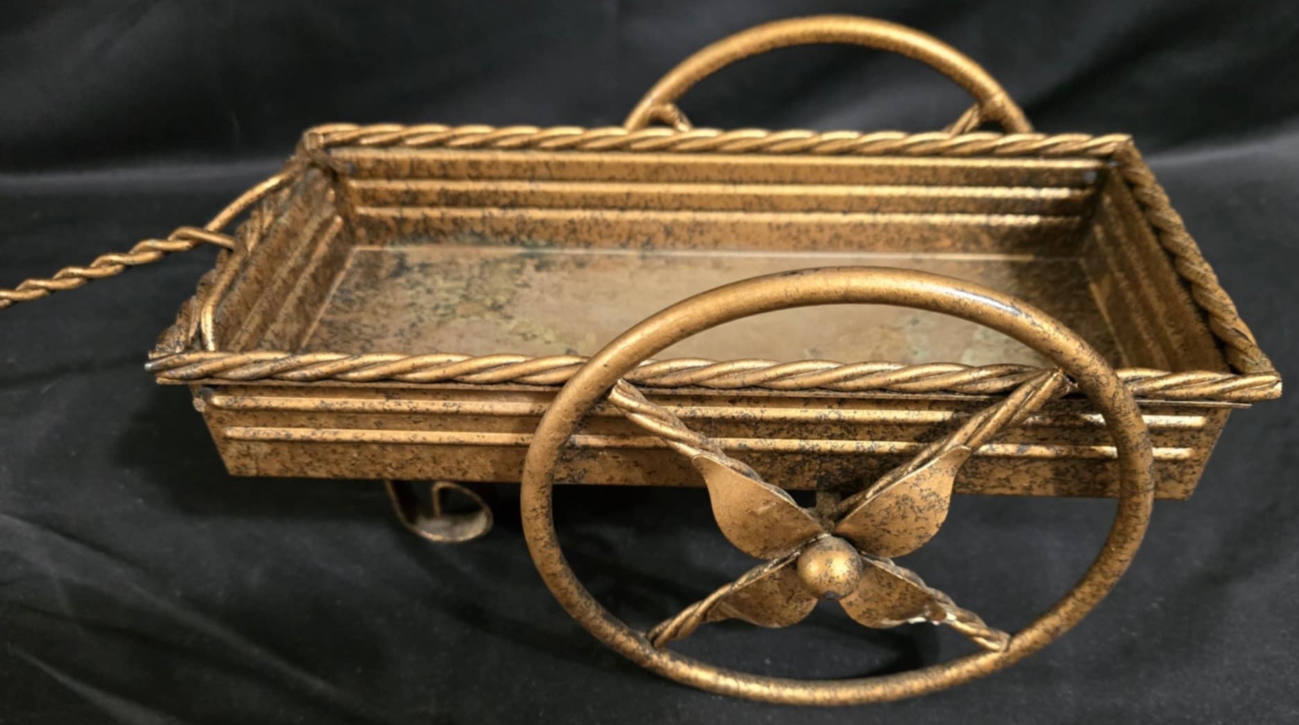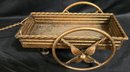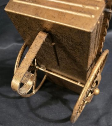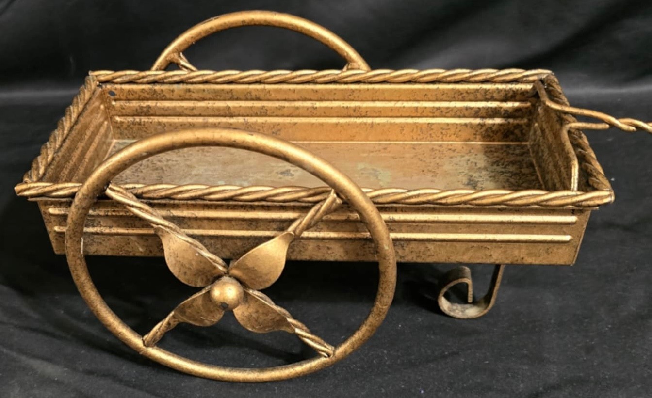 Small, ornate metal wagon planter with a gold-tone finish. Has some discoloration. Measures 10.25 x 5.75 x 6.5. Not counting the handle.