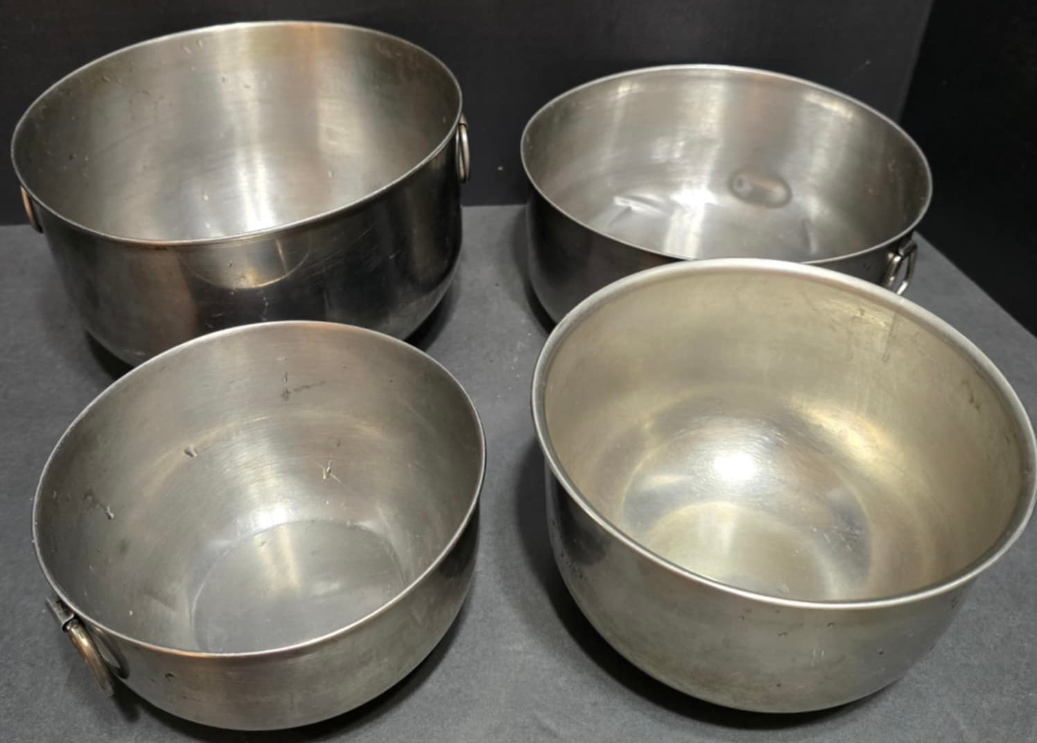 Stainless steel bowls. Largest is 7.5 x 4.5. Smallest is 5.5 x 3.5.