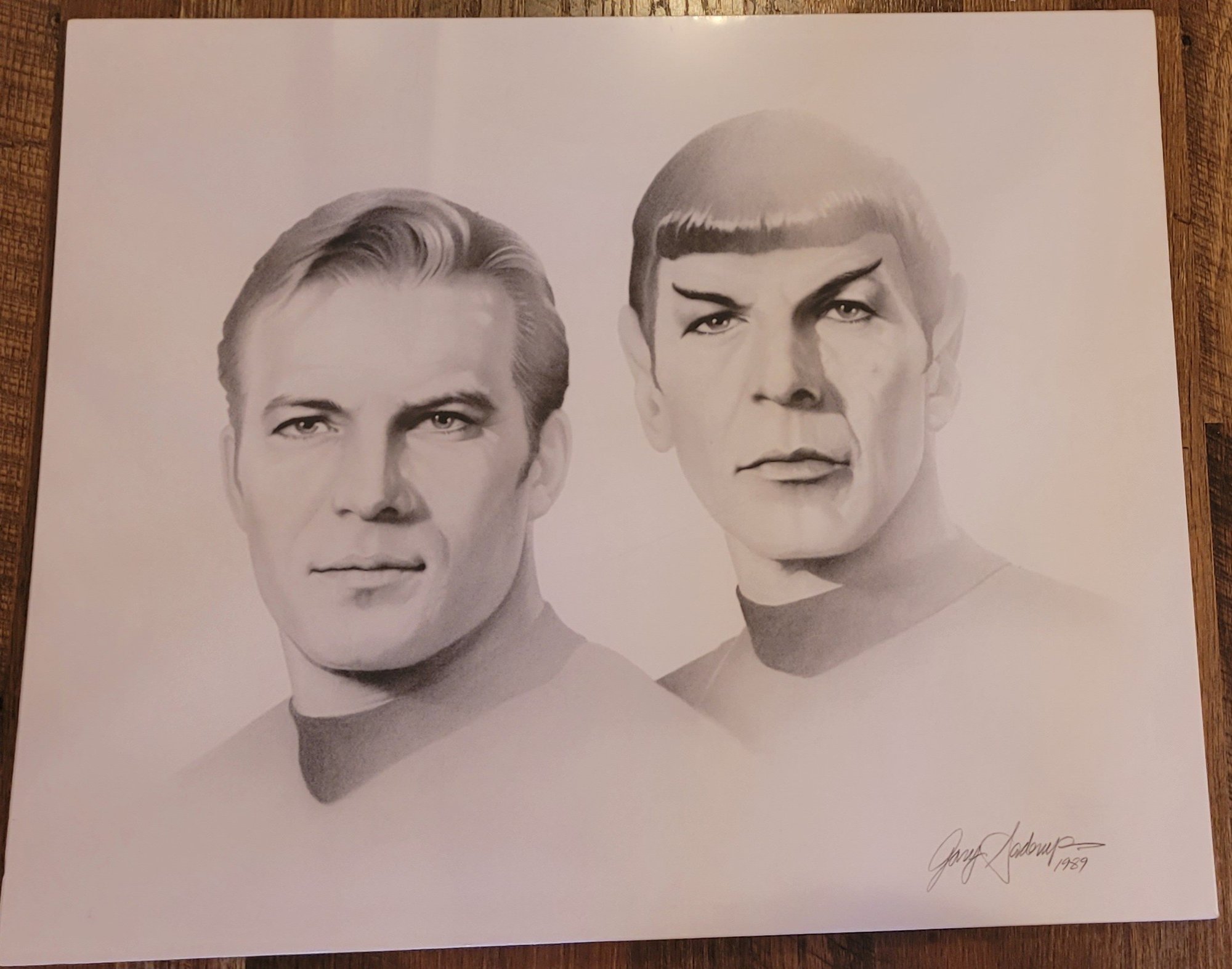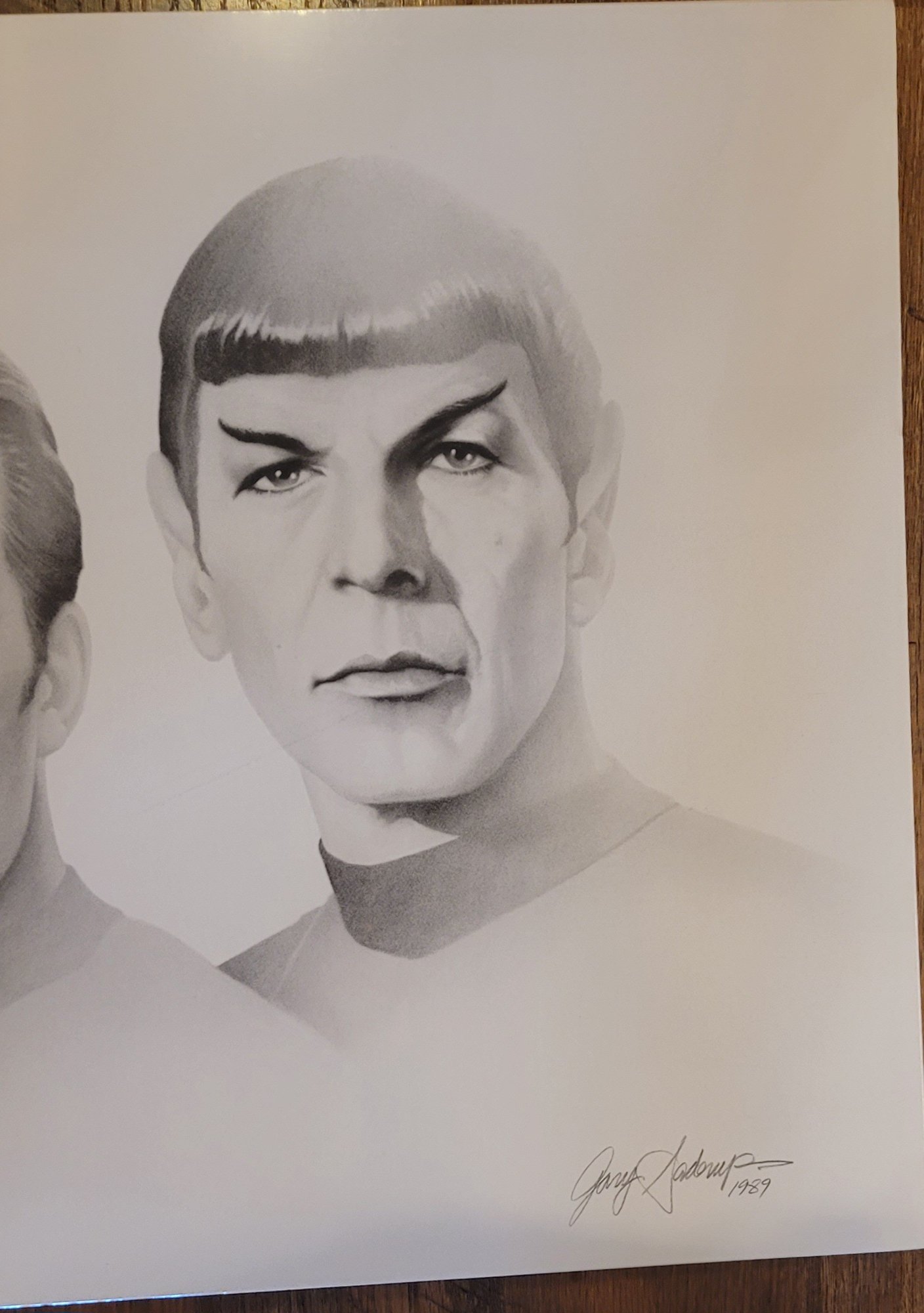 The product is a 20x24 lithograph poster featuring characters from Star Trek, specifically Spock and Kirk, created by artist Gary Saderup. This signed poster captures iconic moments from the radio series and is a must-have for any Star Trek memorabilia collector. The high-quality artwork and signature add value to this unique and sought-after piece of entertainment memorabilia. See pictures for details.