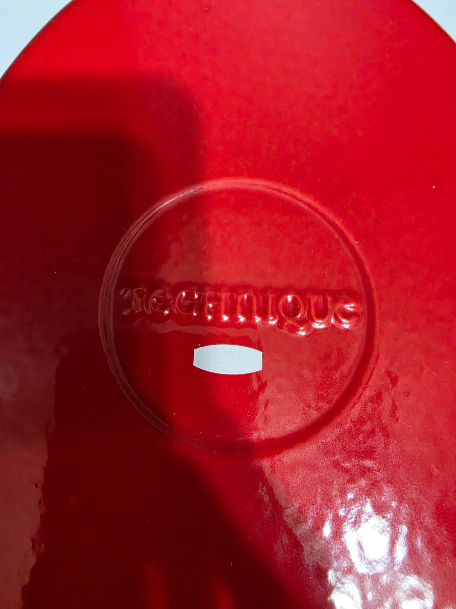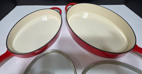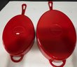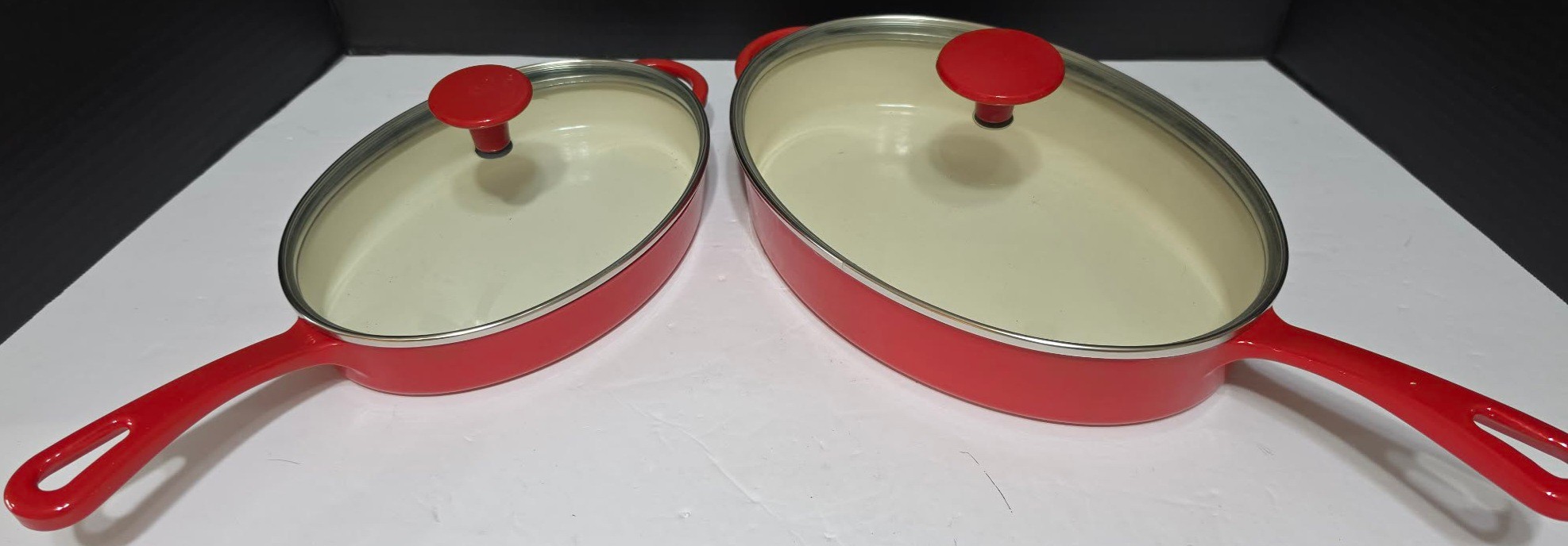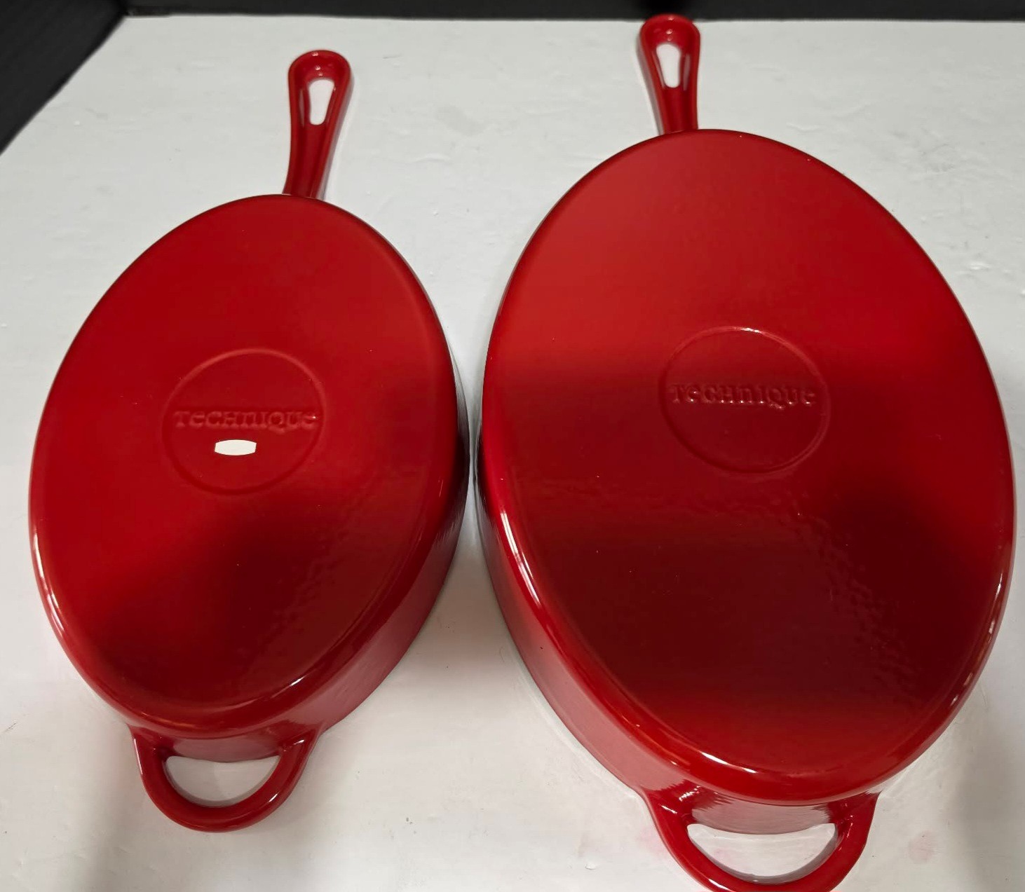 Technique enameled cast iron skillet sets in red. Looks to be unused. Measures 11 x 8 x 2.25 & 9 x 6.25 x 1.75 cooking surface.