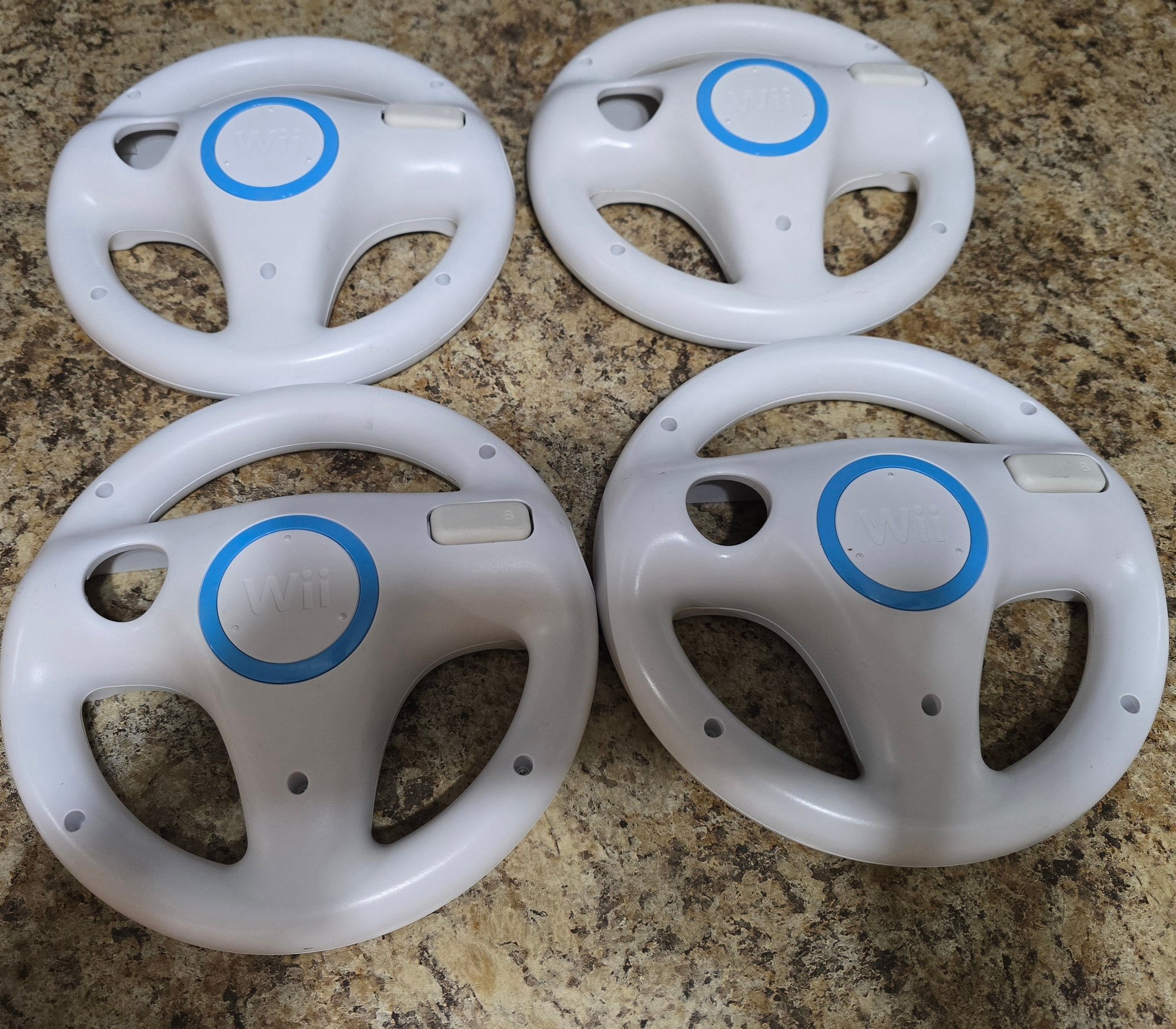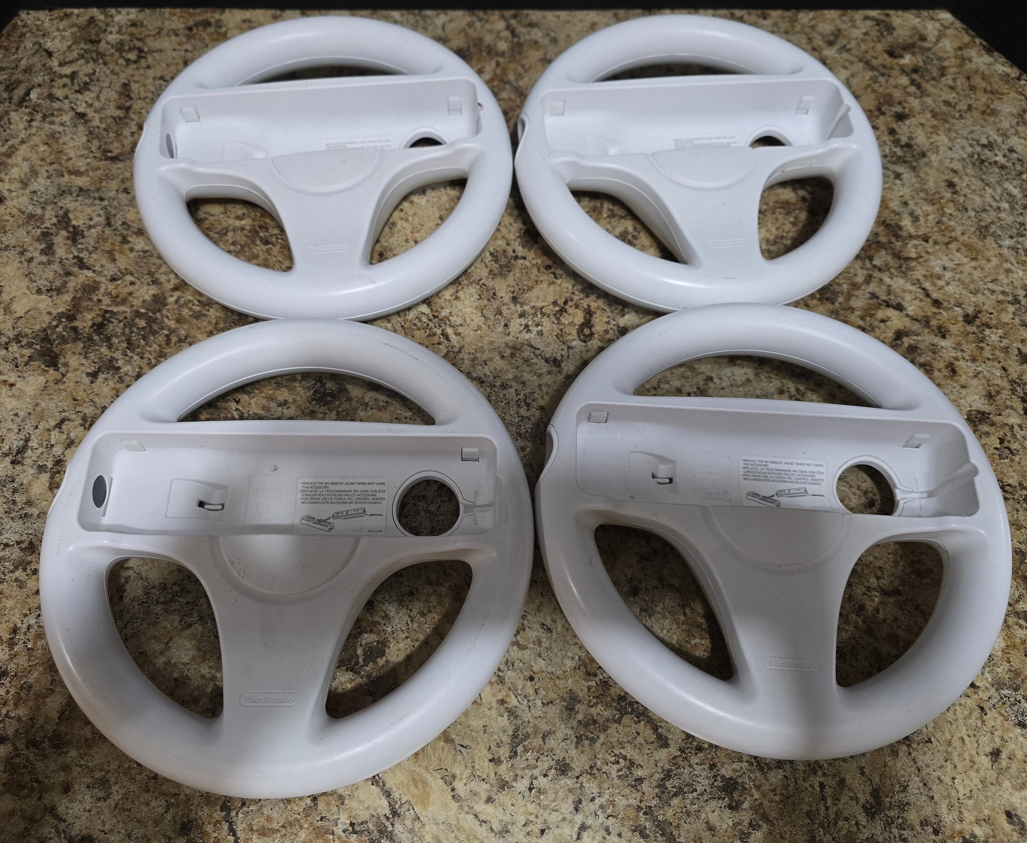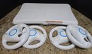 Nintendo Wii balance board and a set of white steering wheels for the Wii Remote. Untested. Comes as pictured only. Please see all pics for details.