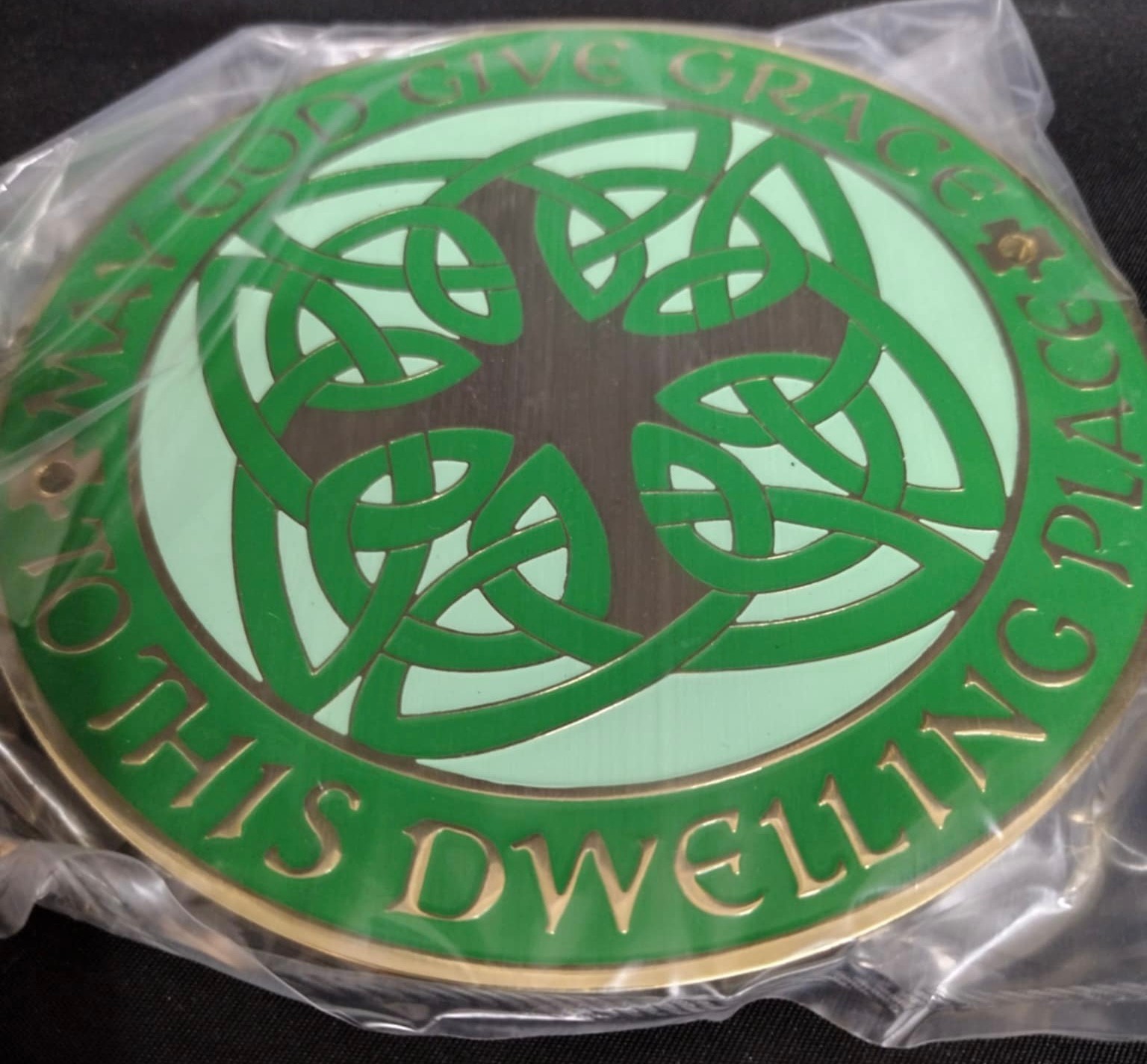Terra Sancta Guild Celtic Home Blessing Door Sign. It is crafted from polished bronze and features green inlaid enamel.