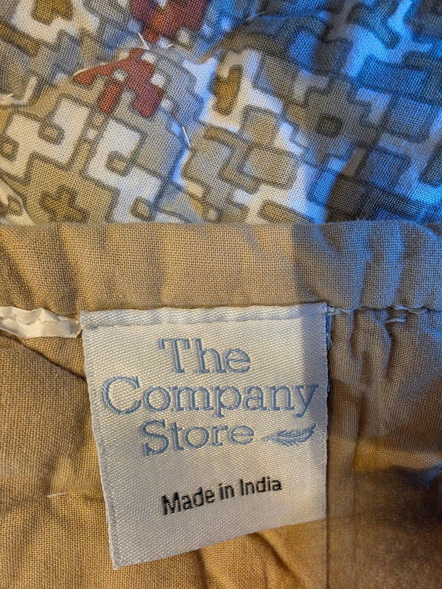 The Company Store southwestern inspired quilt measures approximately102"W x 90"L. Coloration of a reddish brown (cinnamon, burnt umber), grey, tan and white. 100% cotton, reverses to solid tan. Very good pre owned condition.