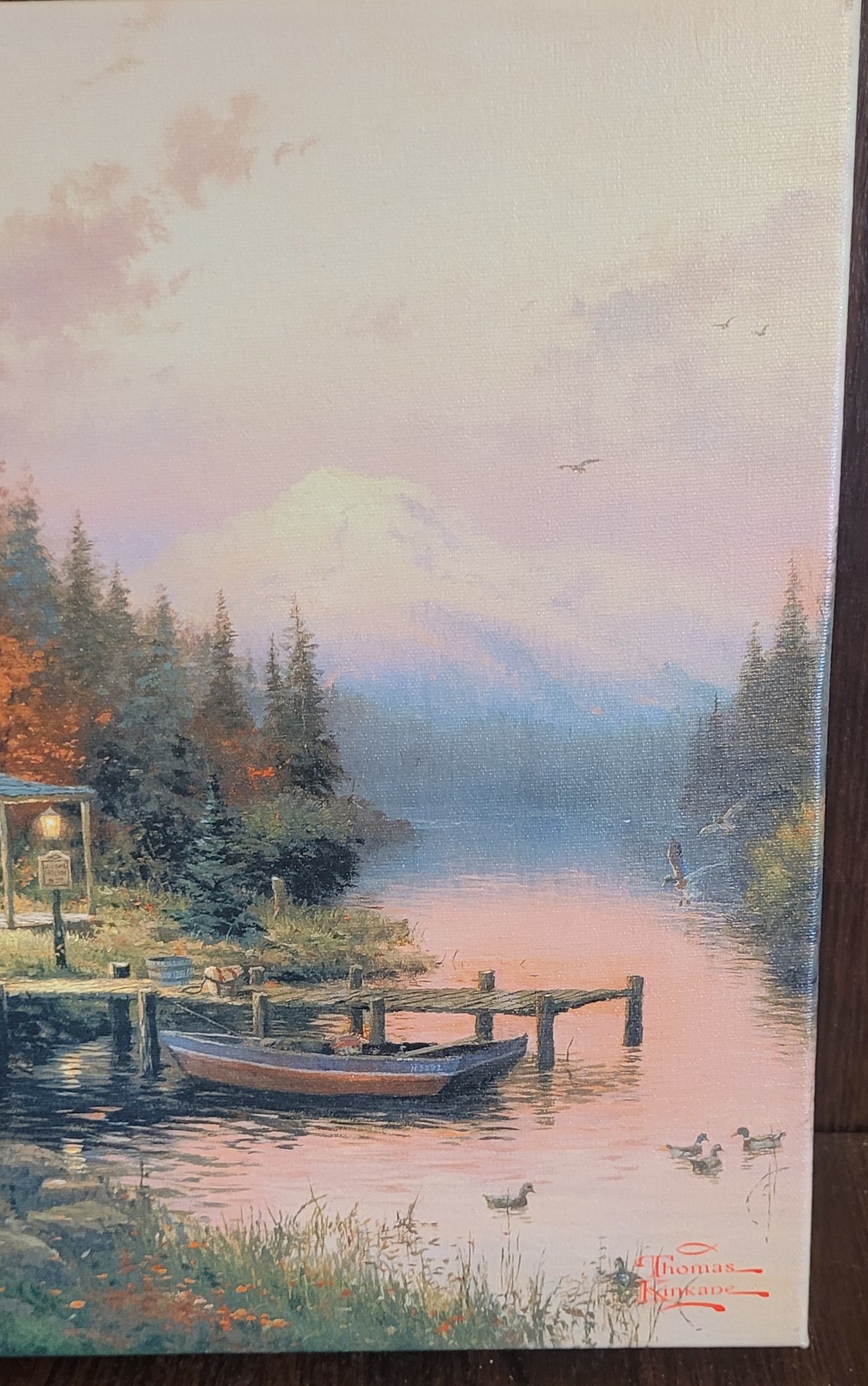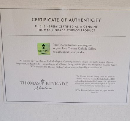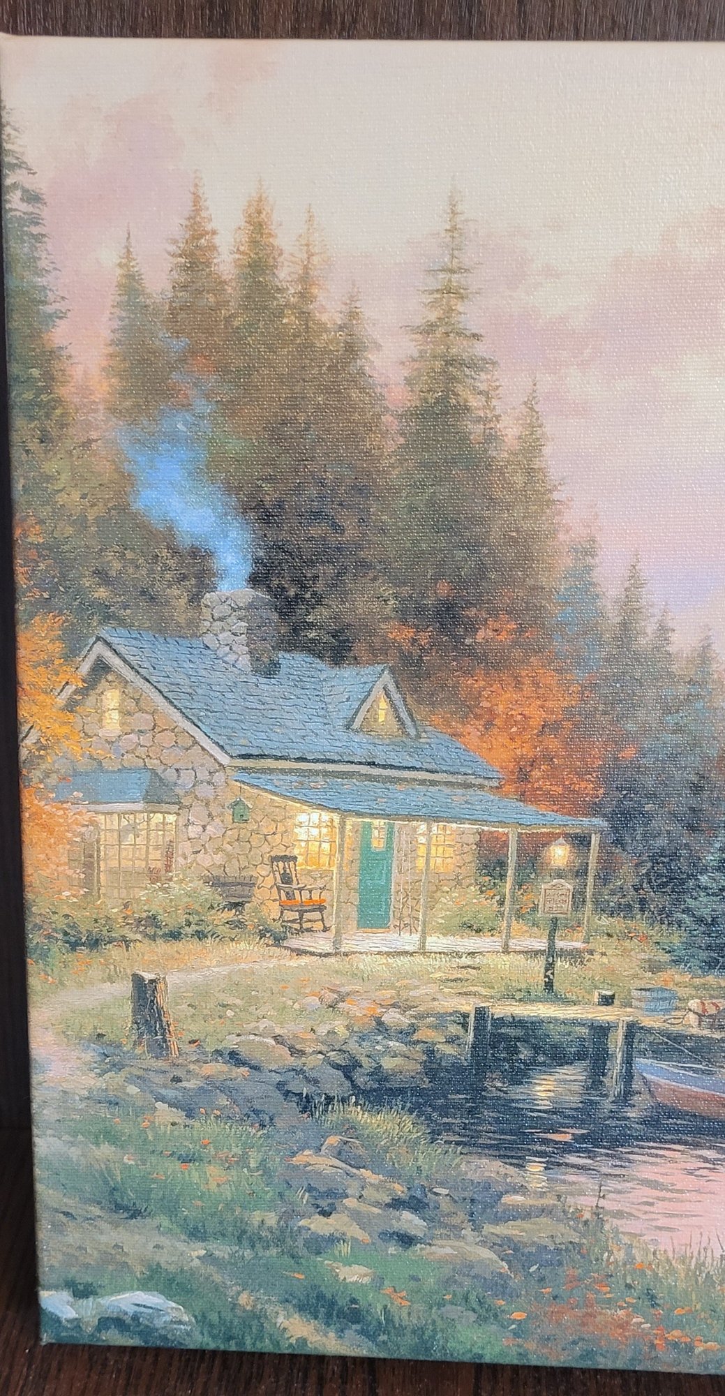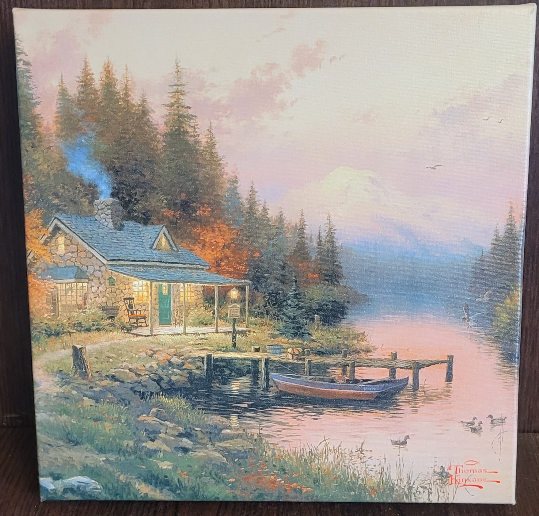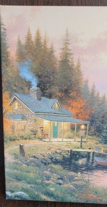 The Thomas Kinkade End of A Perfect Day Wrapped Canvas is a medium-sized landscape print of a Lake House, featuring the artist's unique style and signature. Handmade in California, USA, this unframed canvas comes with a Certificate of Authenticity, making it a valuable addition to any art collection. This contemporary piece captures the beauty of nature and art, perfect for adding a touch of inspiration to any space.