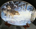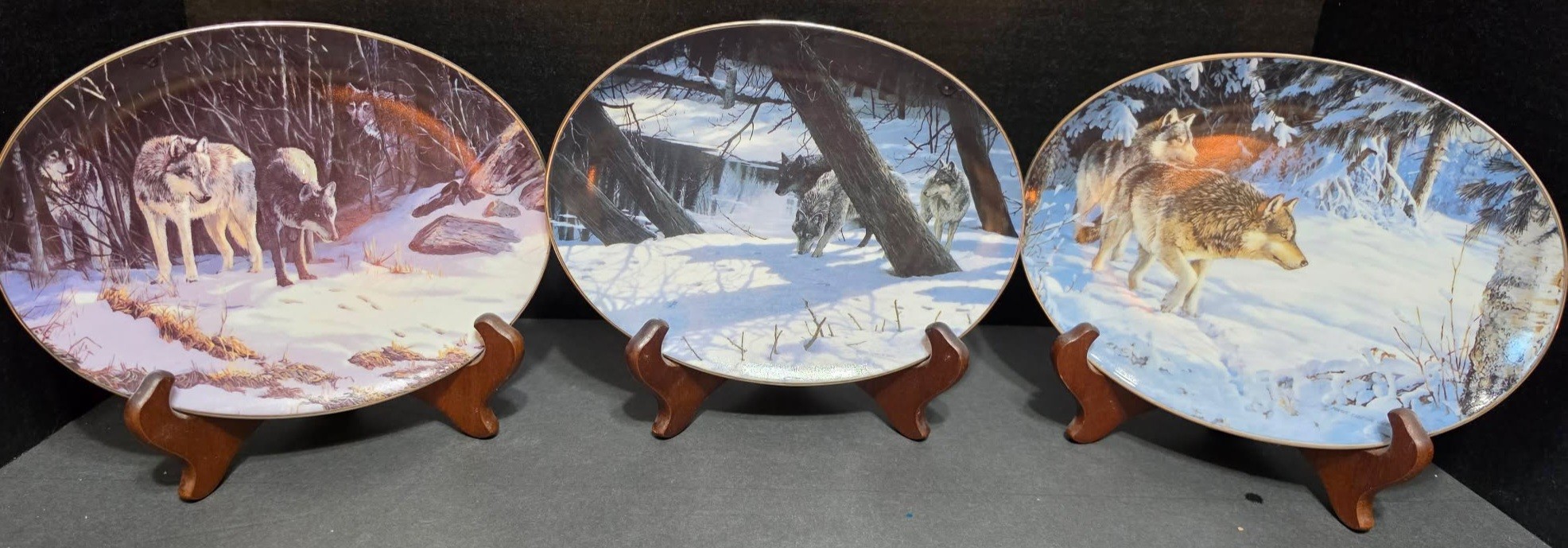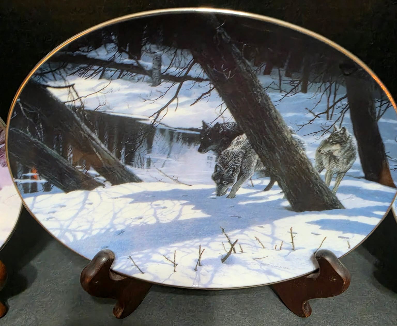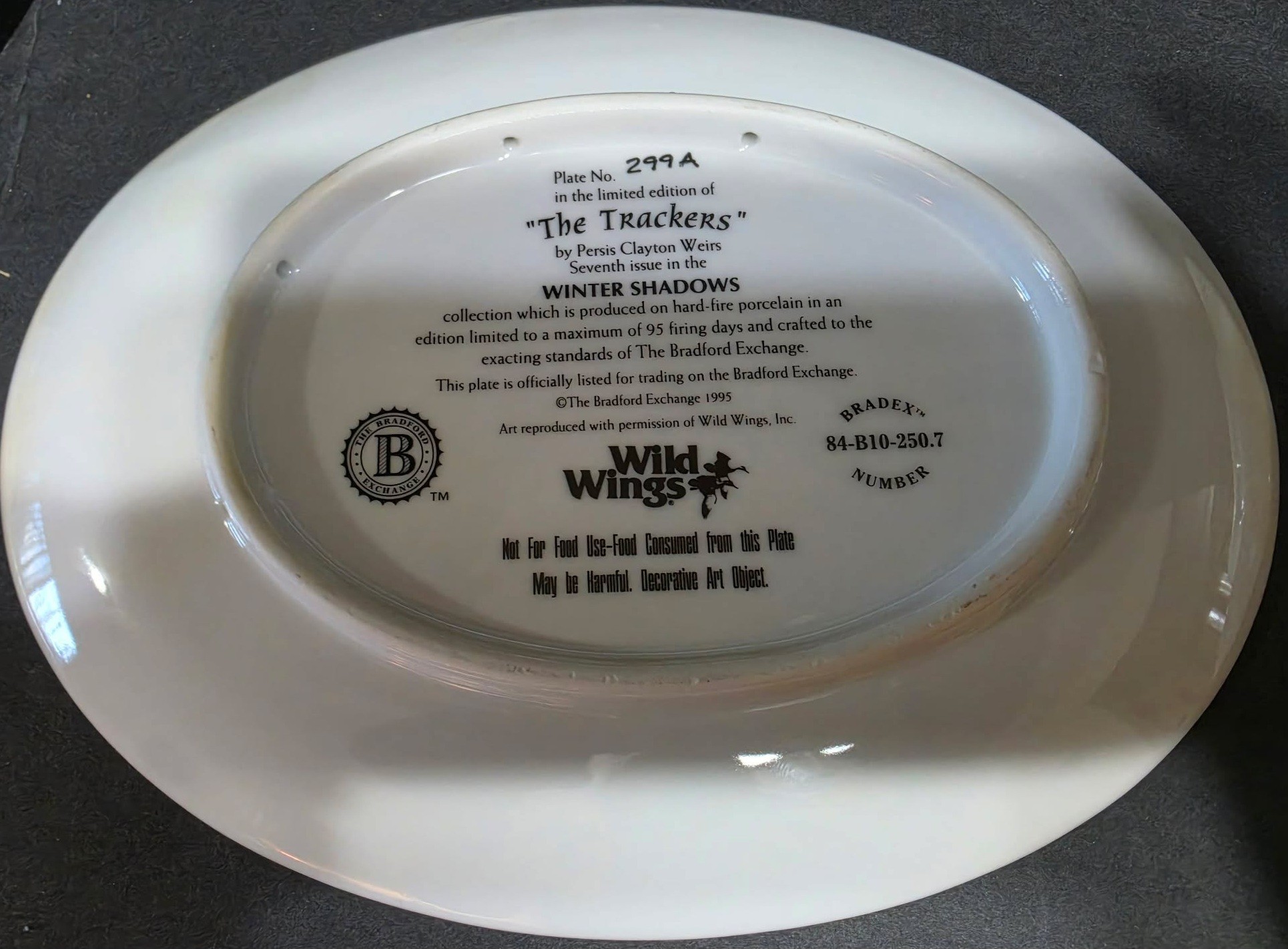 Three oval collector plates from "The Trackers" series within the "Winter Shadows" collection by The Bradford Exchange. With stands. Measures 8.75 x 7.
