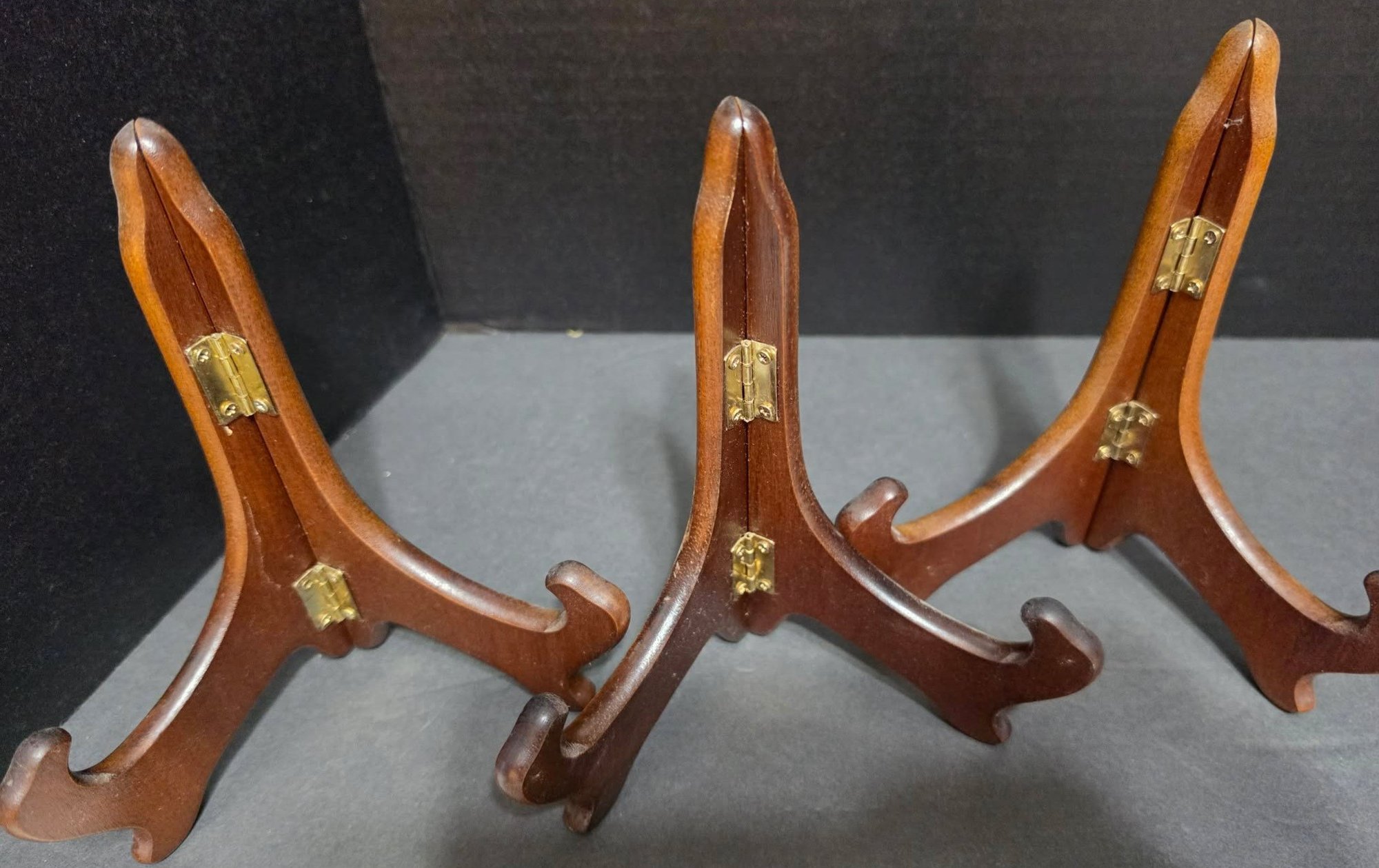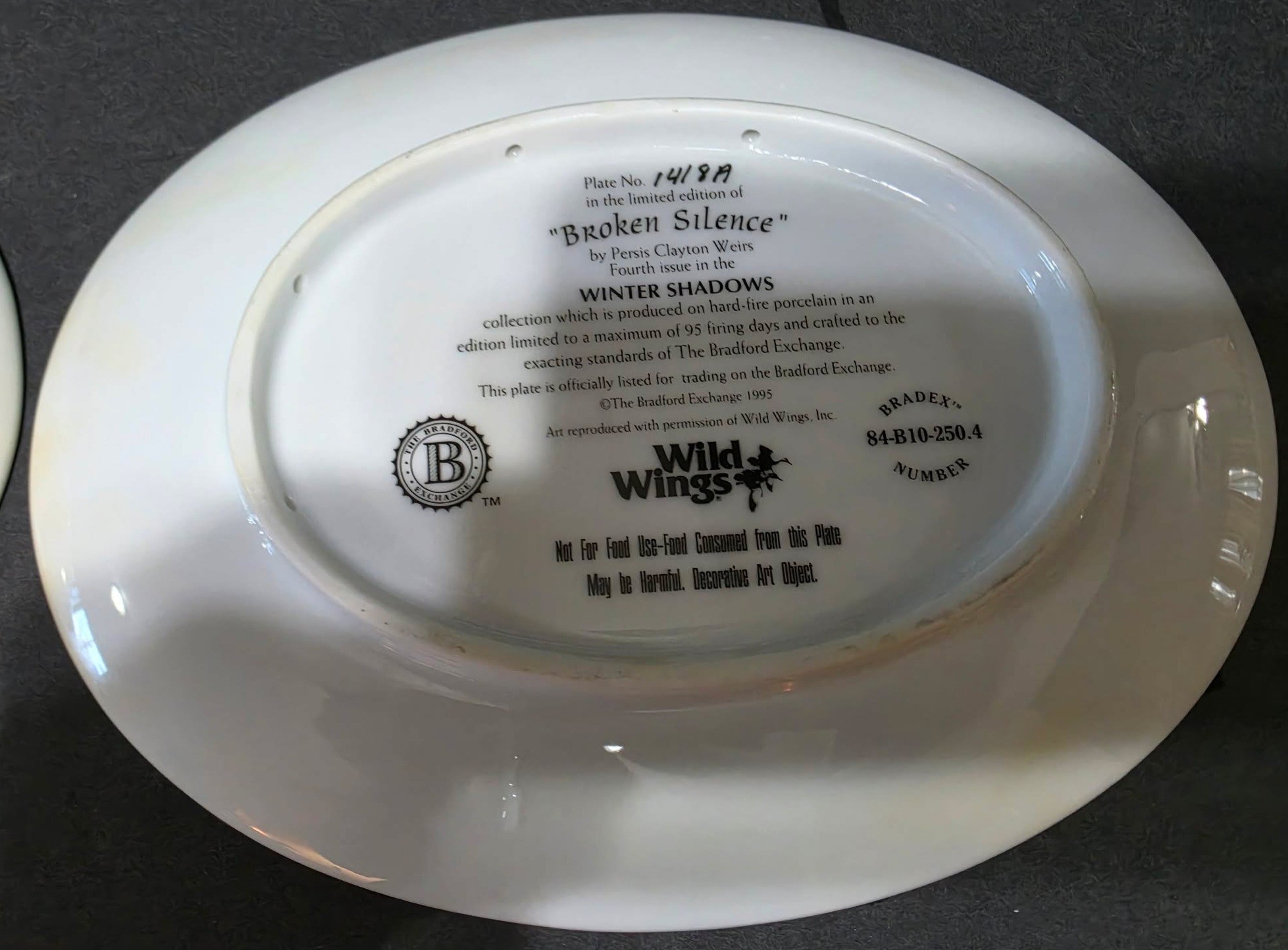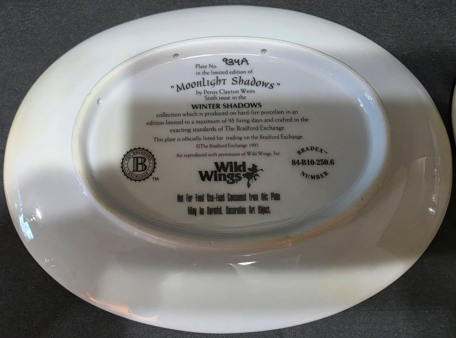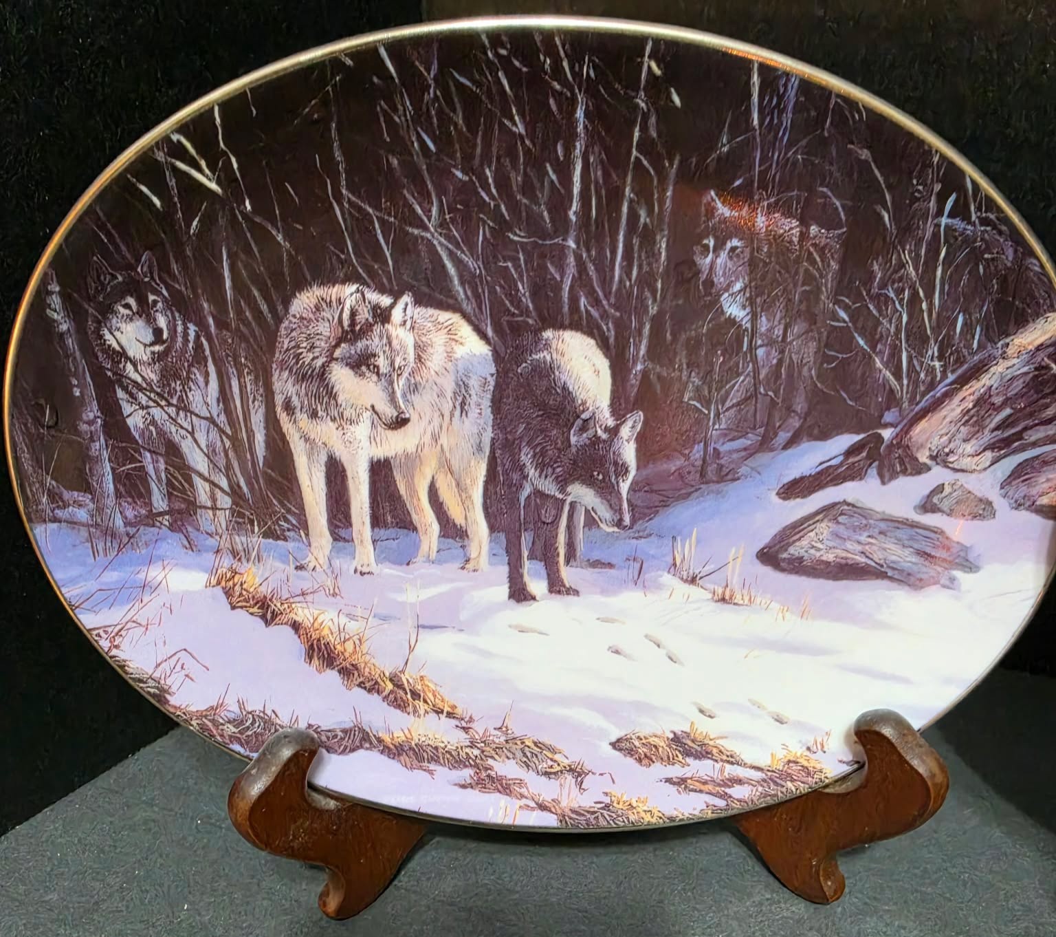 Three oval collector plates from "The Trackers" series within the "Winter Shadows" collection by The Bradford Exchange. With stands. Measures 8.75 x 7.