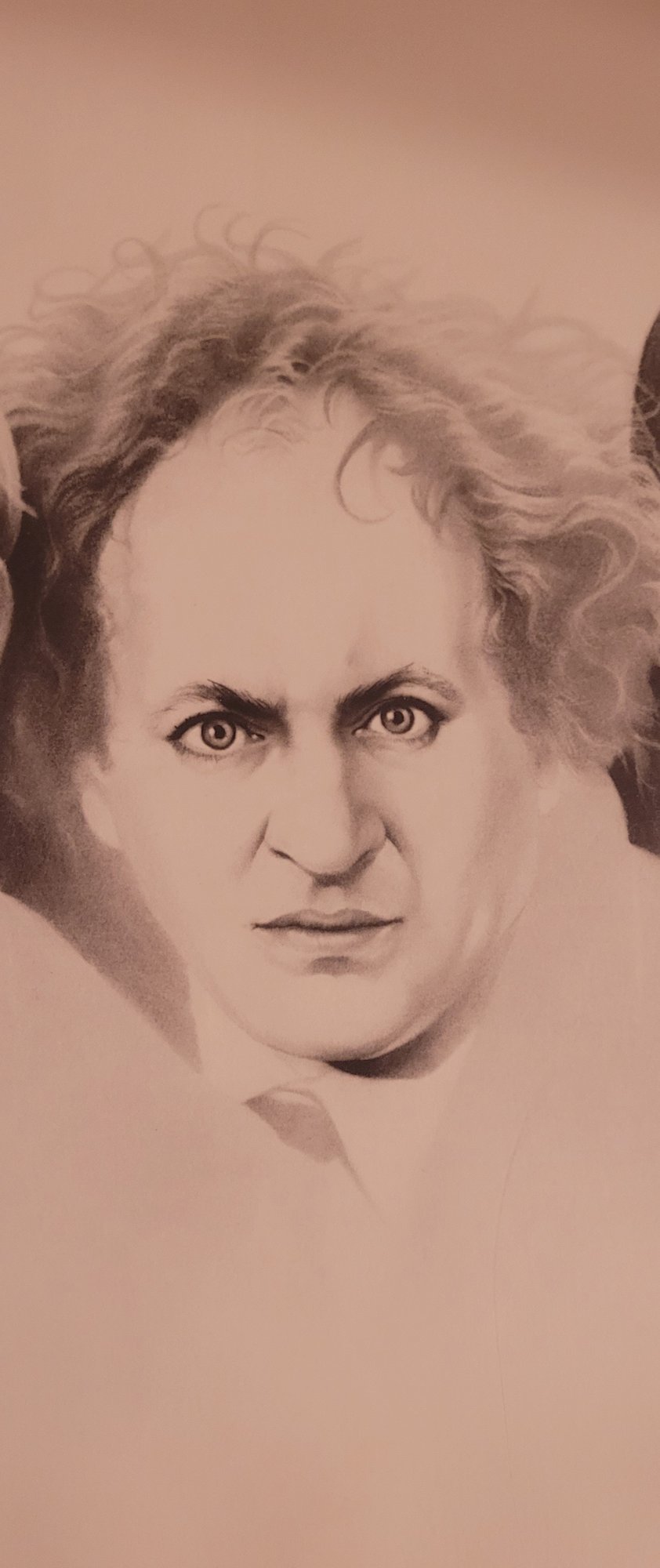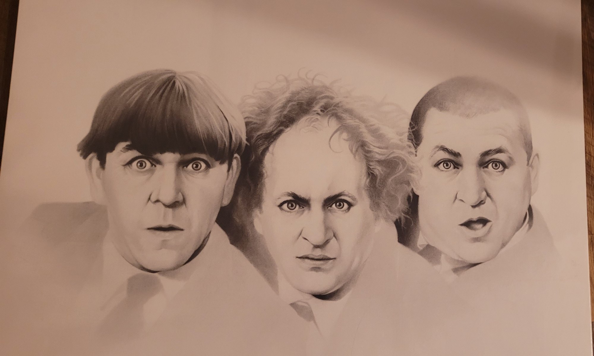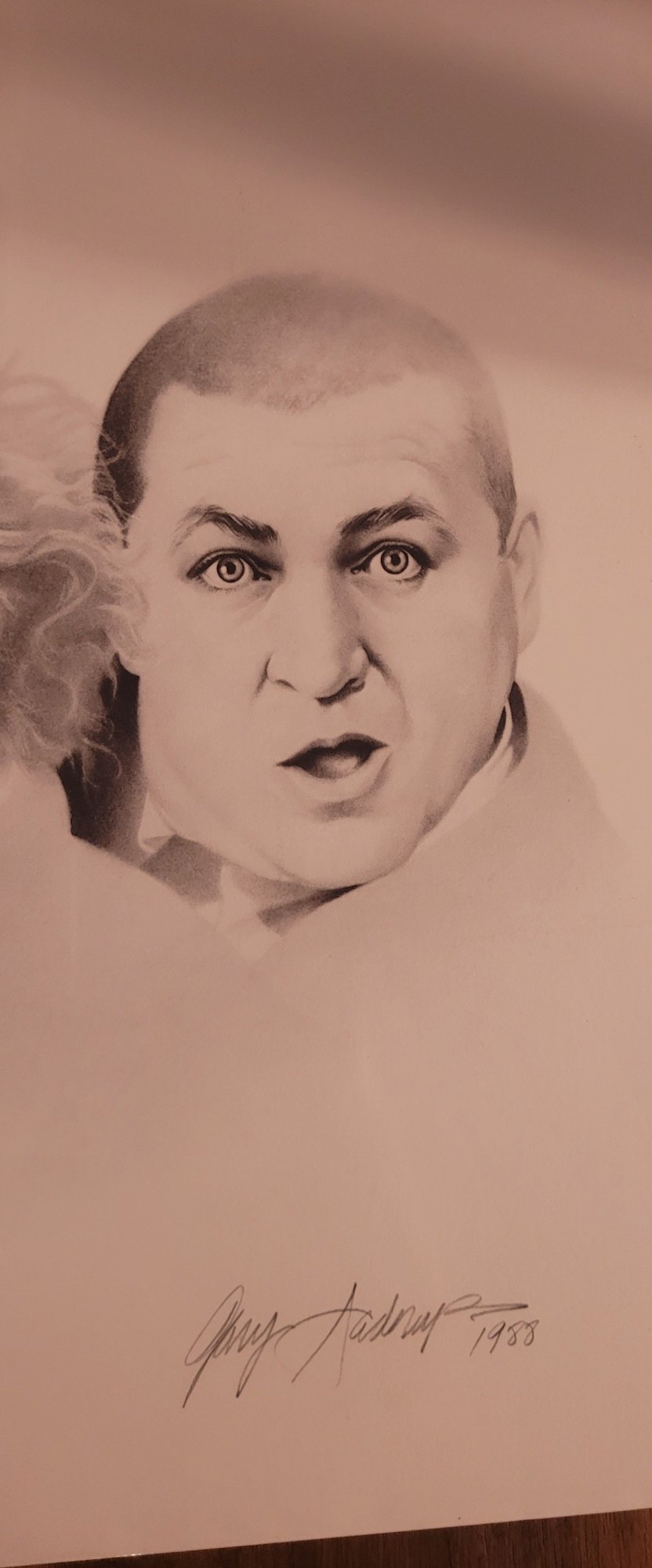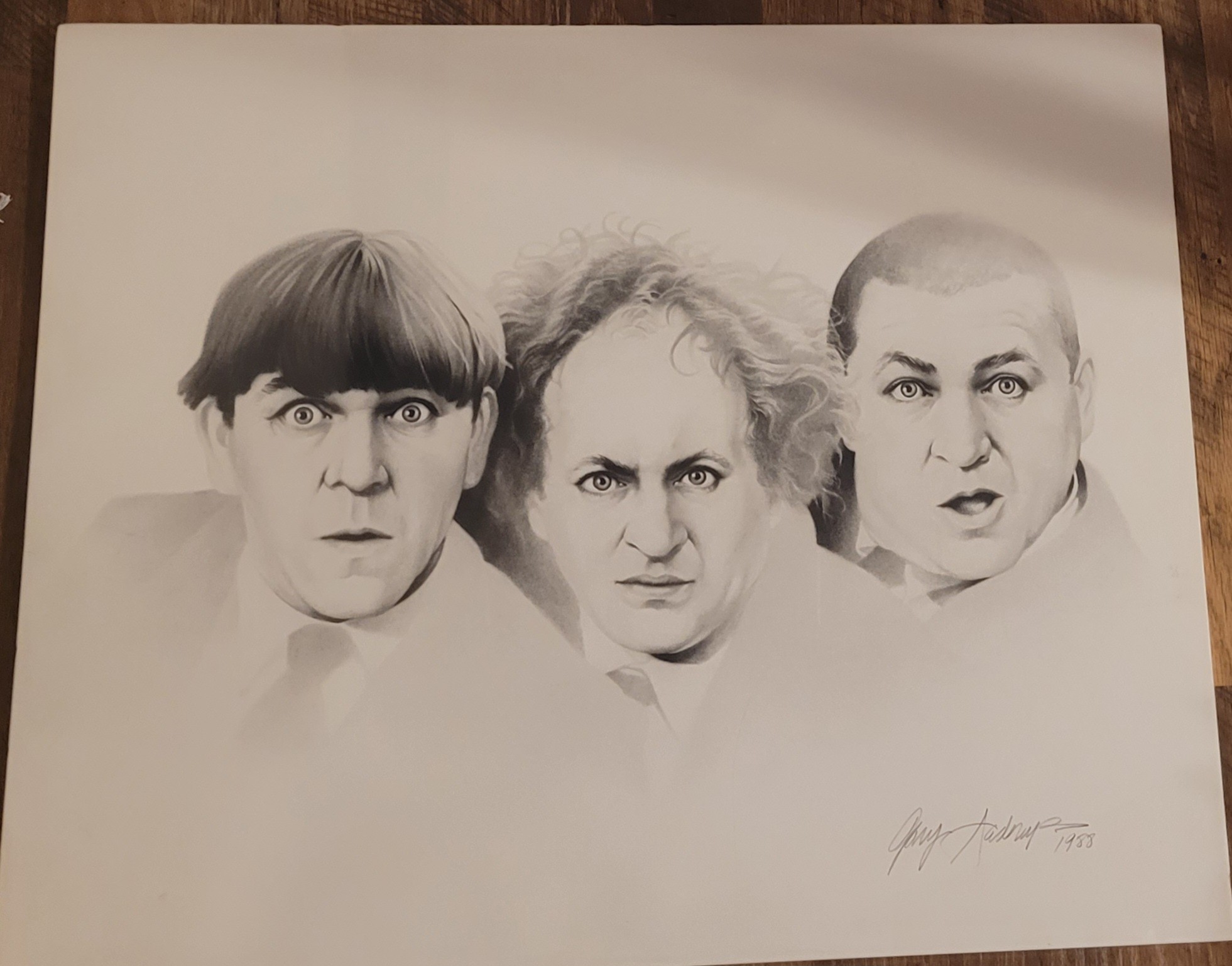 The Three Stooges 20x24 lithograph poster by Gary Saderup is a collectible piece featuring the iconic comedic trio. Created in 1988 in the United States, this artist's rendering captures the charm and humor of the classic TV show. Perfect for fans of vintage Disneyana and collectors of contemporary posters and prints, this piece is a nostalgic tribute to a beloved era in entertainment.