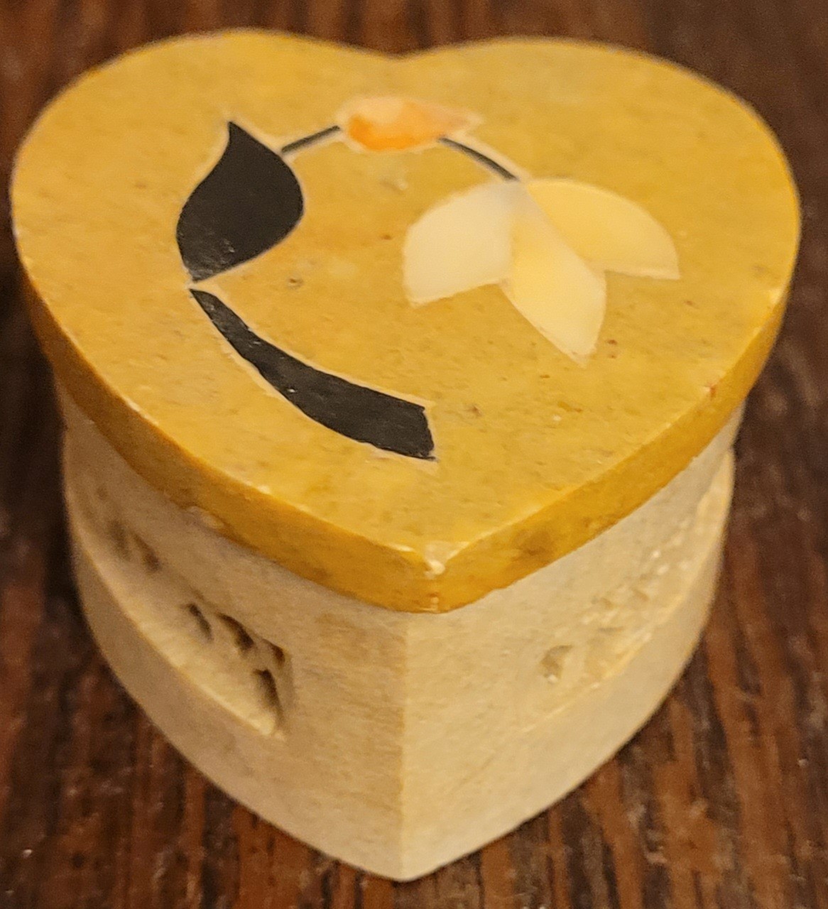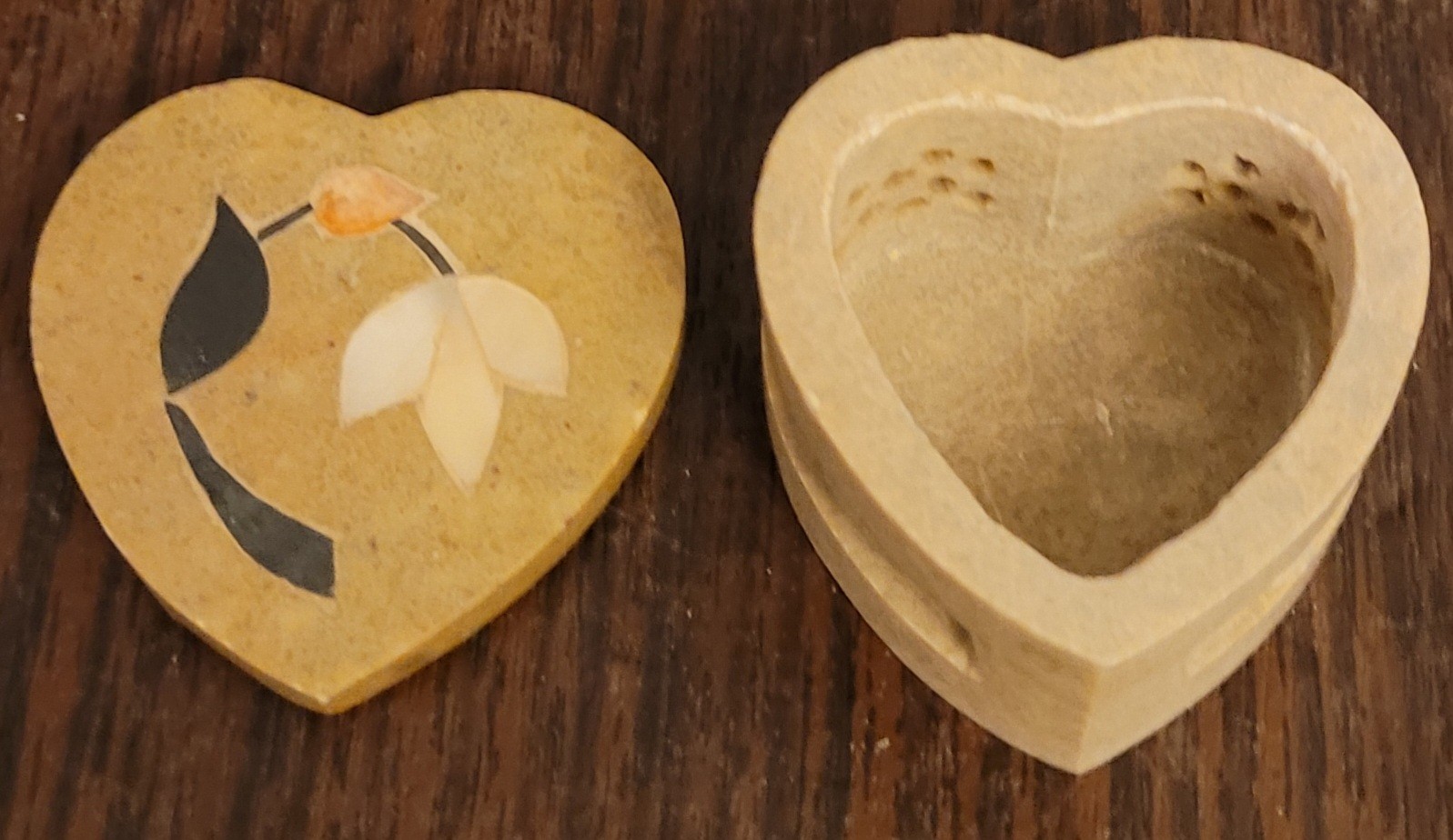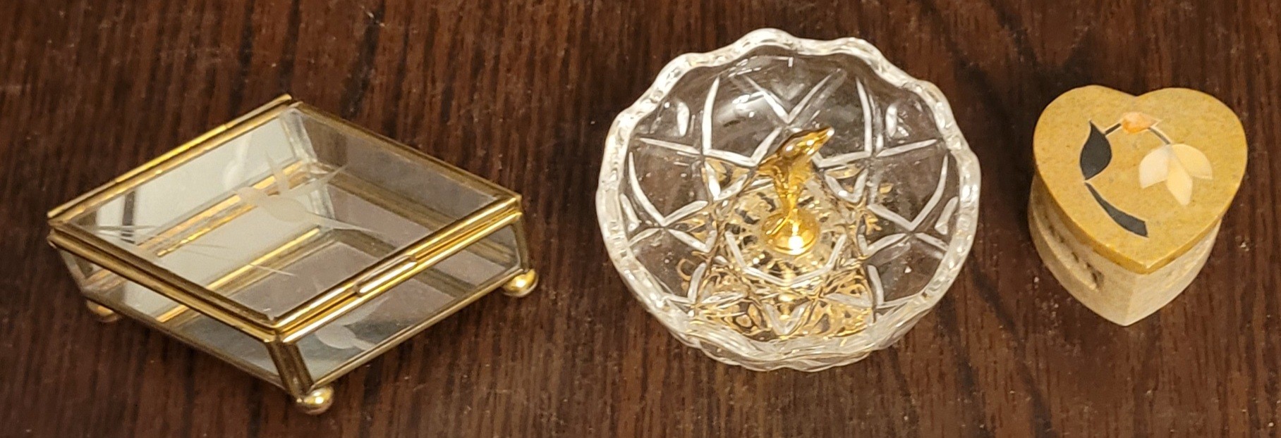 The ring holder measures 5" tall, the heart trinket box measures 1.875" long by 1.125" tall and the last one measures 1.5" tall by 4.125" long. See pictures for details.