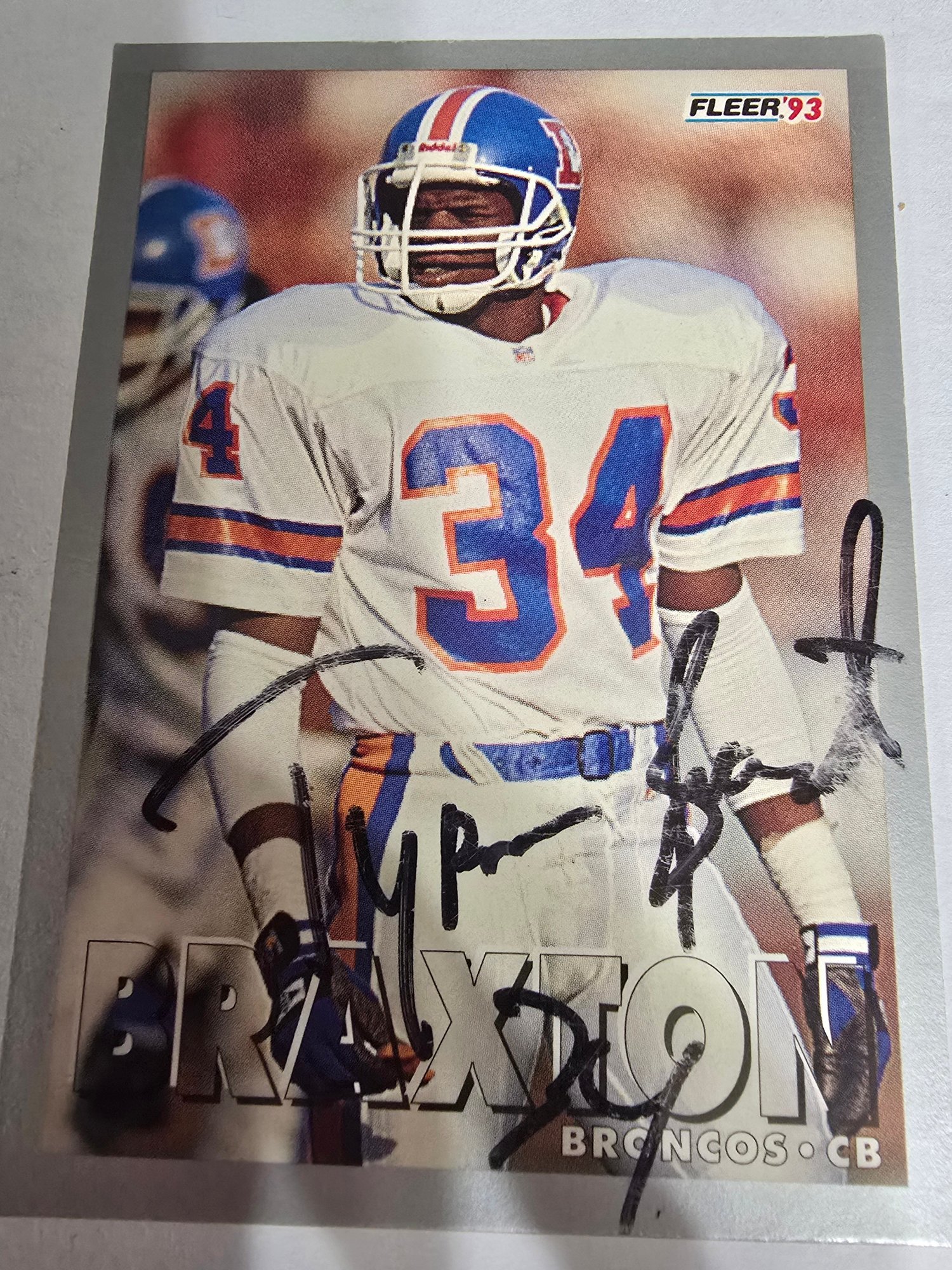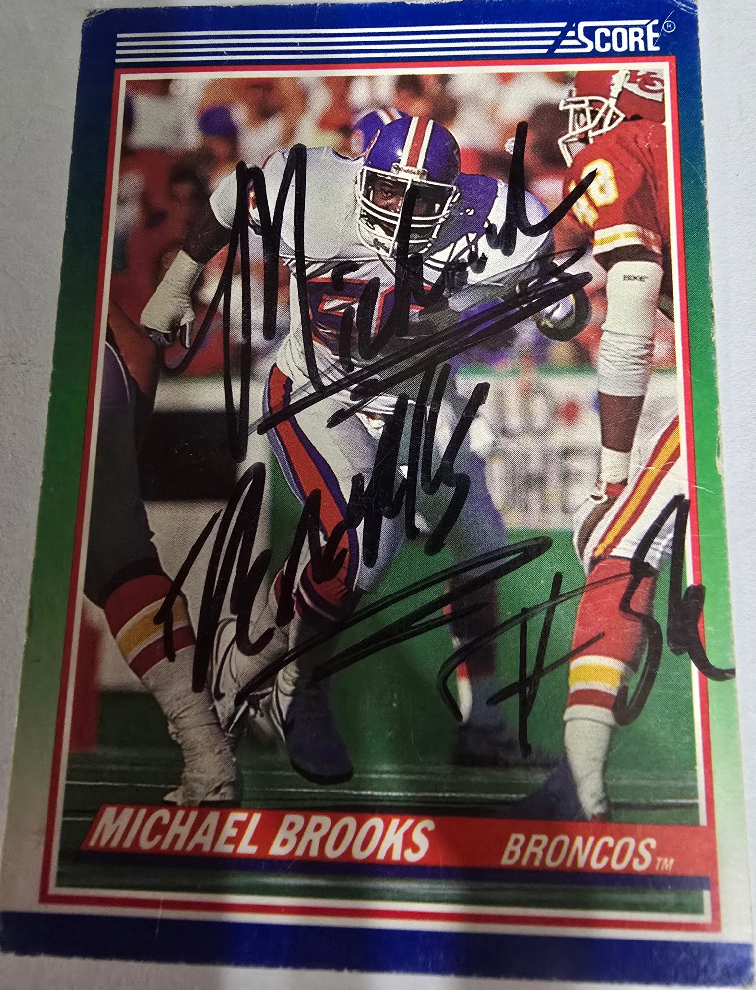Two autographed Denver Broncos football cards featuring Michael Brooks from 1990 Score and Tyrone Braxton from 1993 Fleer. Please see all pics for details.