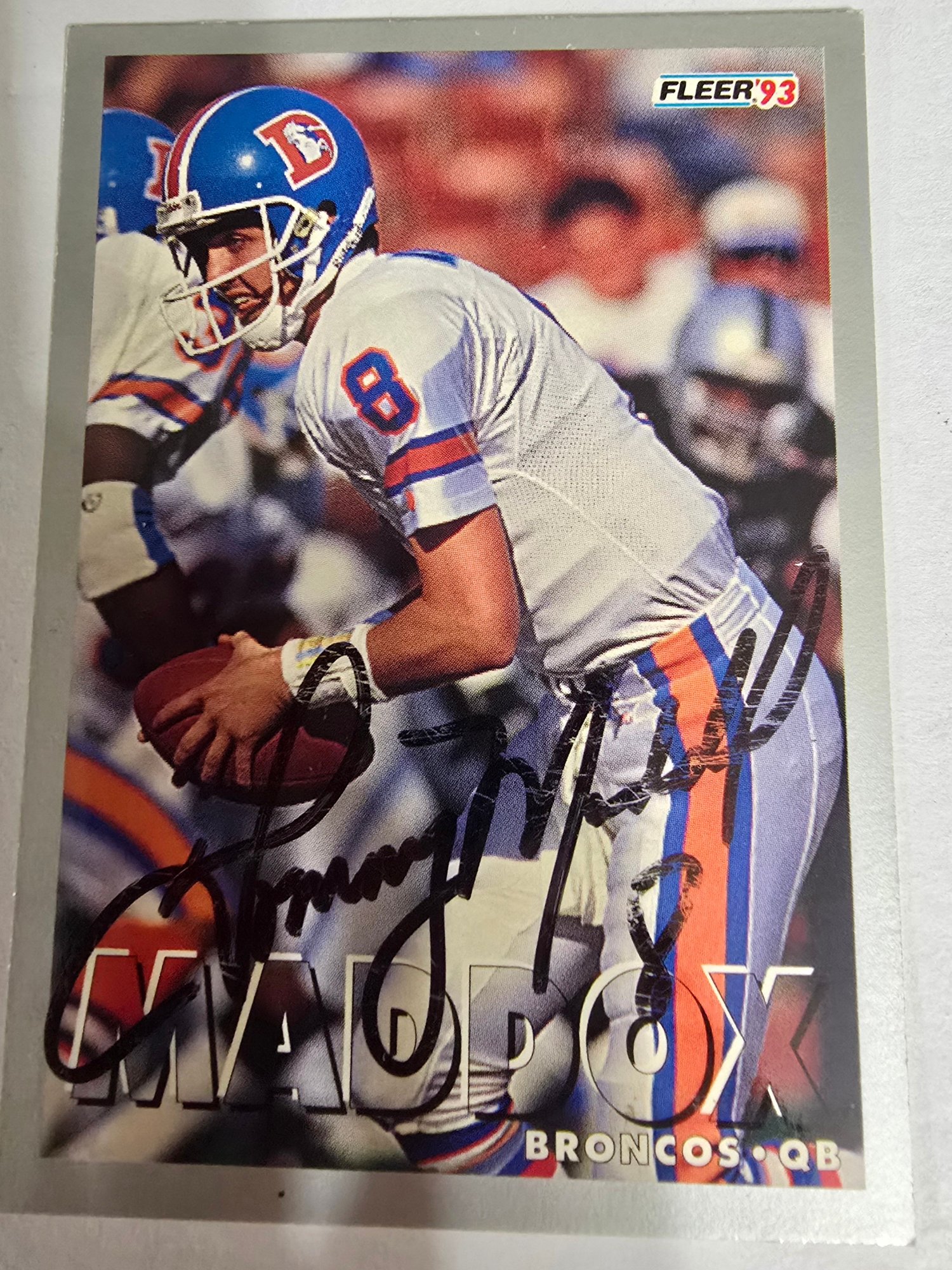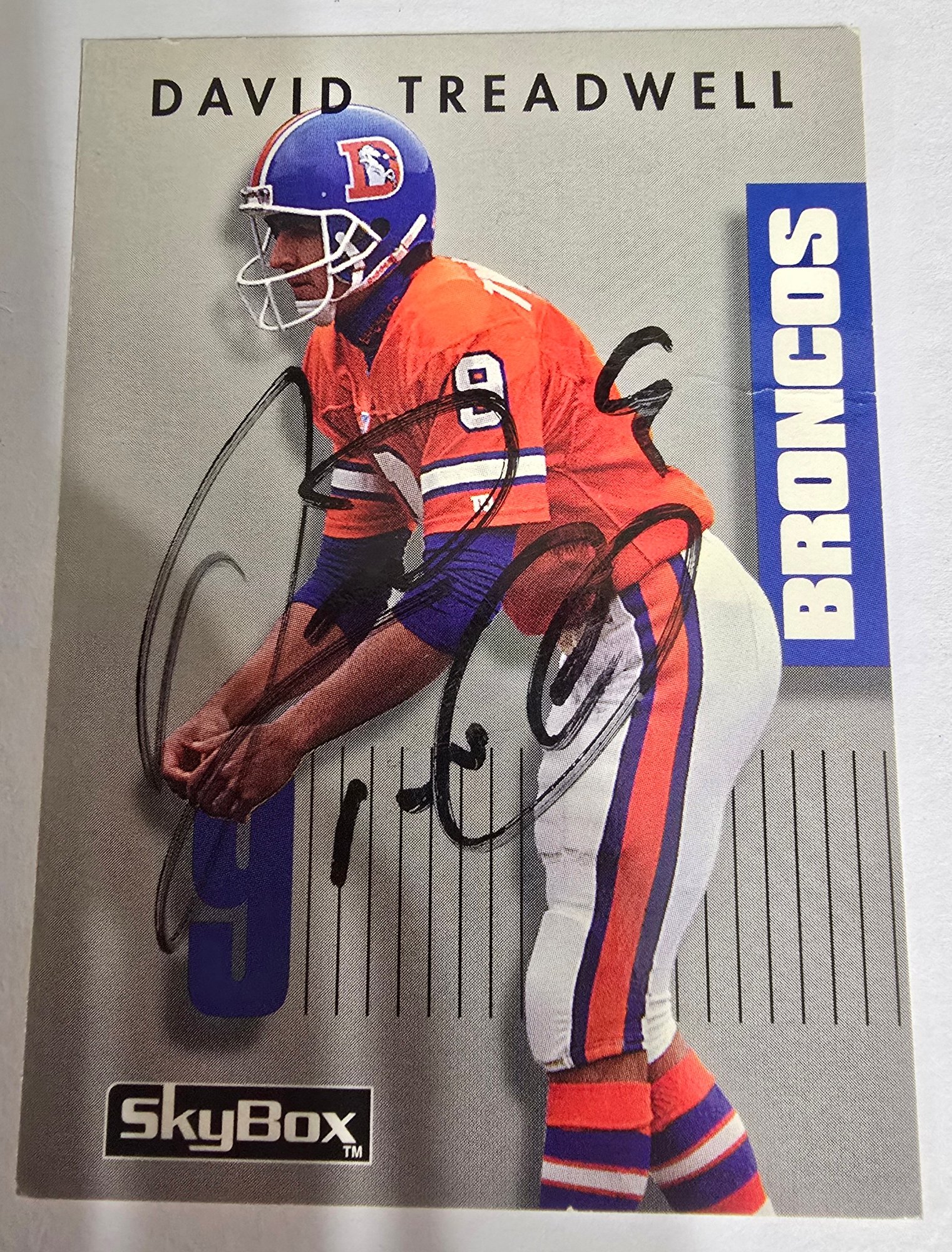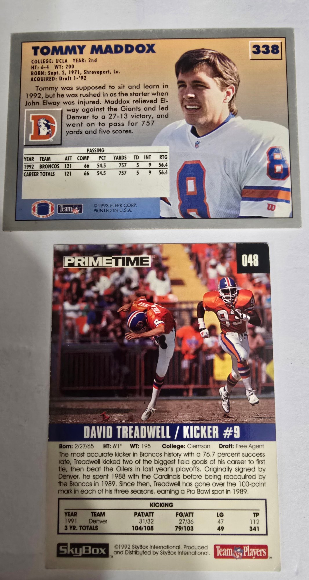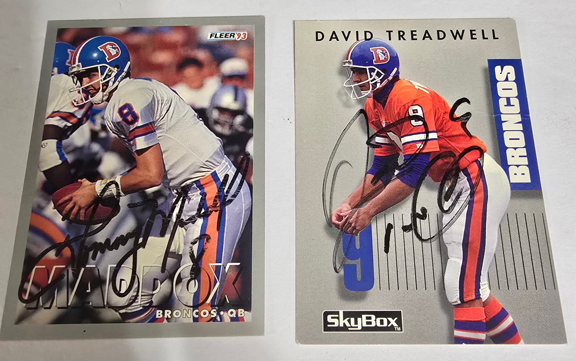 Two vintage NFL trading cards featuring players from the Denver Broncos, specifically a 1993 Fleer card and a SkyBox card featuring David Treadwell, both showing signature markings. Please see all pics for details.