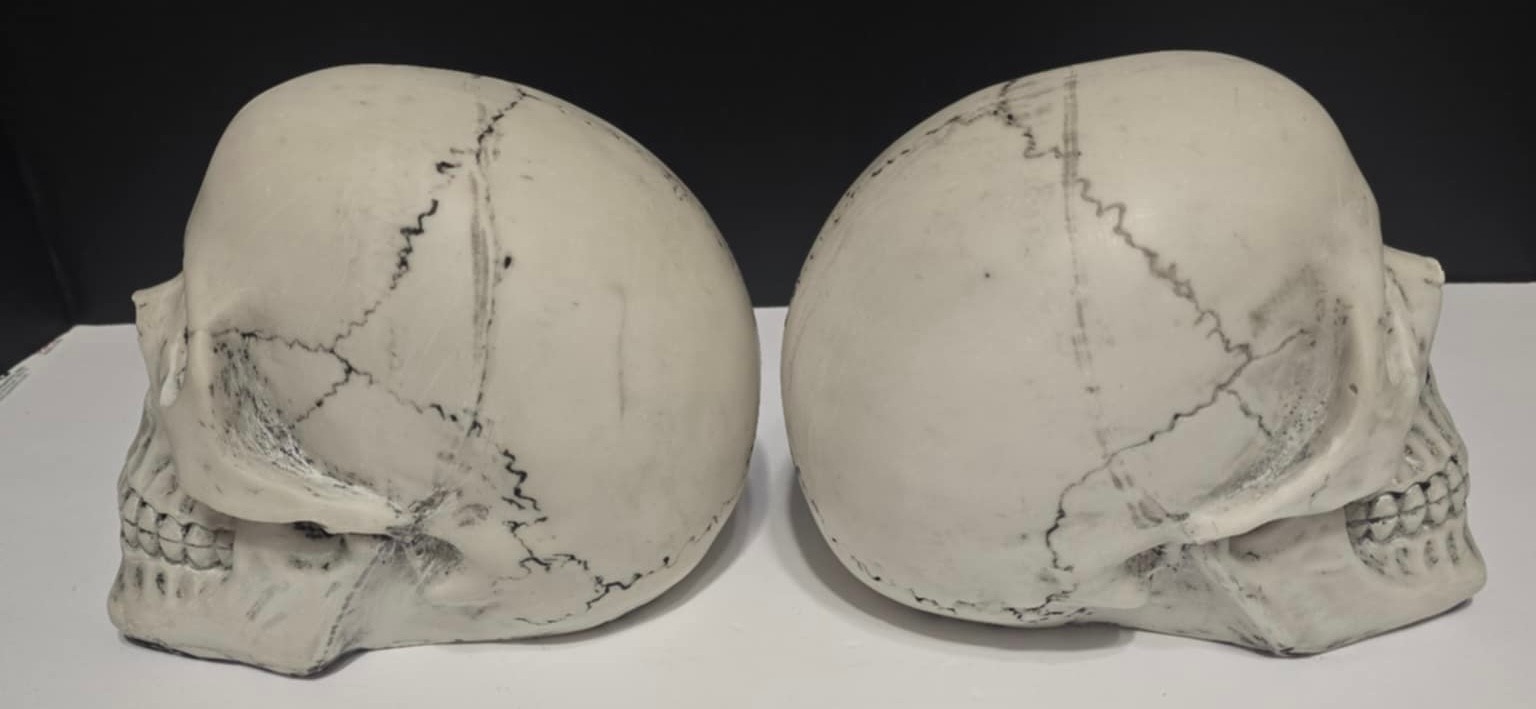Two decorative human skull replicas measures 3.5 x 6 x 4.75. Made of Resin.