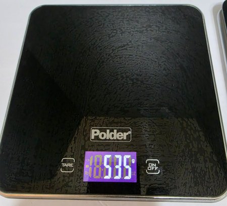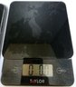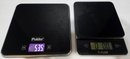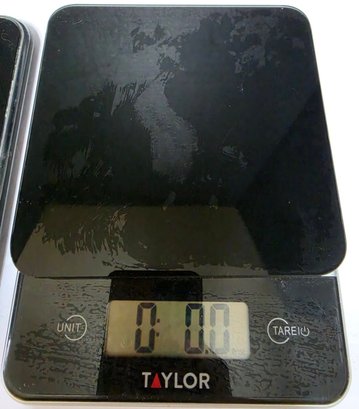 Two digital kitchen scales: a top Polder Slimmer Digital Kitchen Scale in black and a bottom Taylor Digital Kitchen Glass Top 11lb Food Scale. Both tested and work.