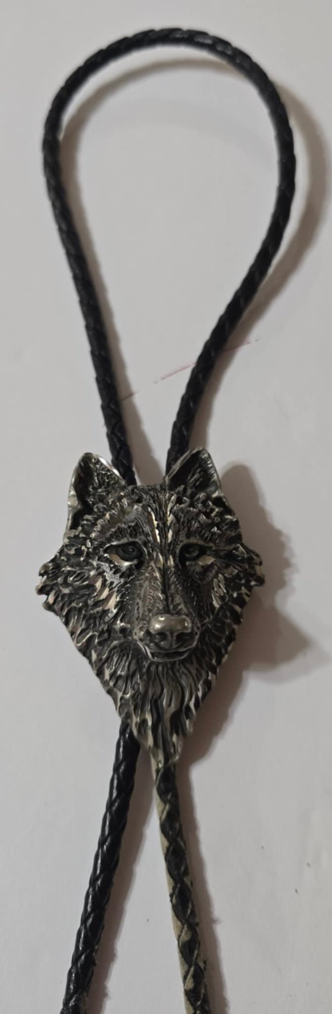 Unbranded metal and black braided leather bolo ties with wolf and arrowhead designs. Braided leather is worn on both are 18".