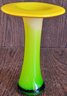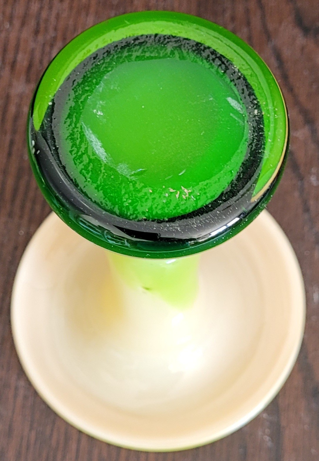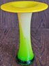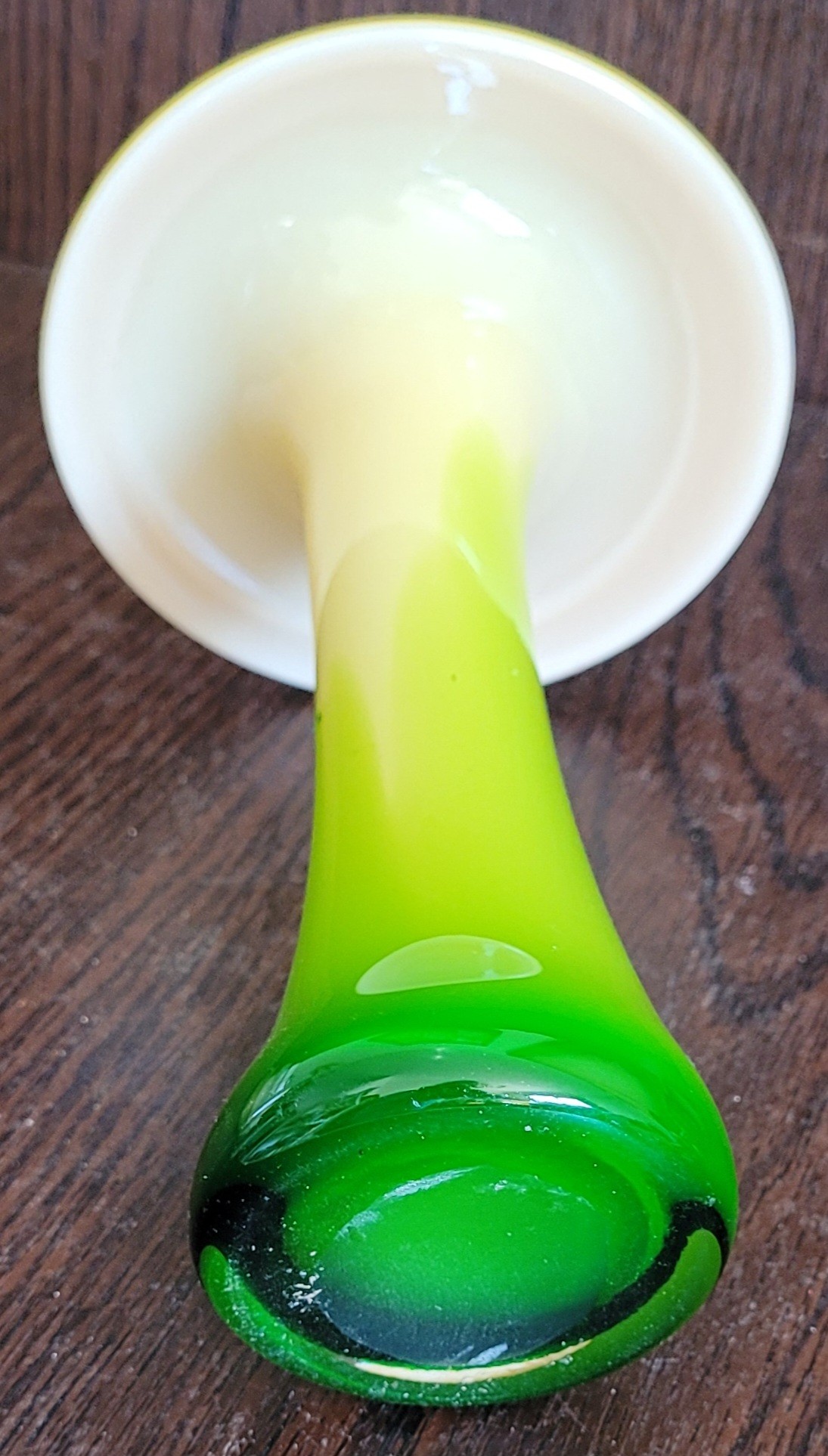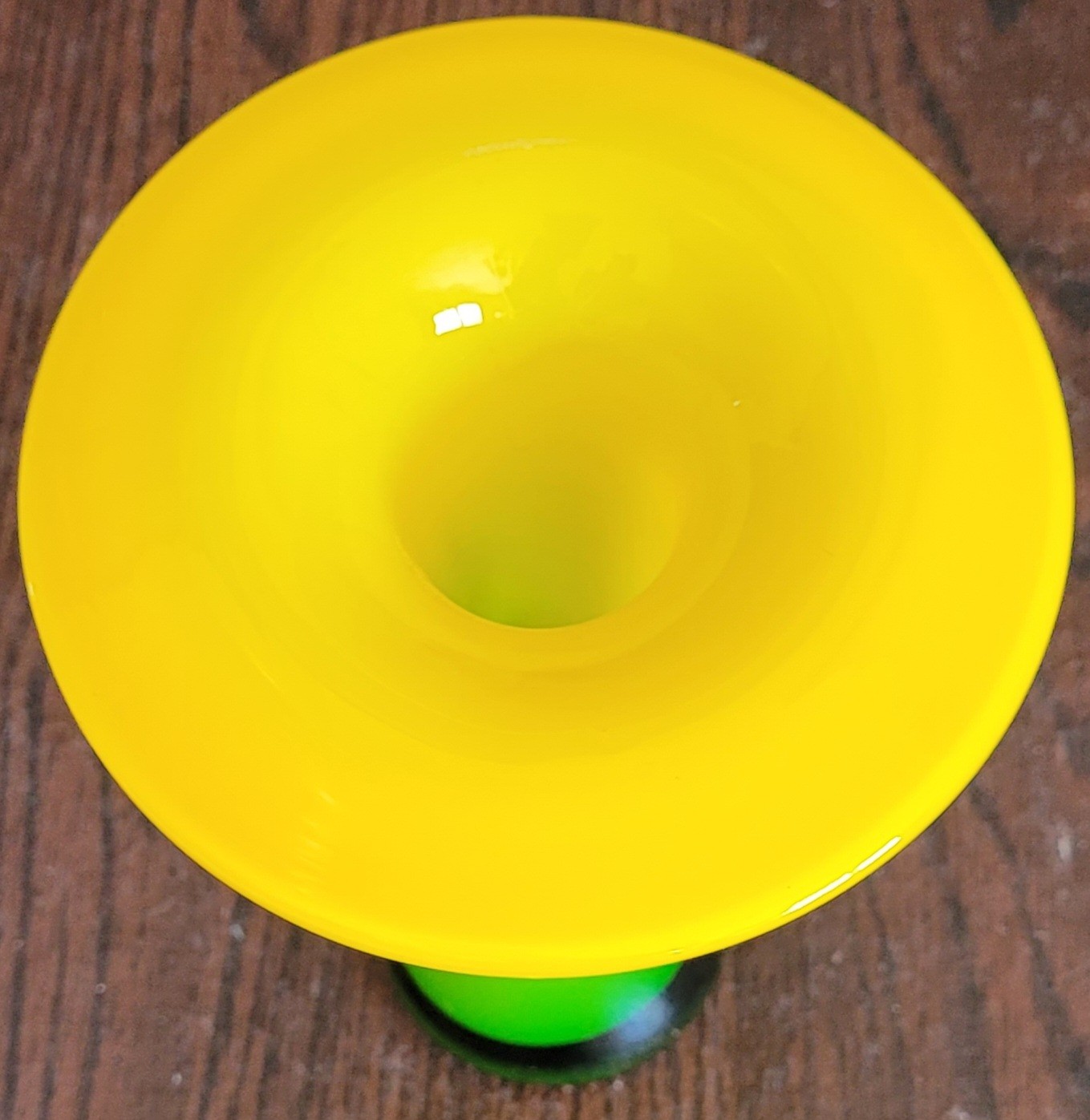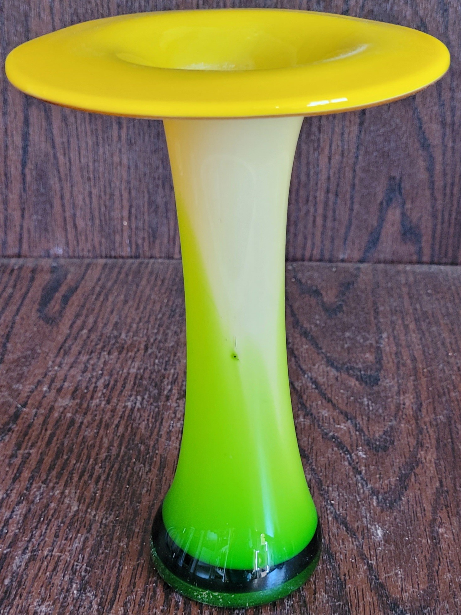 Discover a touch of retro charm with this Vintage Hand Blown Pop Art Swirl Vase. The vibrant interplay of green and yellow hues creates an eye-catching spectacle, perfect for adding a splash of color to any room. At 7.5 inches tall, its flat rim design is ideal for displaying floral arrangements or standing alone as a statement piece. Crafted with meticulous care, this unmarked glass vase is a testament to the timeless allure of art glass. Its swirl pattern and handcrafted technique reflect a production style that celebrates individuality and artistic expression. Whether it's a focal point in your living space or a thoughtful gift, this vase embodies the essence of vintage elegance.