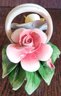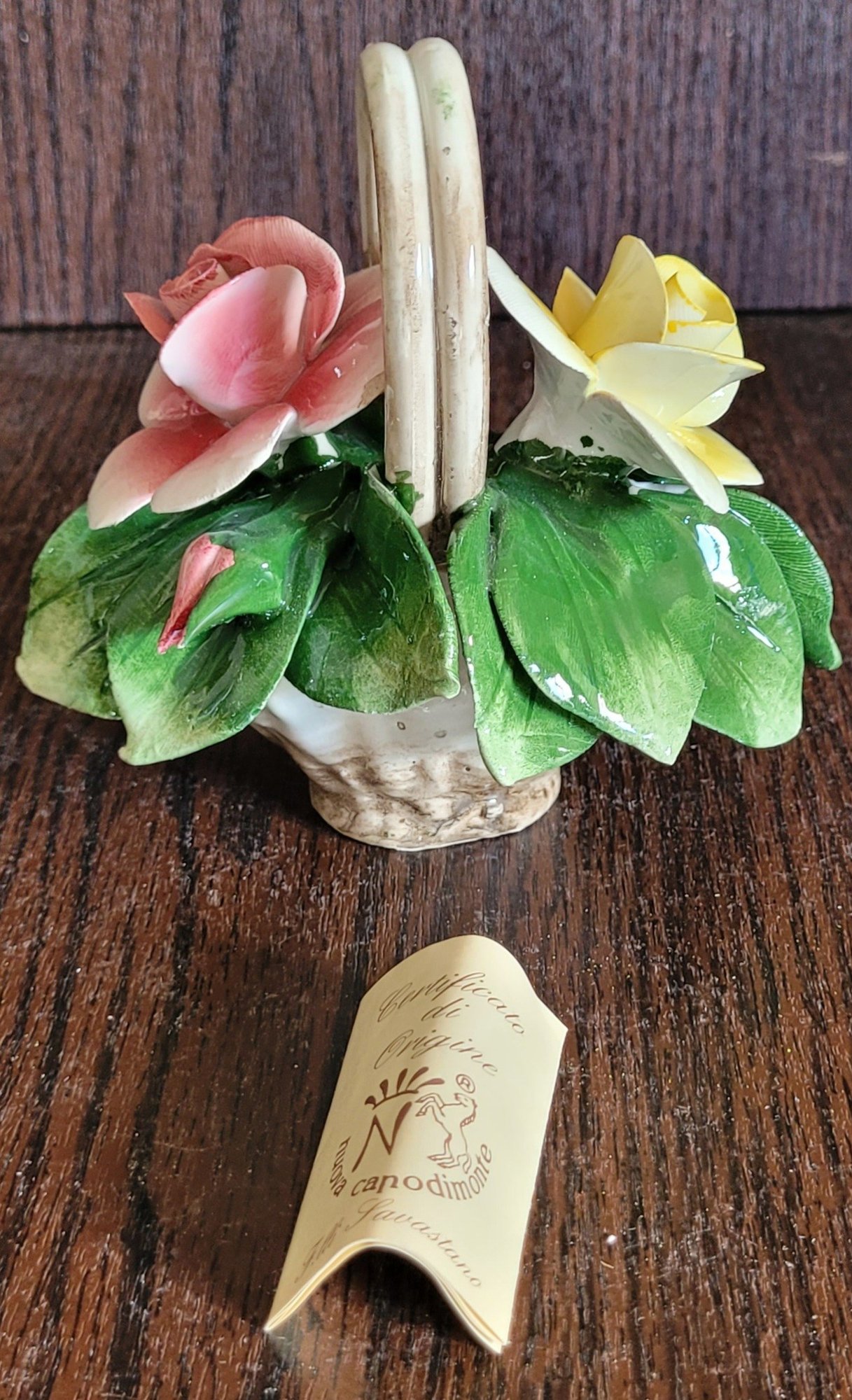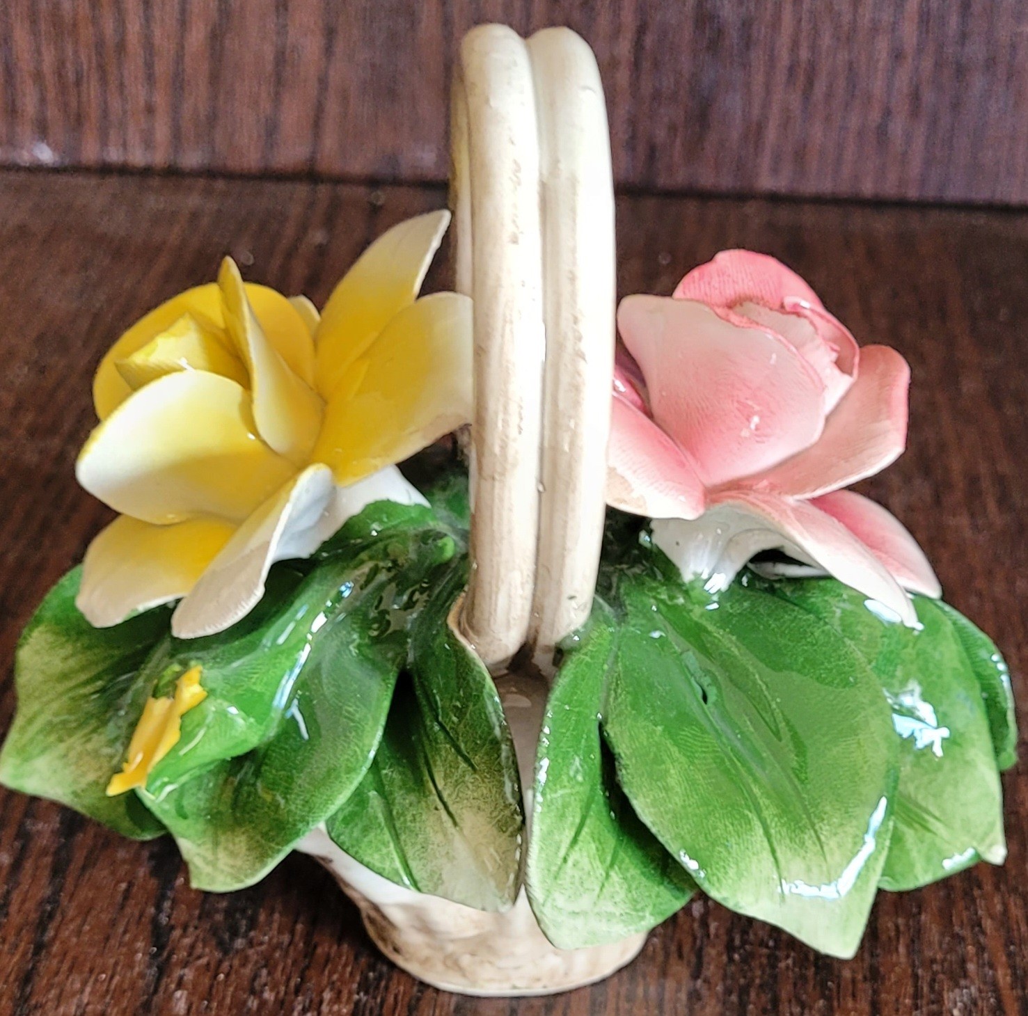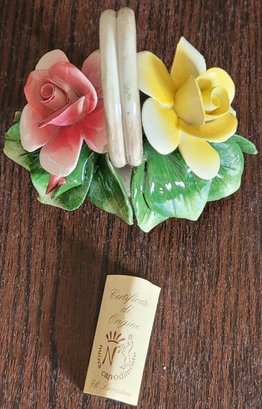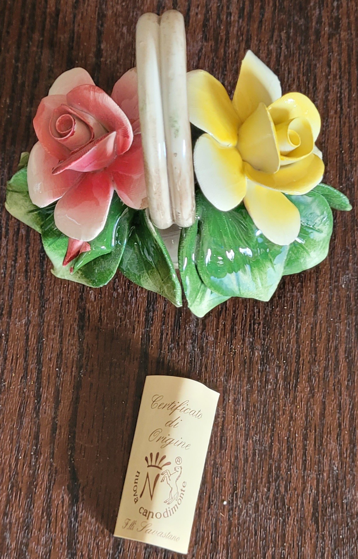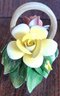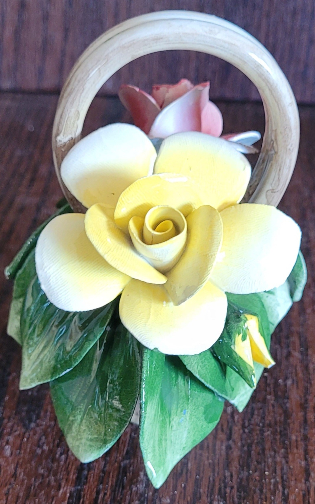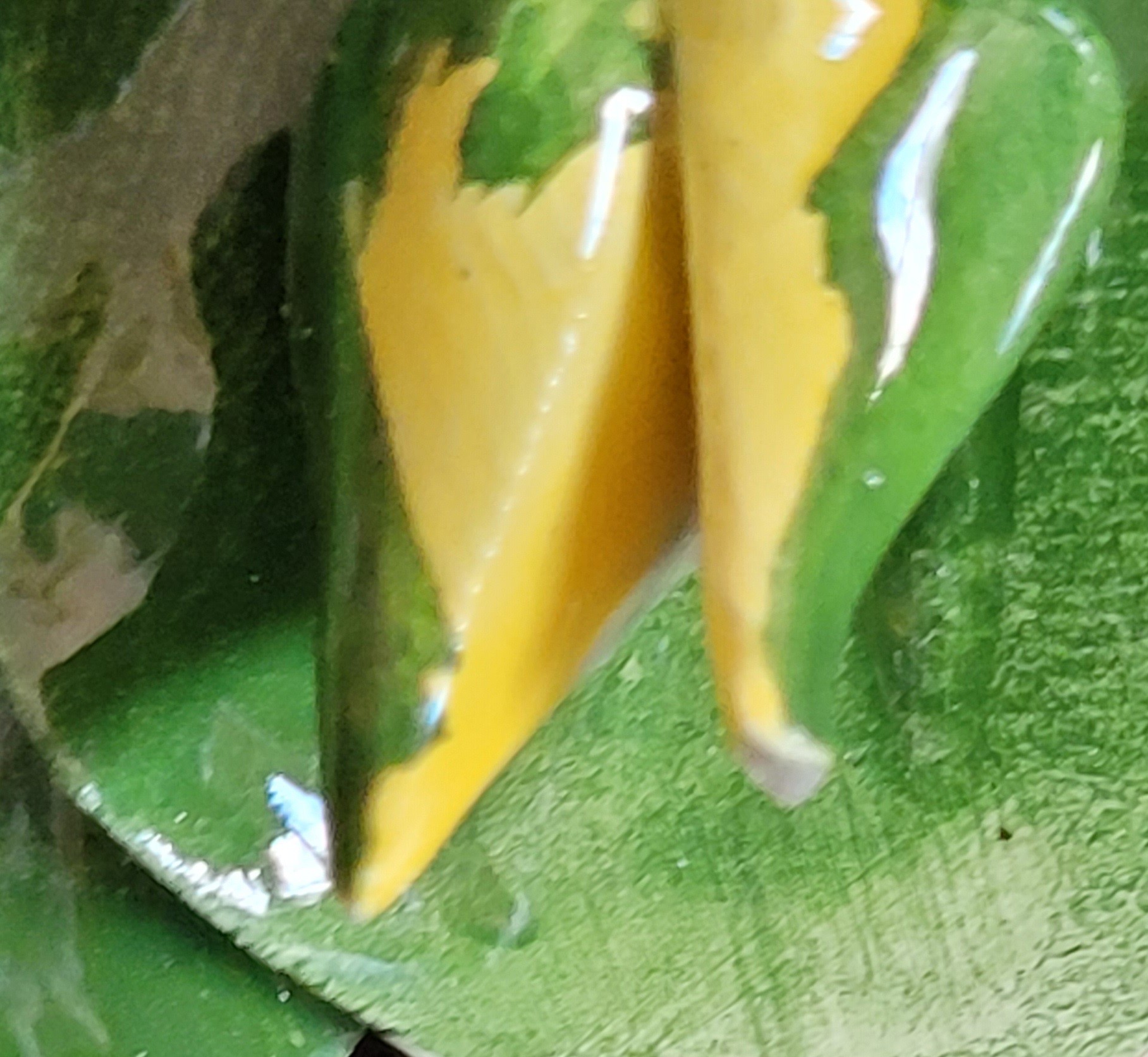 This does have a small chip on one of the leaves. See pictures for details.