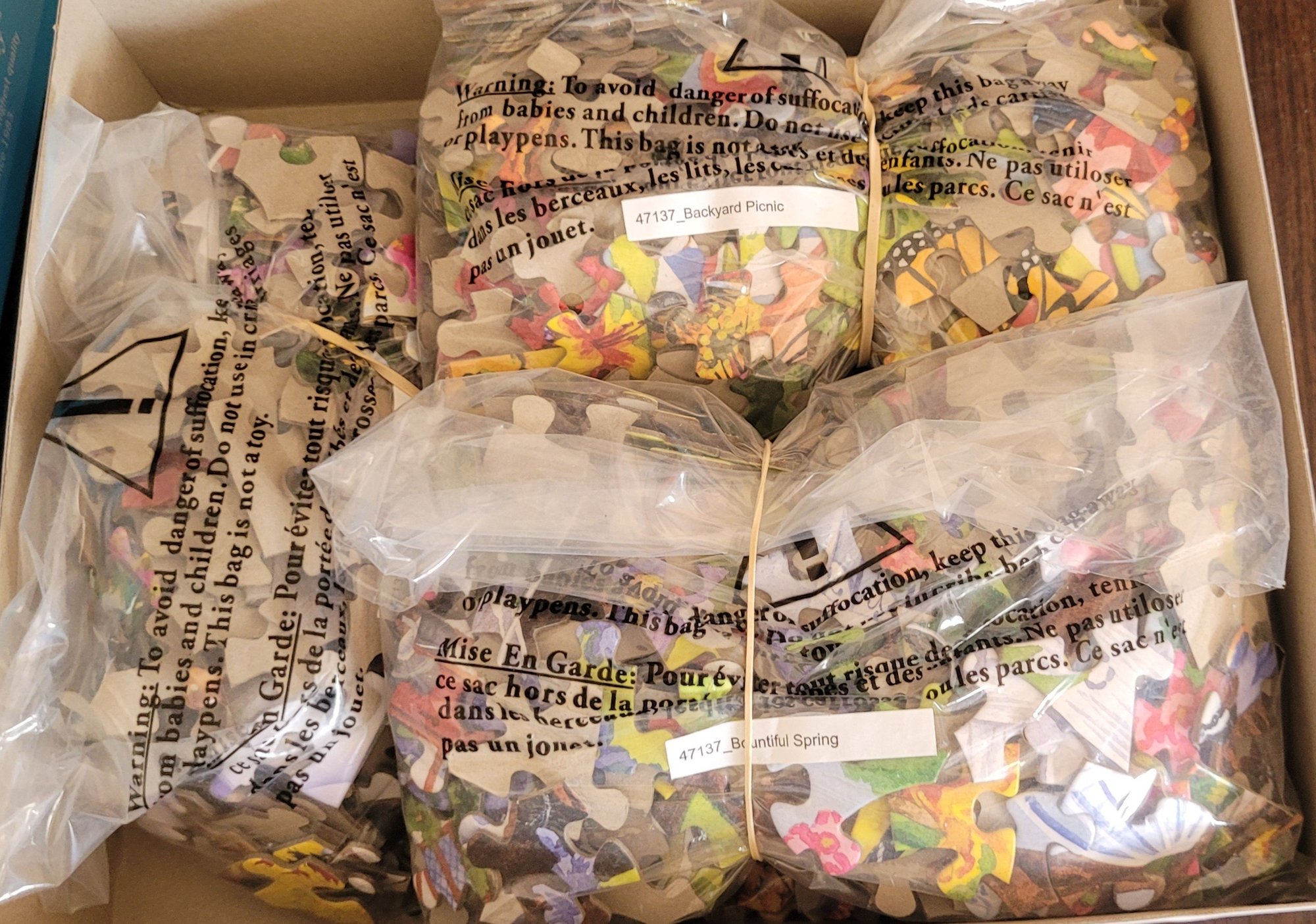 The one puzzle hasn't been opened the other one has the pieces in separate bags and I can't guarantee that all of the pieces are there. See pictures for details.