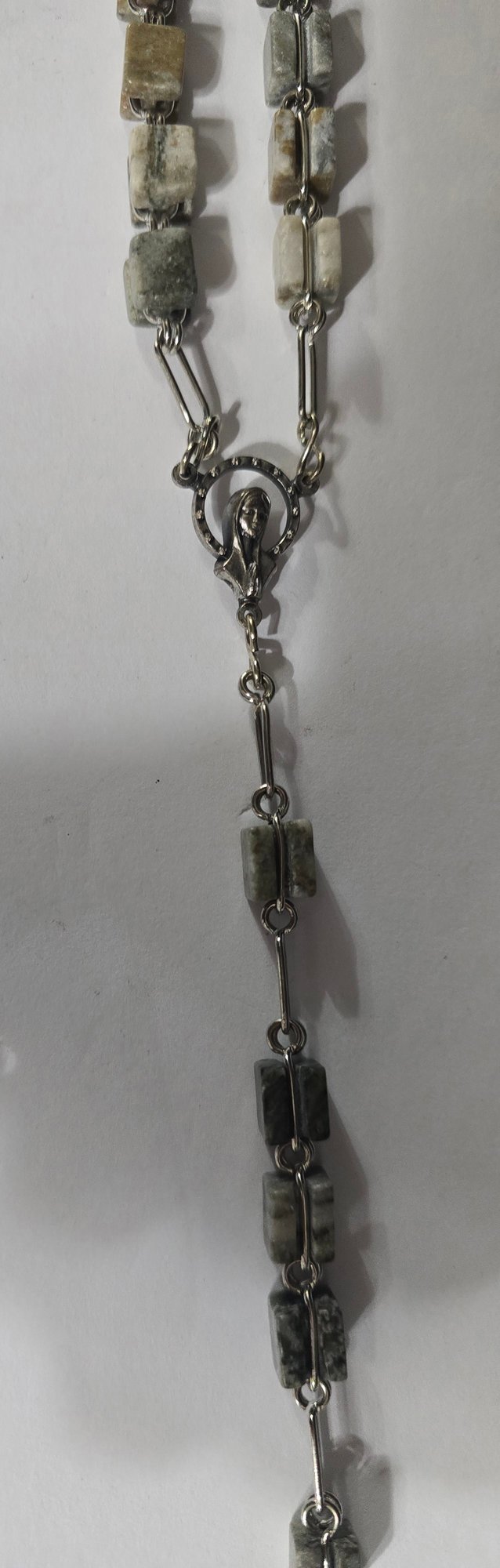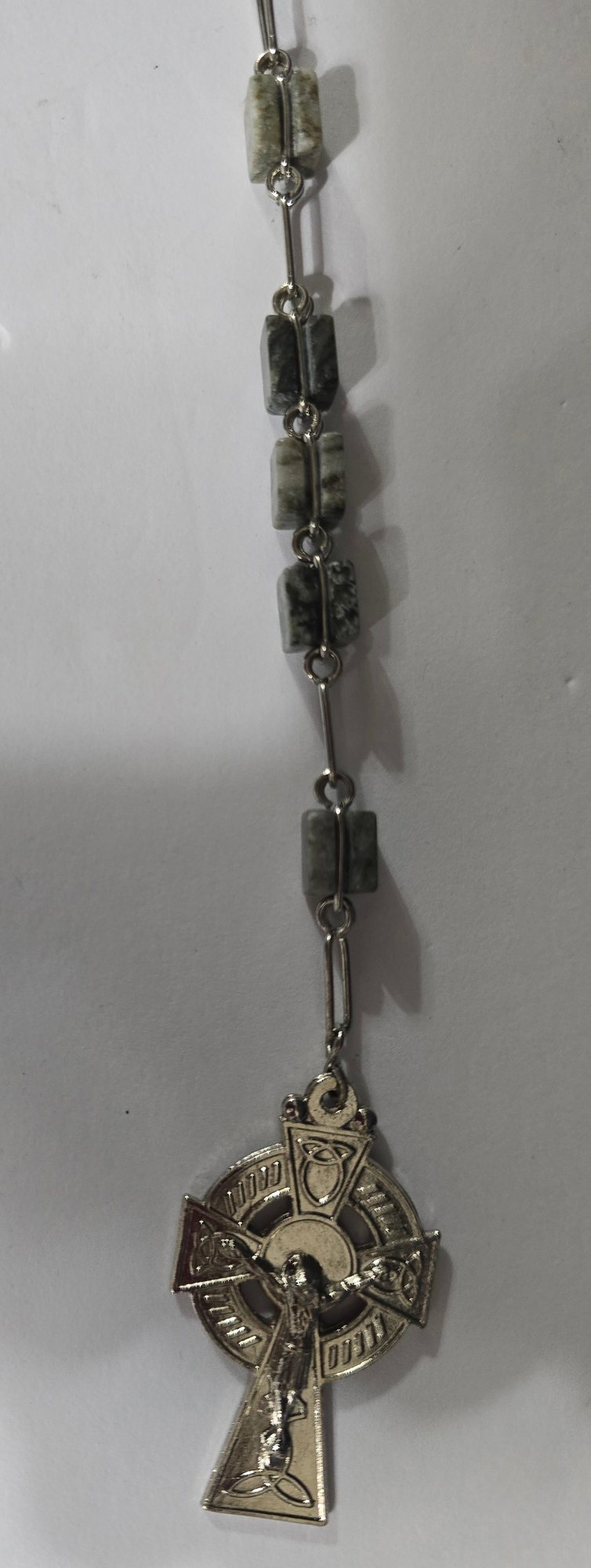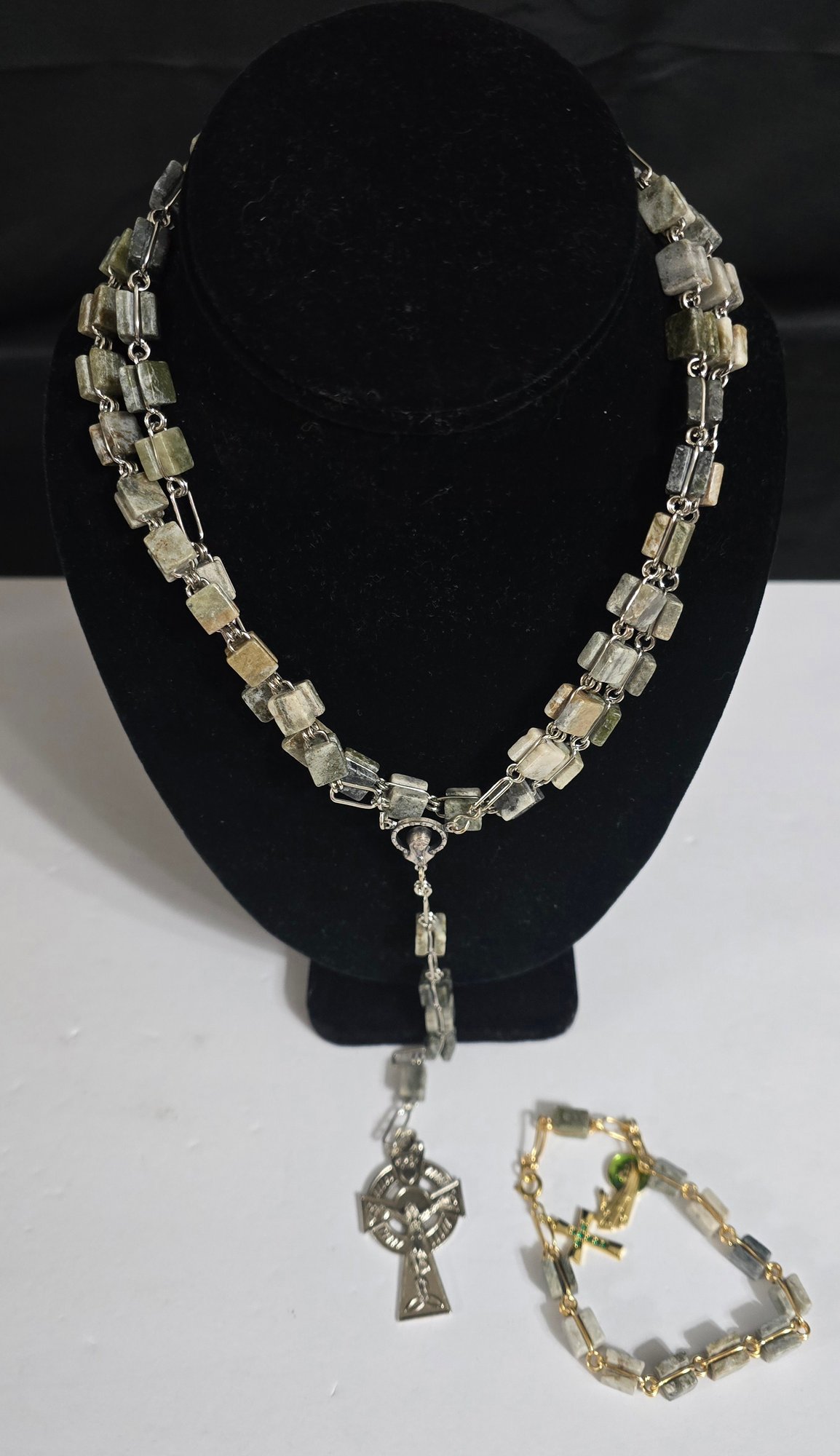 Appears to be variegated marble rosary with a Celtic cross and a matching bracelet. ( in Gold tone). Measures 25" and 4"