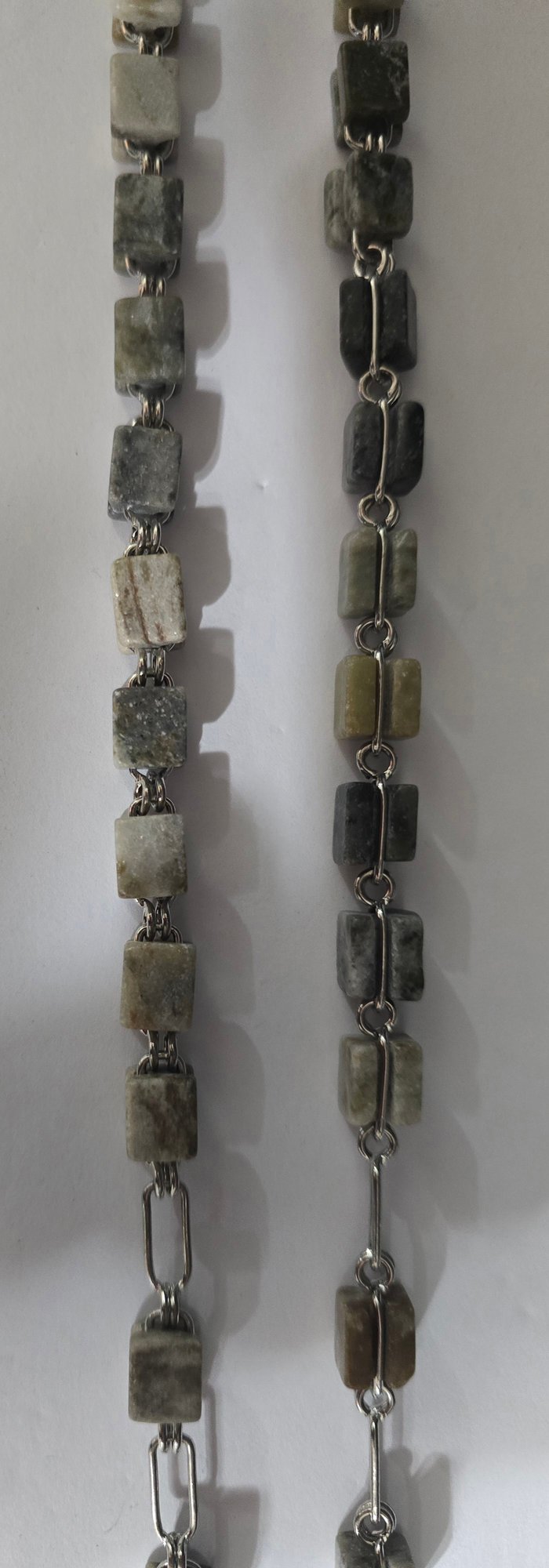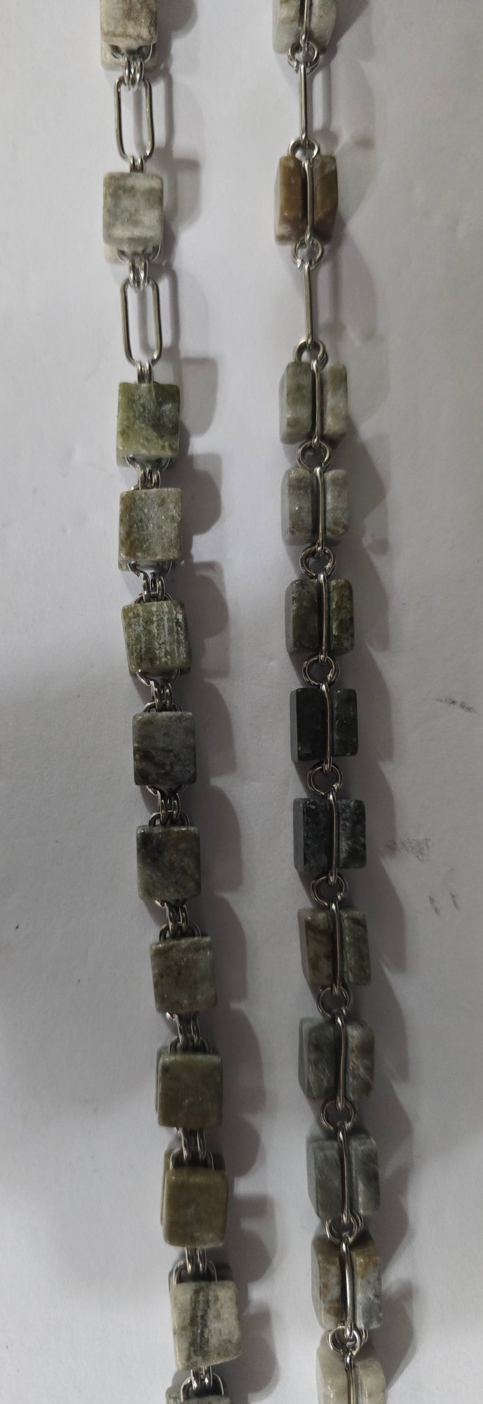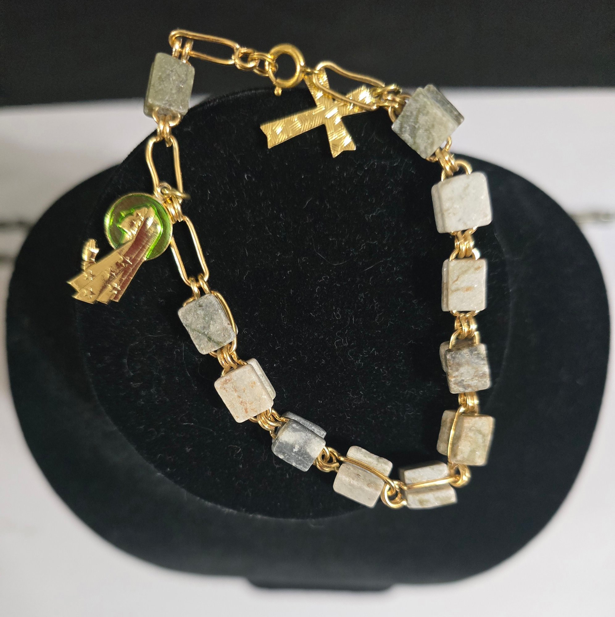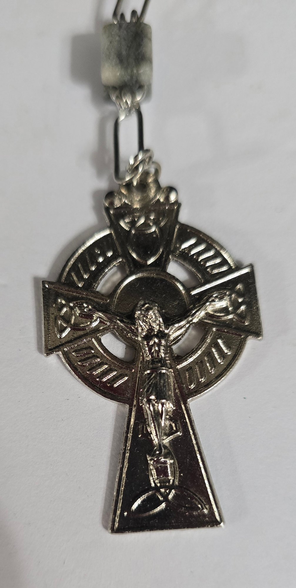 Appears to be variegated marble rosary with a Celtic cross and a matching bracelet. ( in Gold tone). Measures 25" and 4"