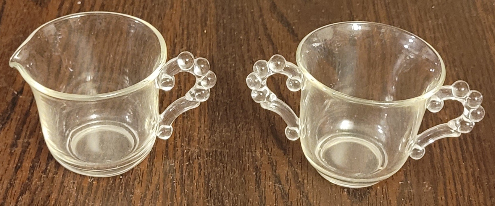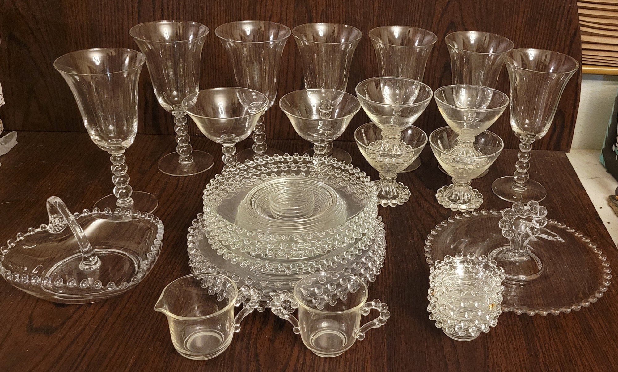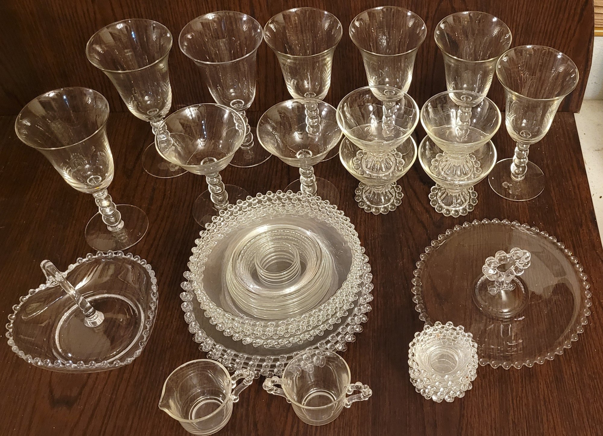 The glasses measure 7.5" tall, 5" tall, and 3.5" tall, the cream & sugar measure 3.5" tall, the plates measure 7" in diameter and 8" in diameter, the relish tray measures 8.25" tall and the bowl measures 6.25" long. See pictures for details.