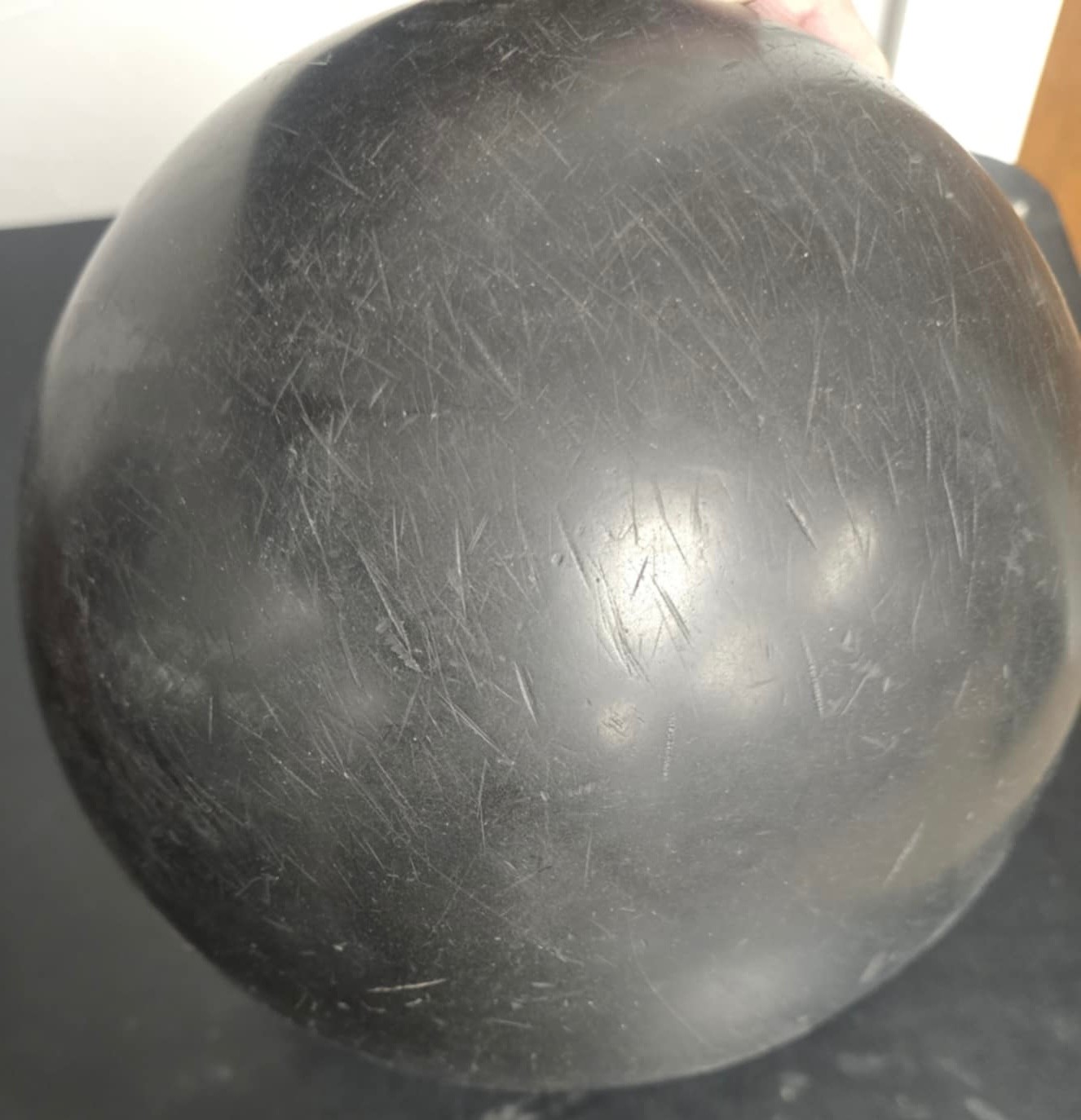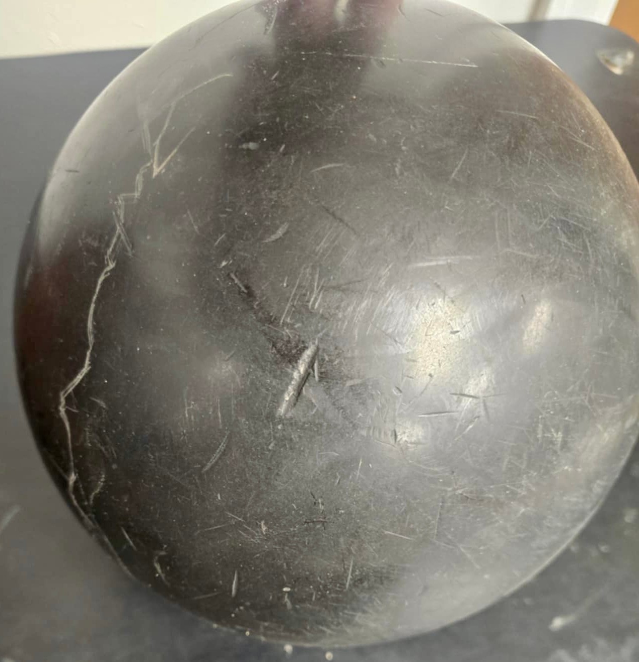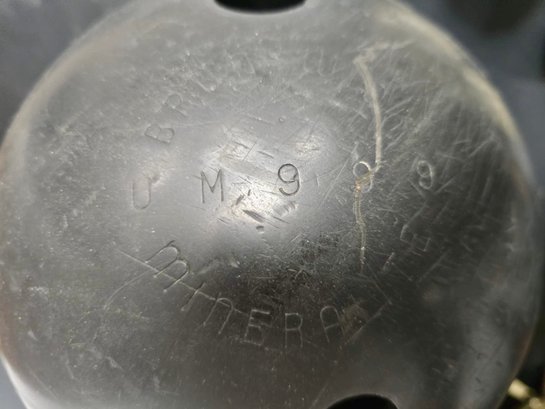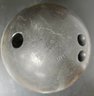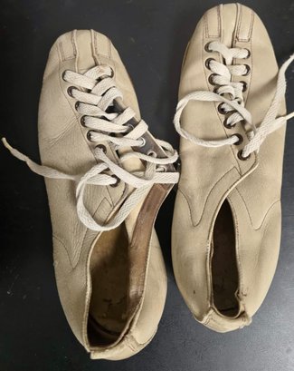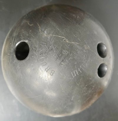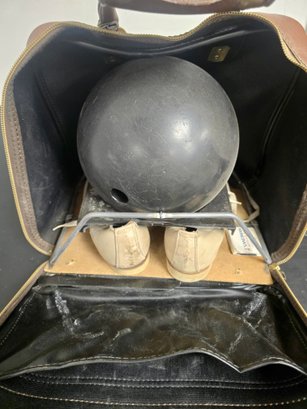 Vintage Brunswick Black Beauty bowling ball bag and shoes. Thumb is 1", fingers are 10/12". Span between thumb and fingers are approximately 3.75. Weights approximately 16 lbs.