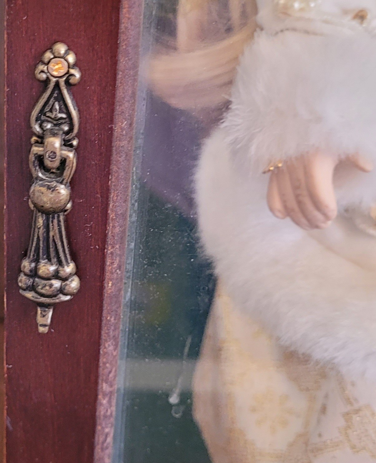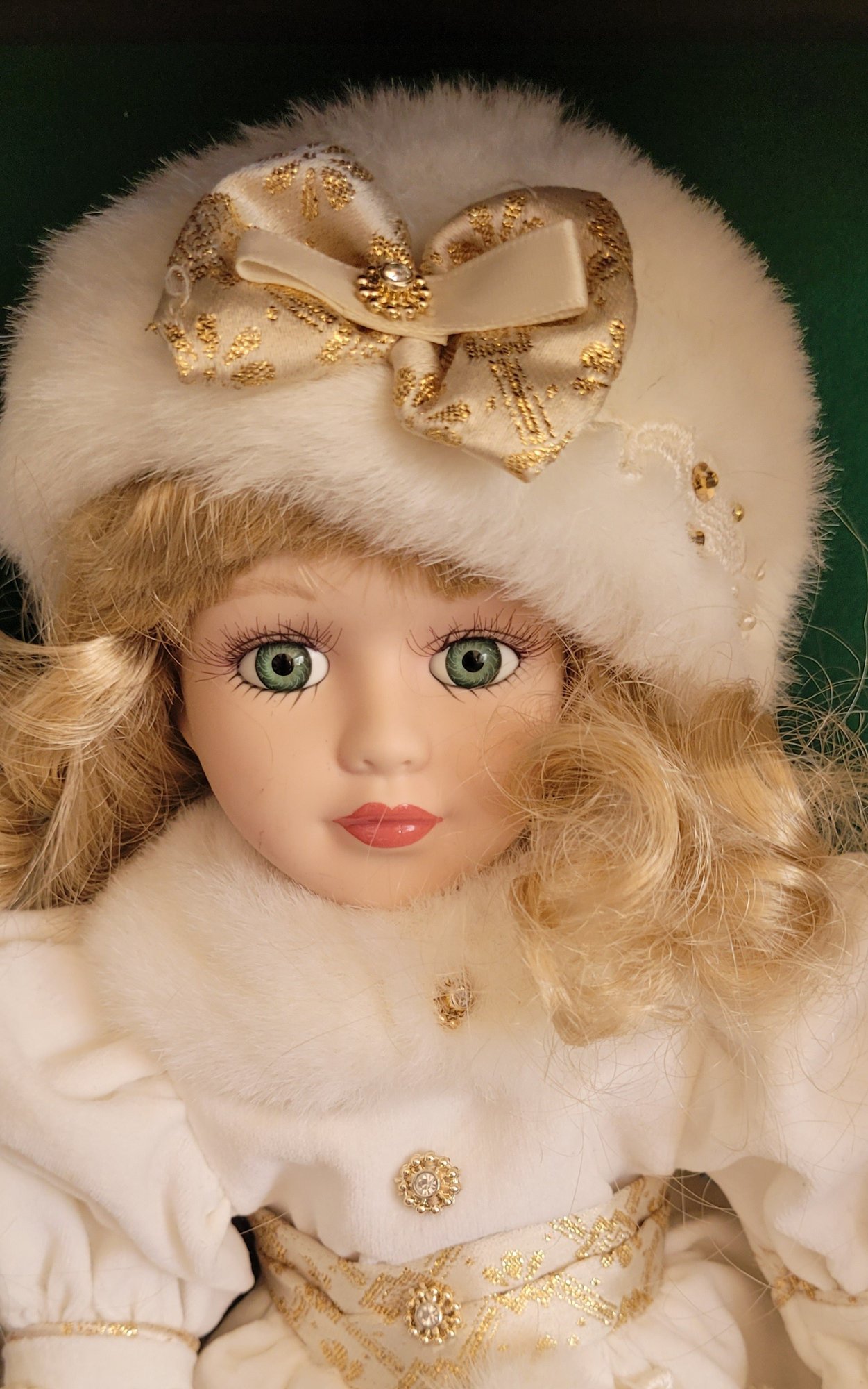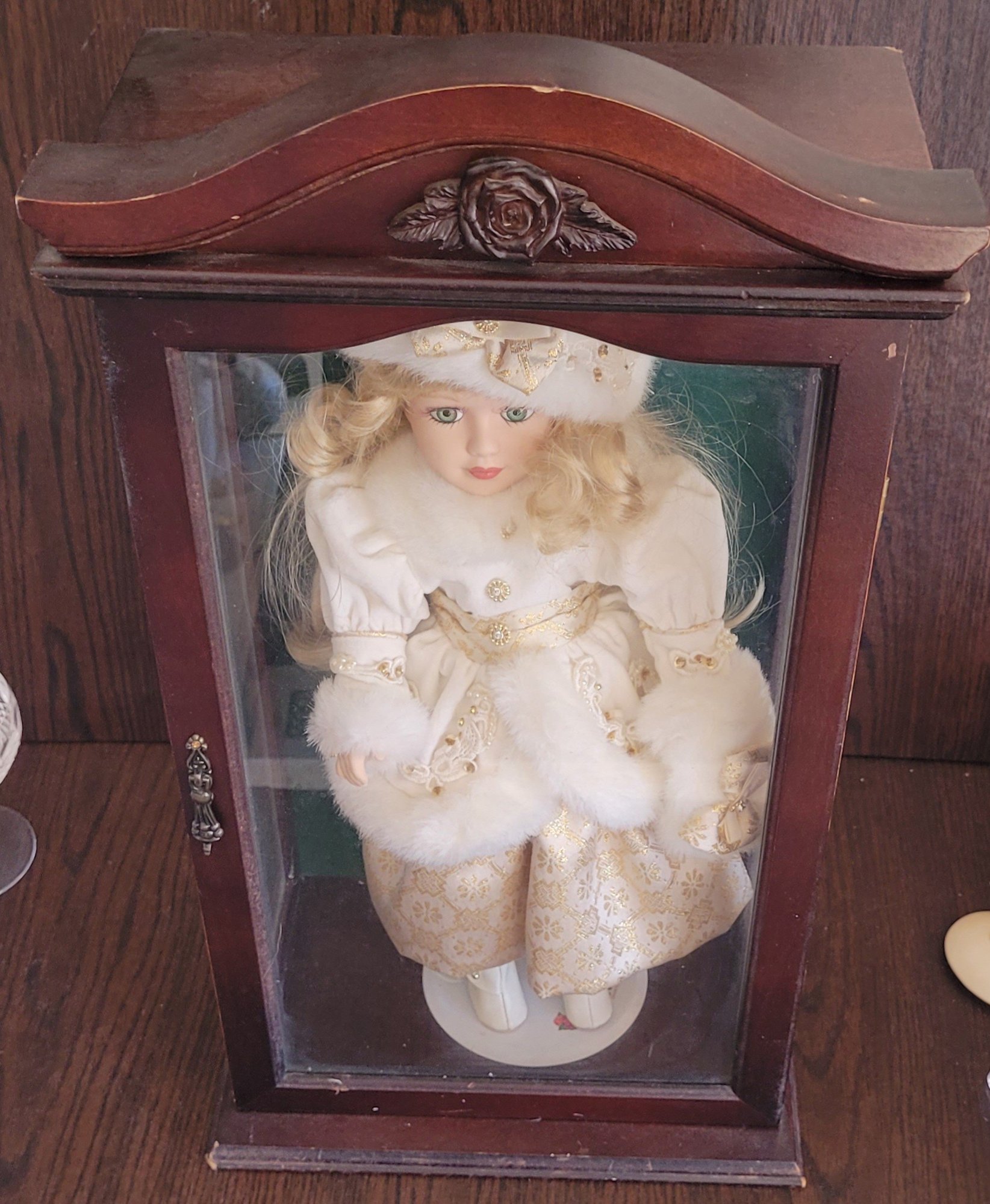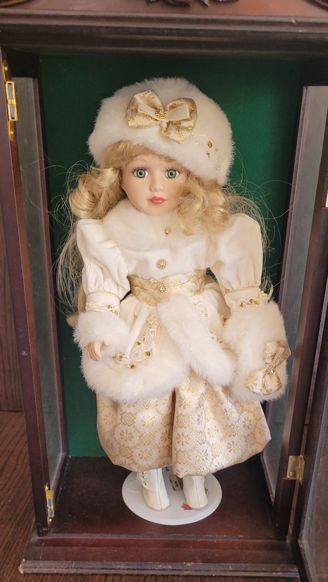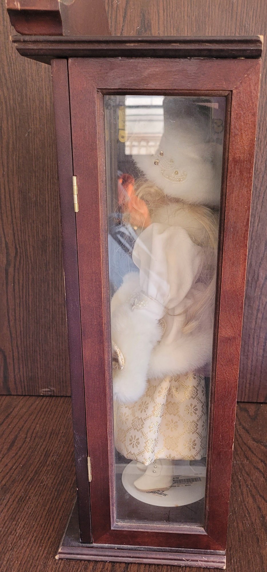 The doll measures 16" tall and the shelf measures 21.5" tall by 11" long by 7" wide. See pictures for details.