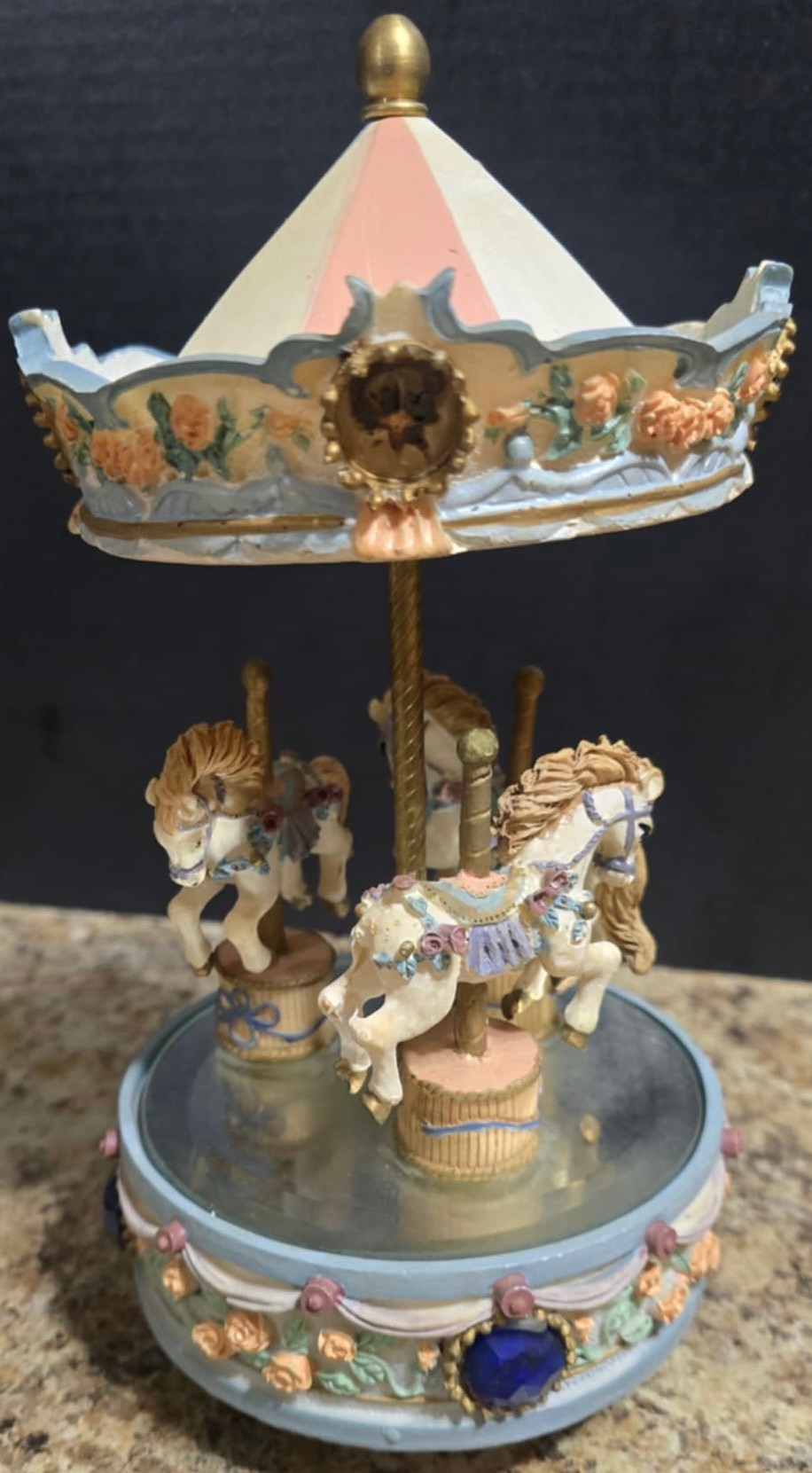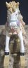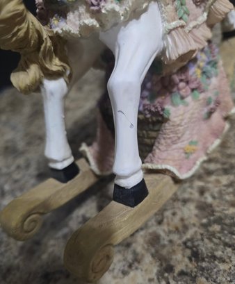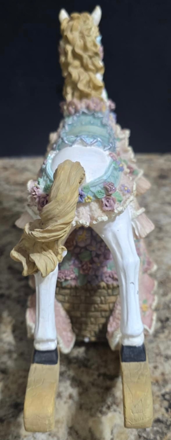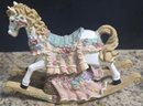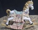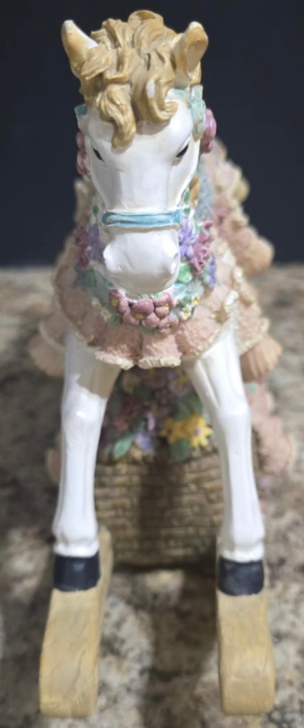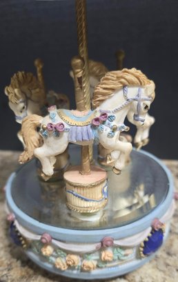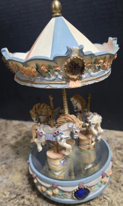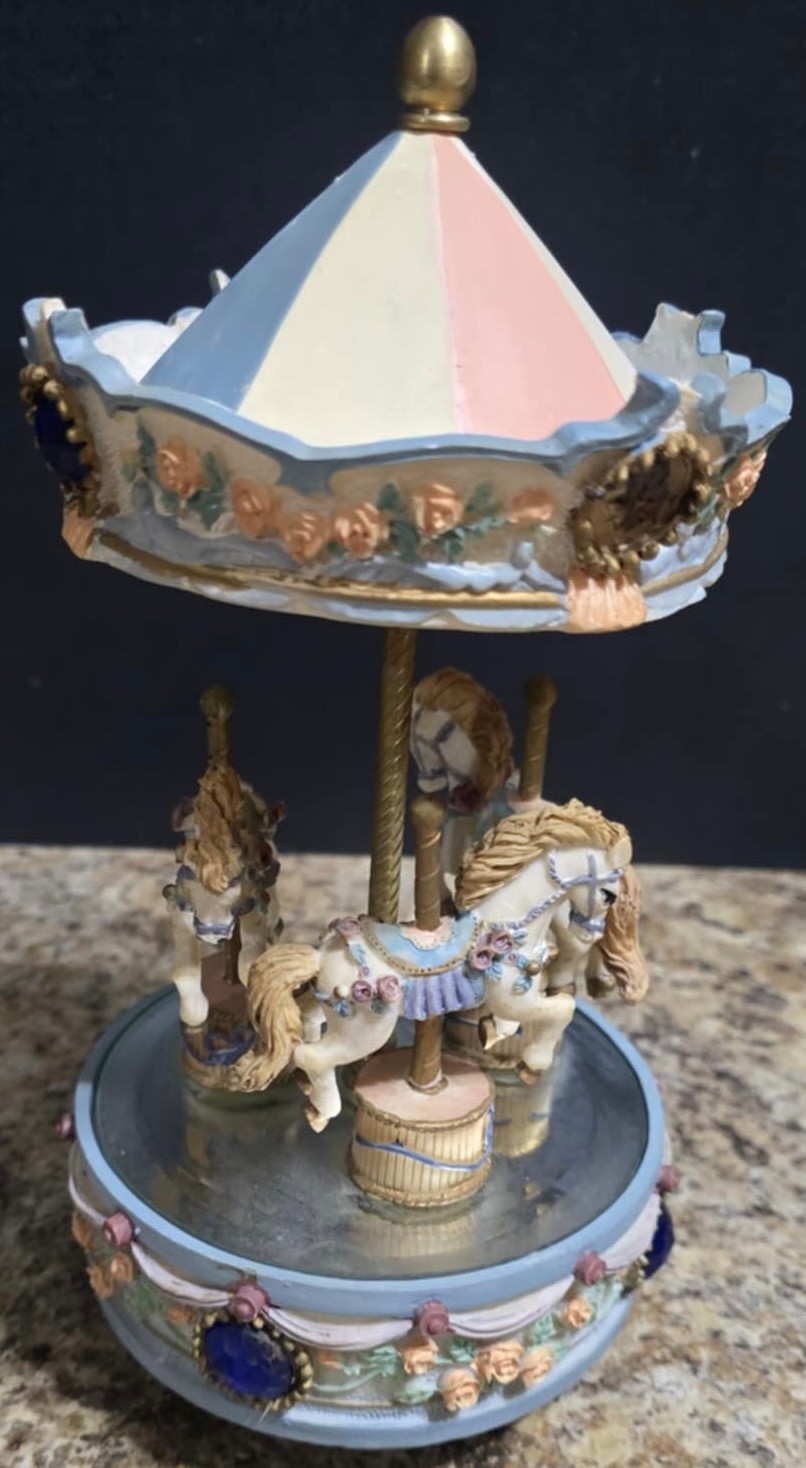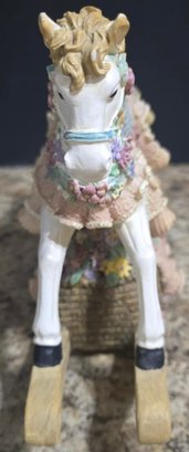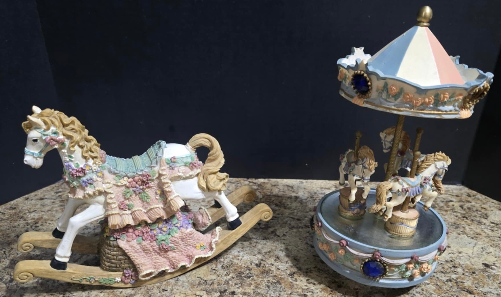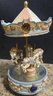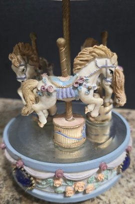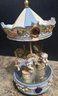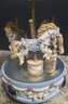 Vintage ceramic rotating three-horse carousel music box and vintage resin musical rocking horse figurine. Horse looks to have a cracked leg. Carousel is missing its jewels on the top. Measures 10.5h x 5d. Horse Measures 9.5 x 4 x 7. Both need cleaned. Both work. No maker noted.