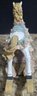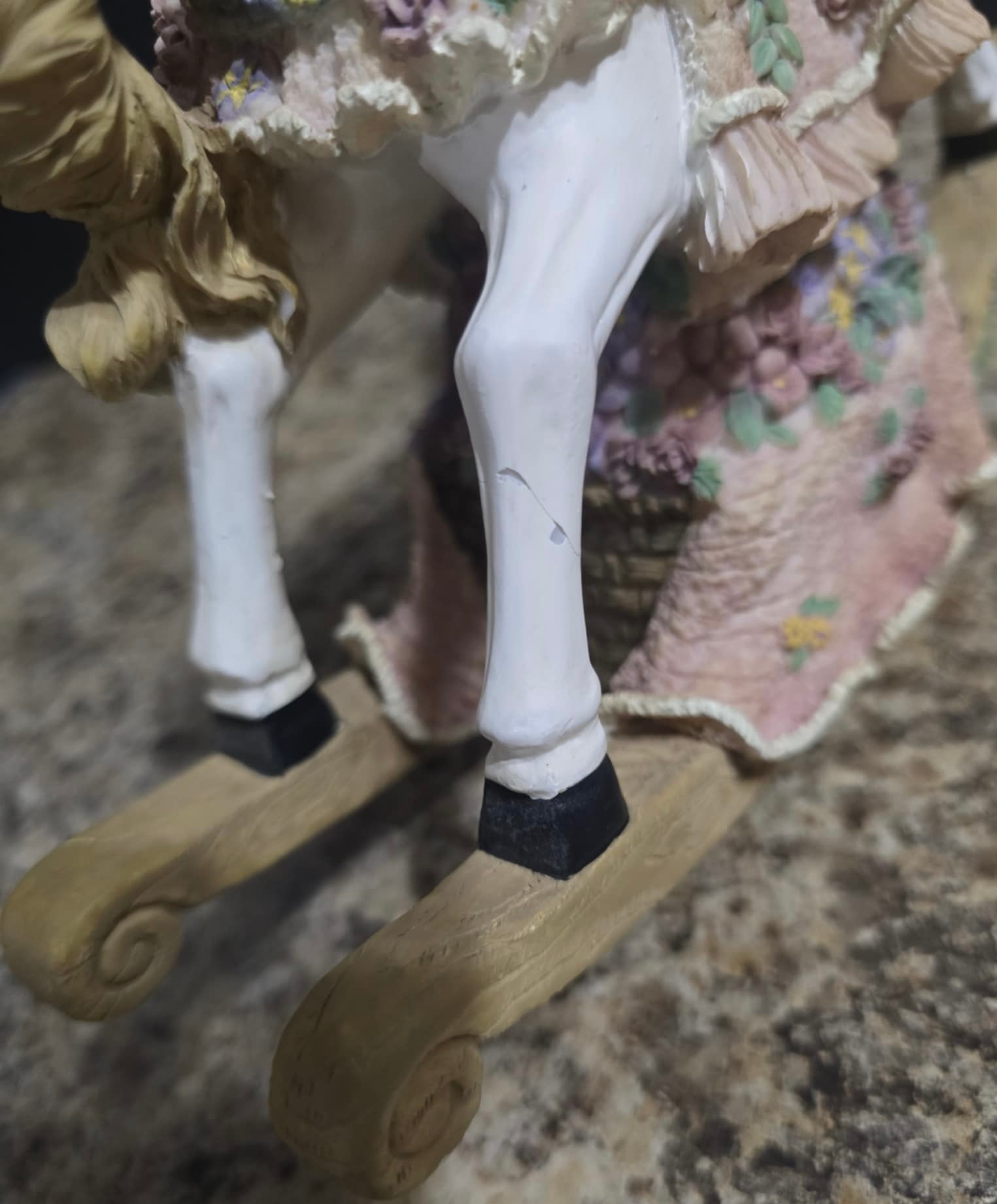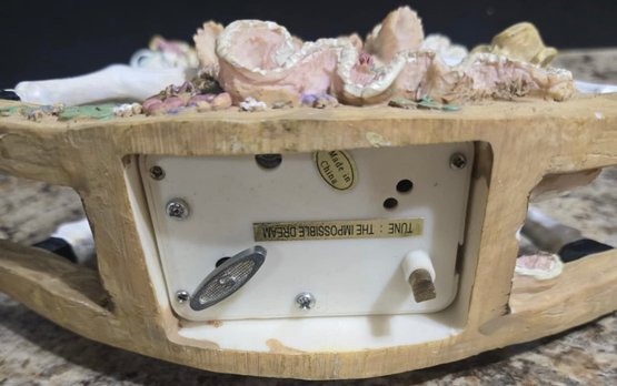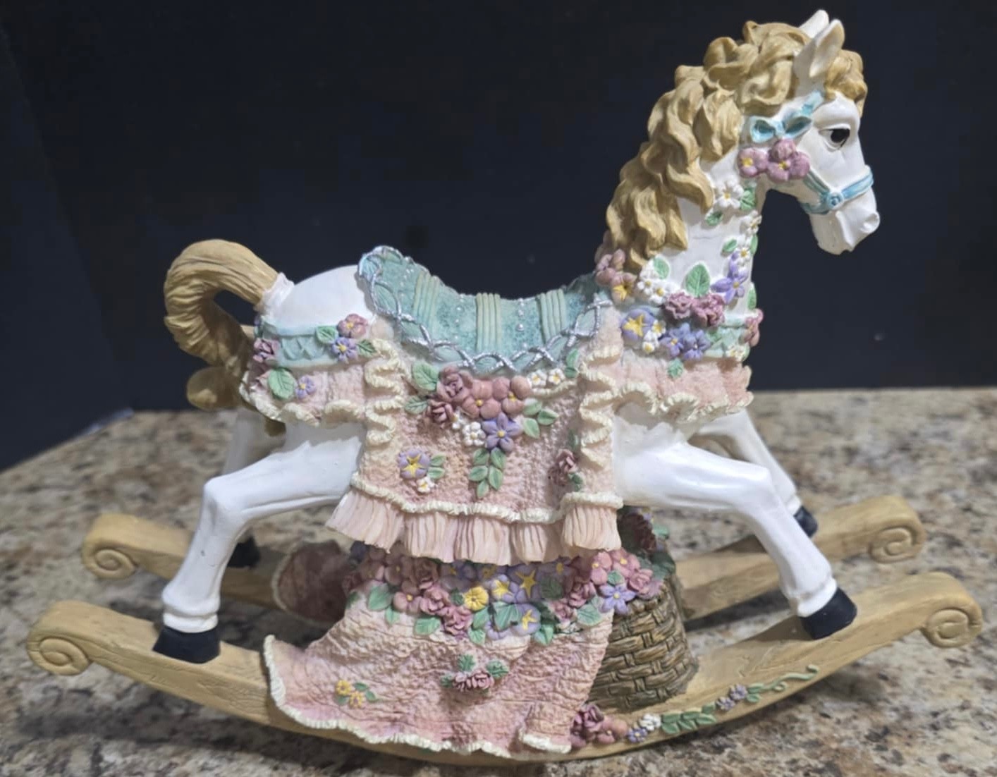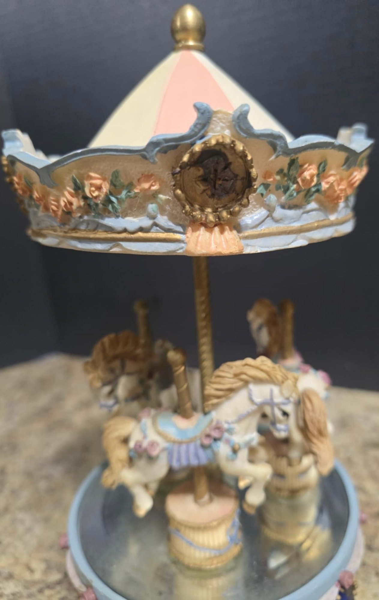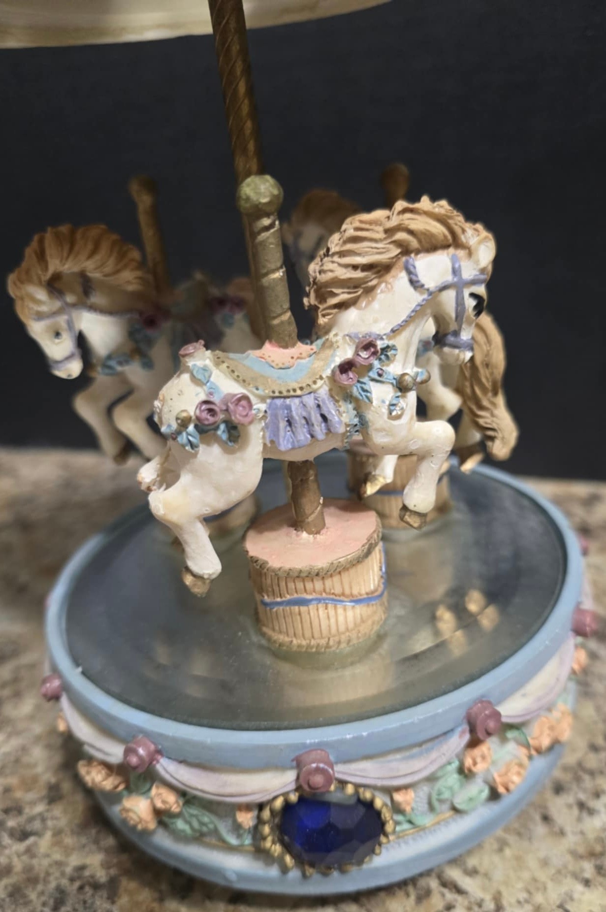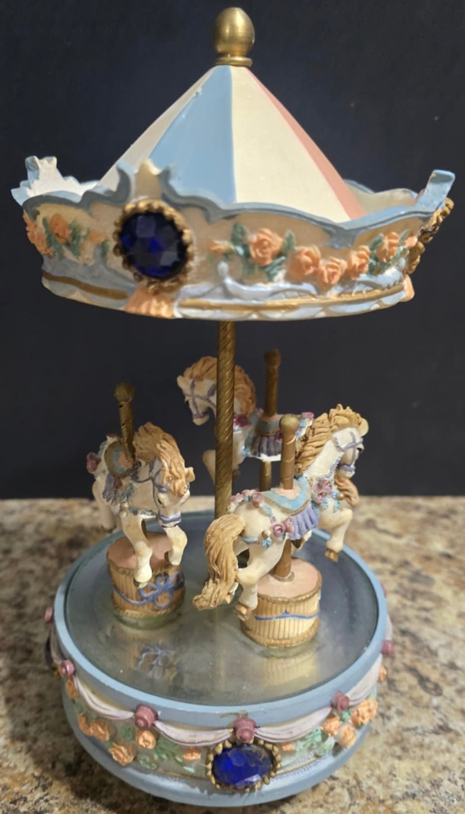 Vintage ceramic rotating three-horse carousel music box and vintage resin musical rocking horse figurine. Horse looks to have a cracked leg. Carousel is missing its jewels on the top. Measures 10.5h x 5d. Horse Measures 9.5 x 4 x 7. Both need cleaned. Both work. No maker noted.