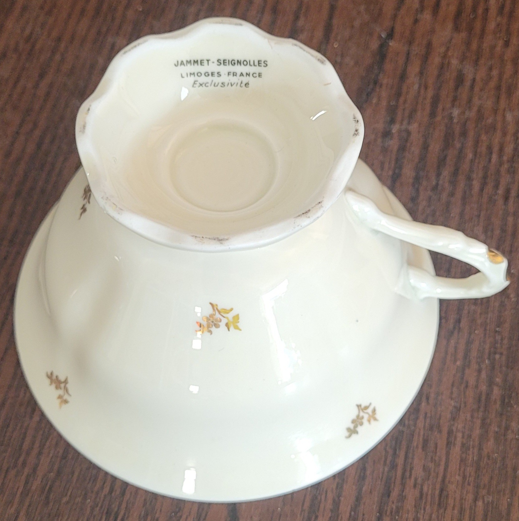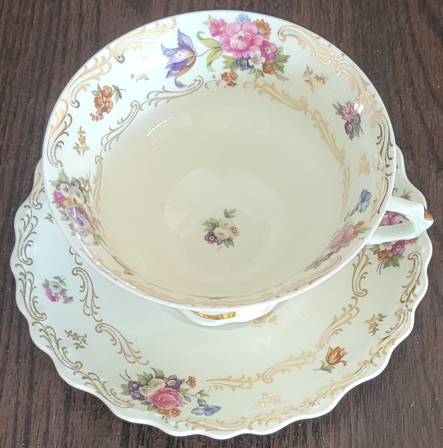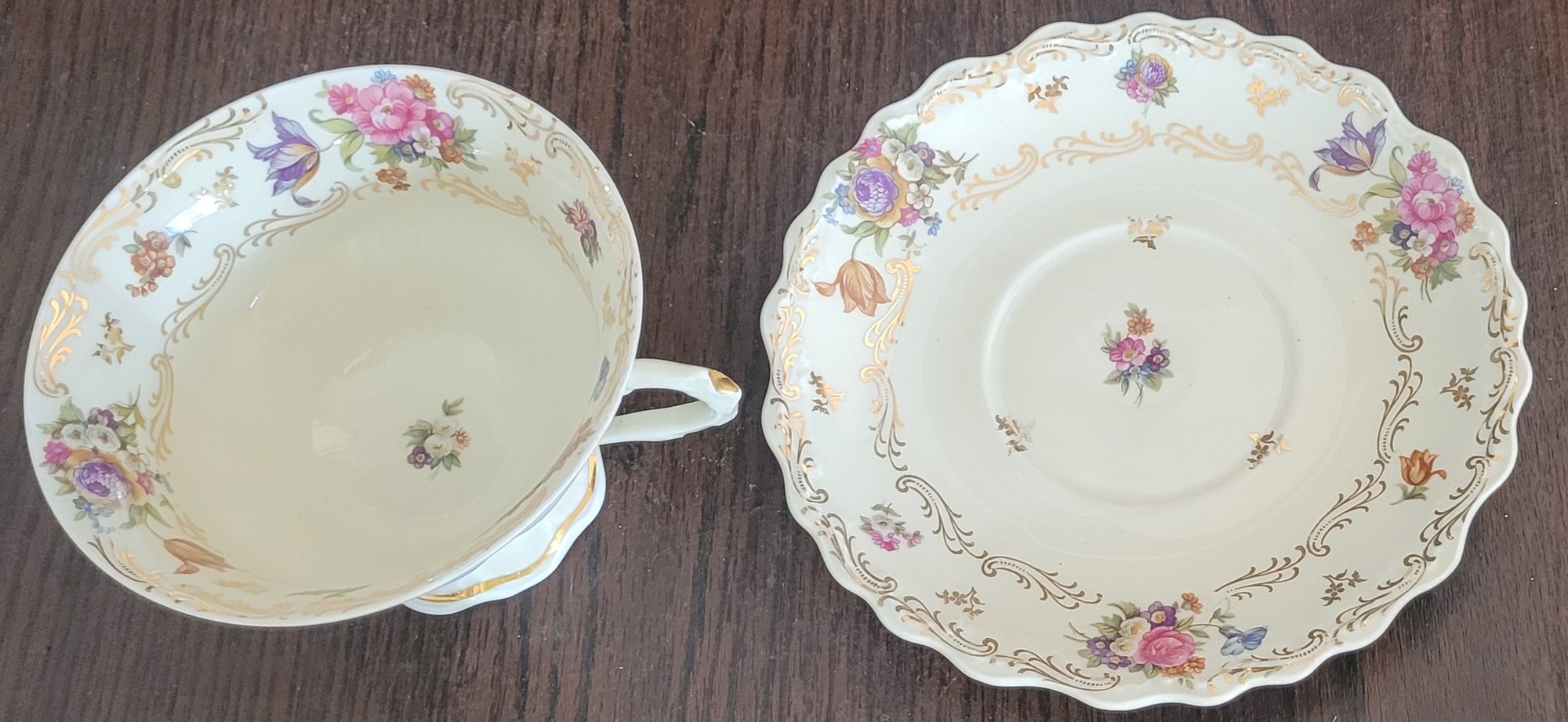 The saucer measures 7" in diameter and the tea cup measures 3.125" tall. Good condition. See pictures for details.