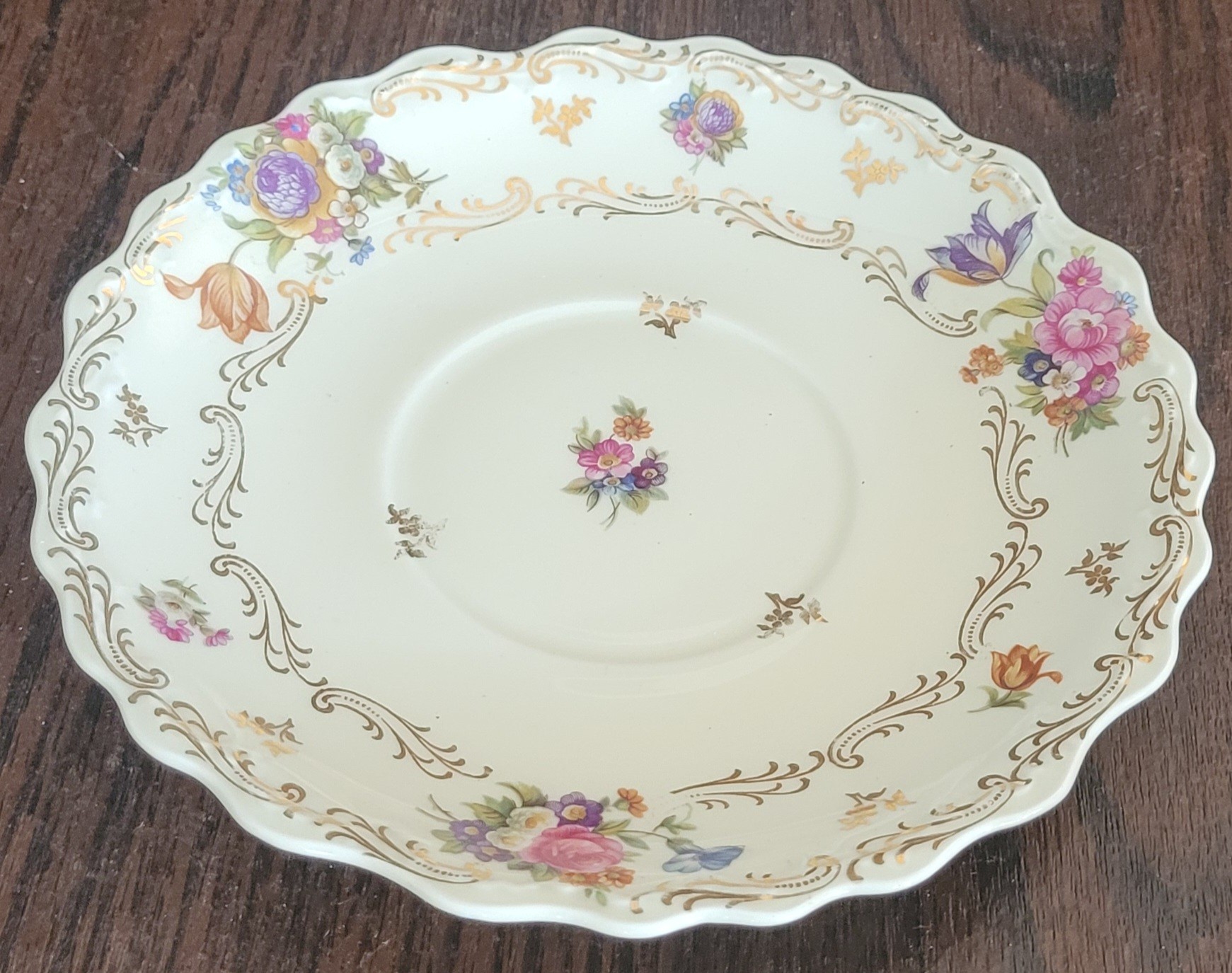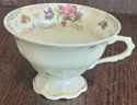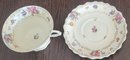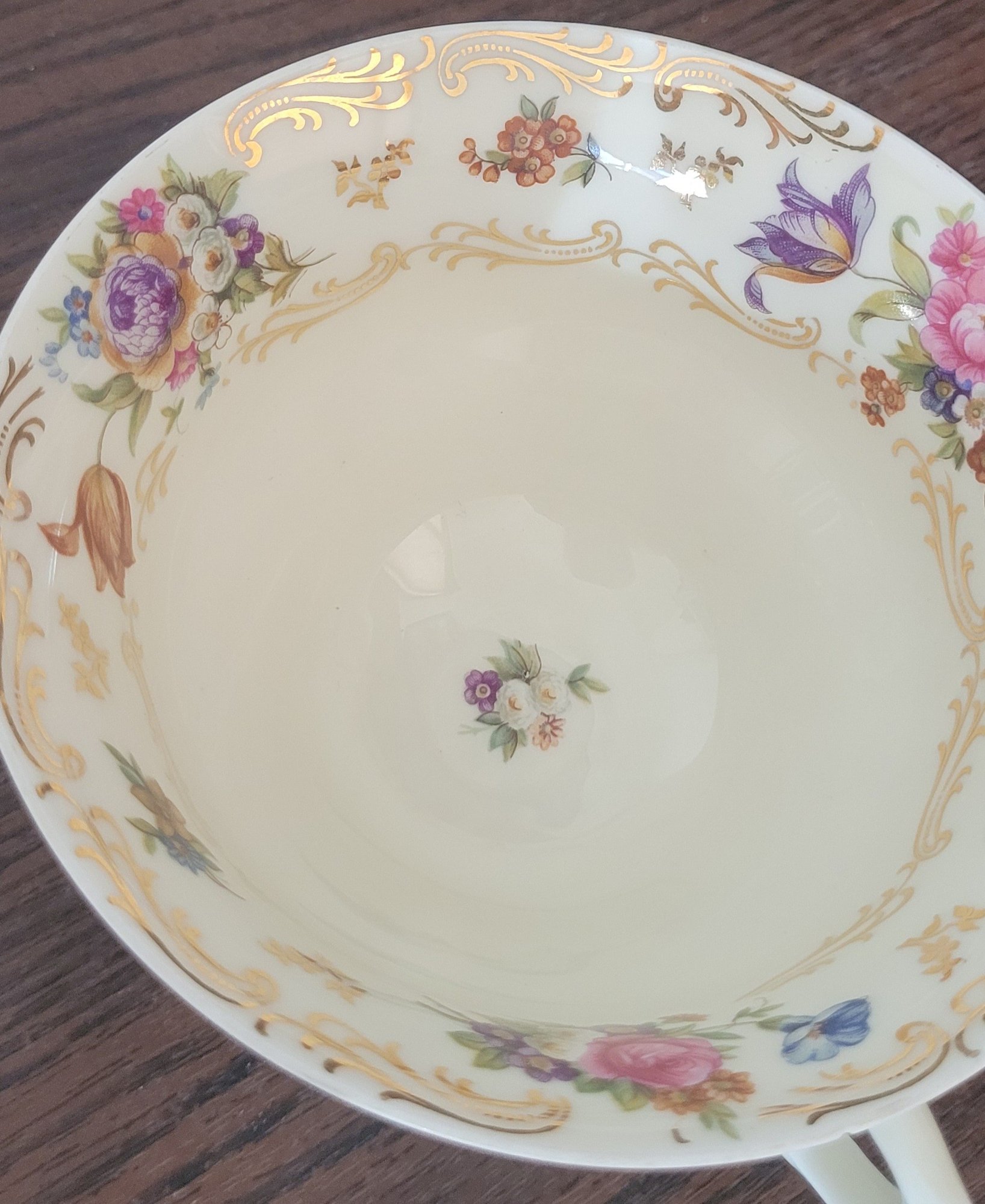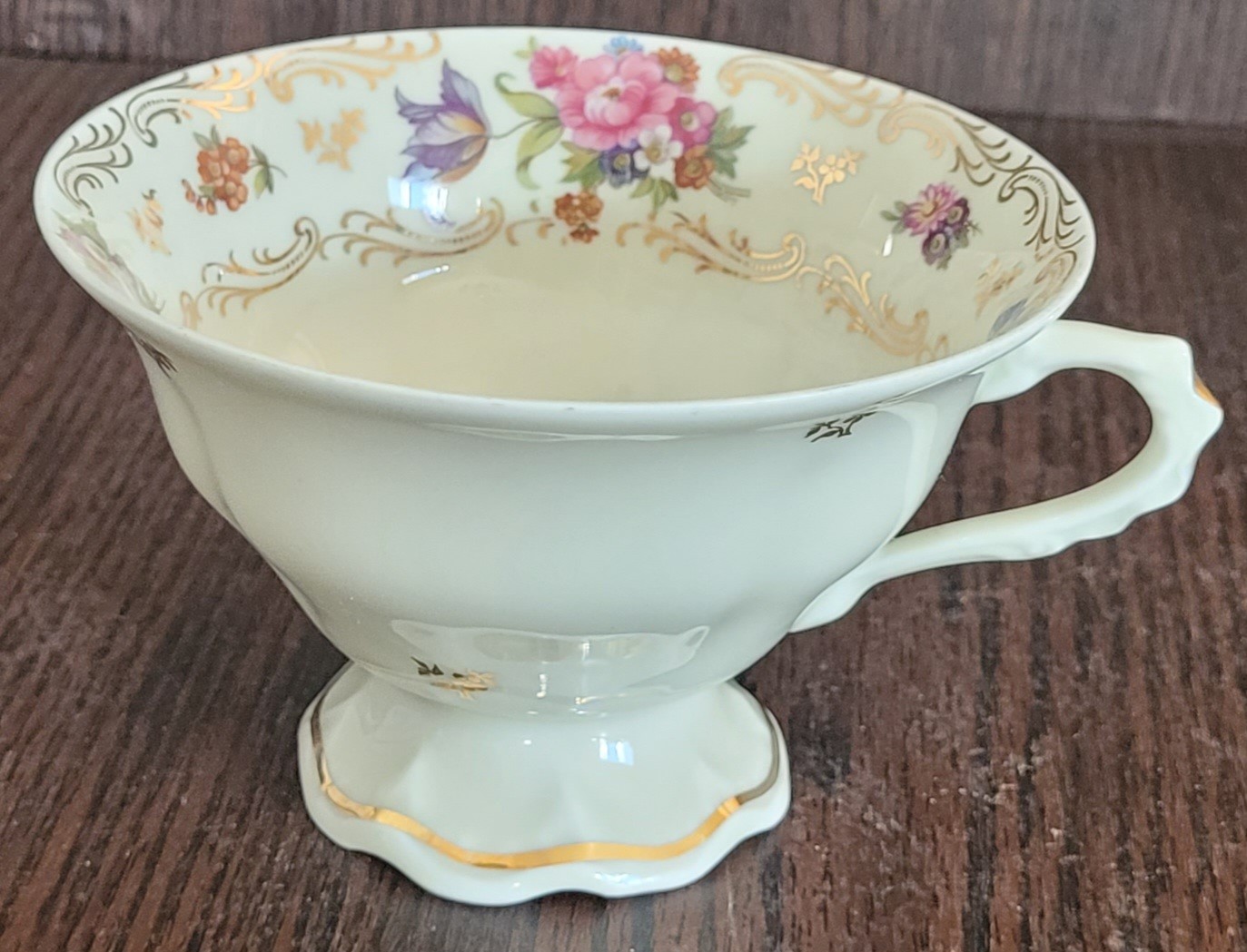 The saucer measures 7" in diameter and the tea cup measures 3.125" tall. Good condition. See pictures for details.
