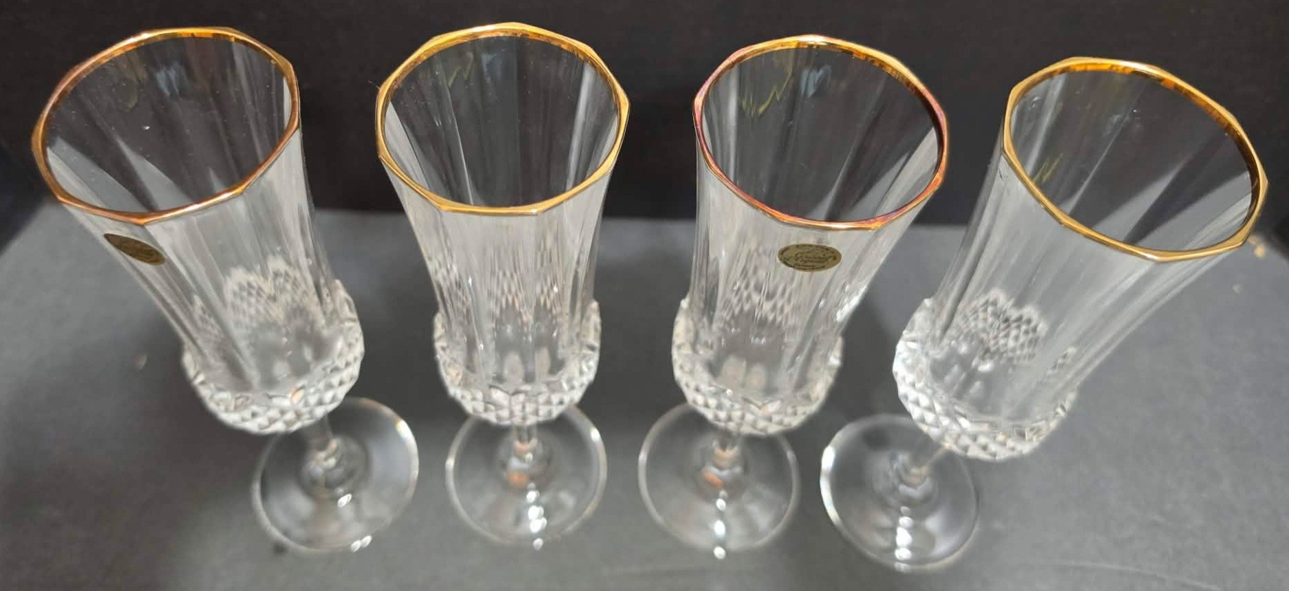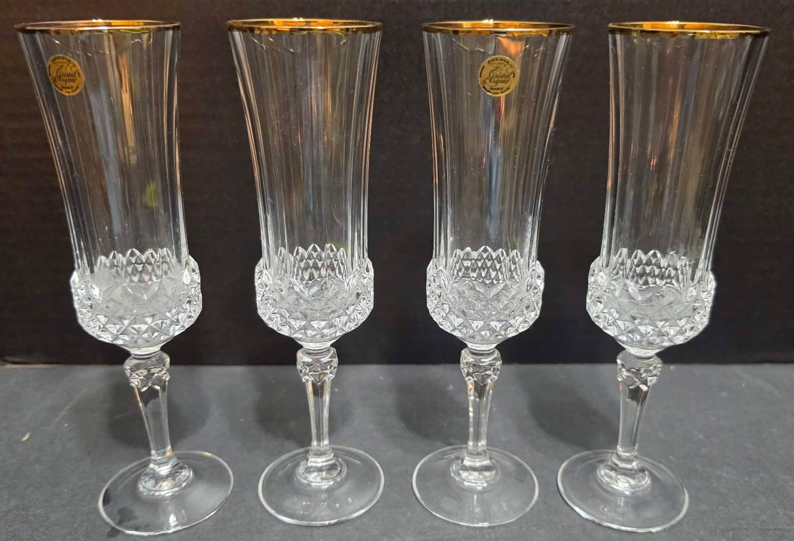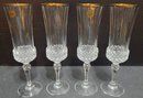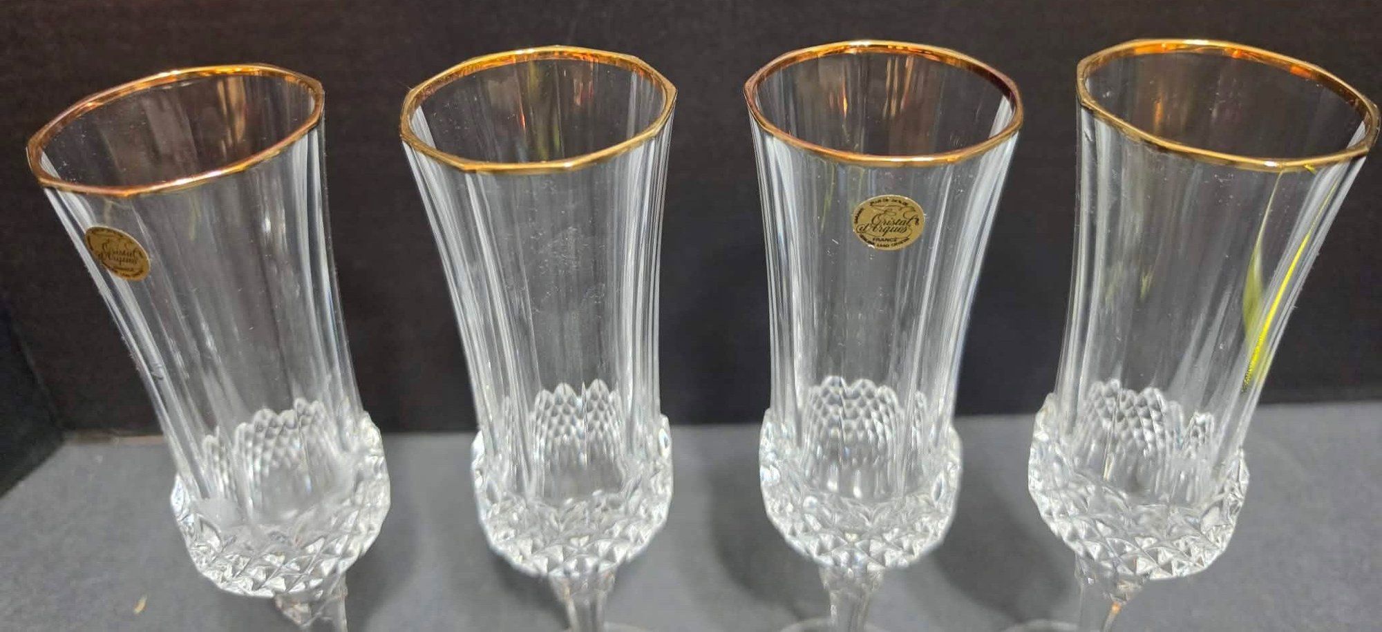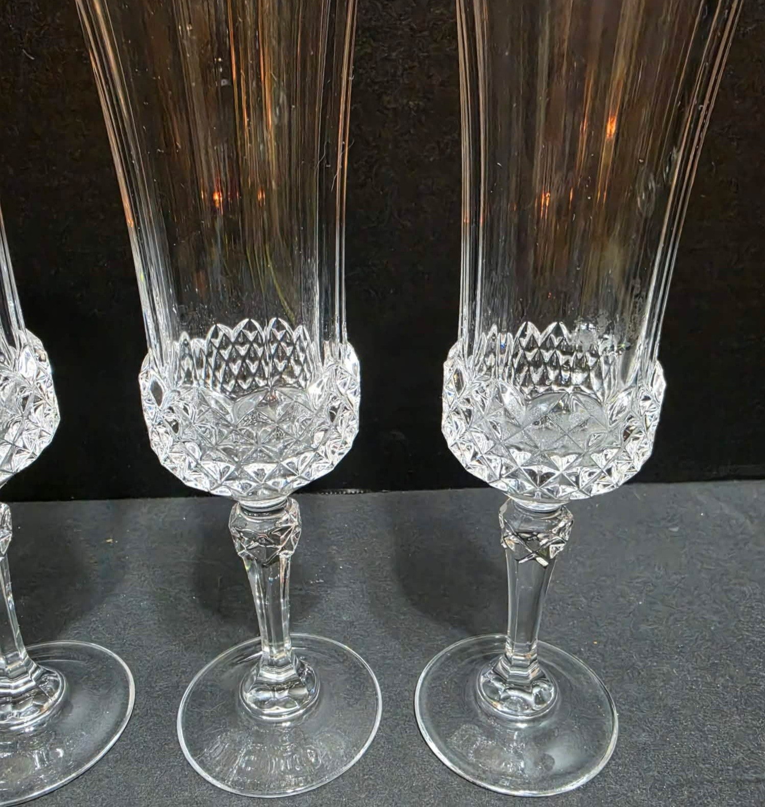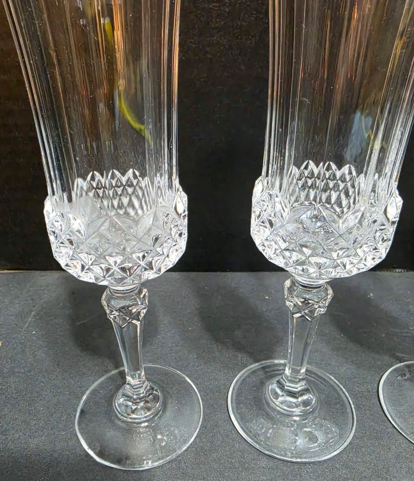 Vintage Cristal d'Arques-Durand champagne flutes in the iconic Longchamp pattern. No cracks or chips noted.