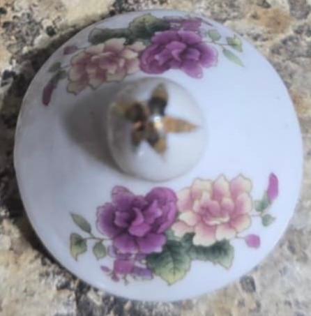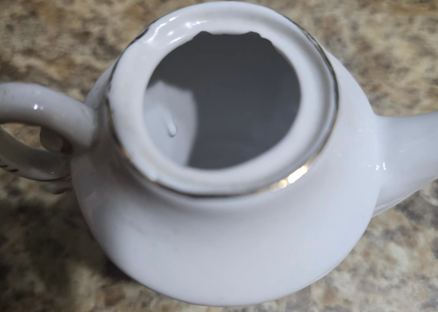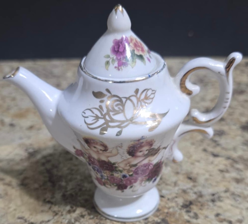 Vintage Dresden-style porcelain demitasse tea set featuring hand-painted pink roses and cherub or courting couple motifs with gold trim. Tea Pot looks to have been glued or imperfection in the top. All need cleaned. Teapot measures 4.5h x 4.25w. No maker noted.
