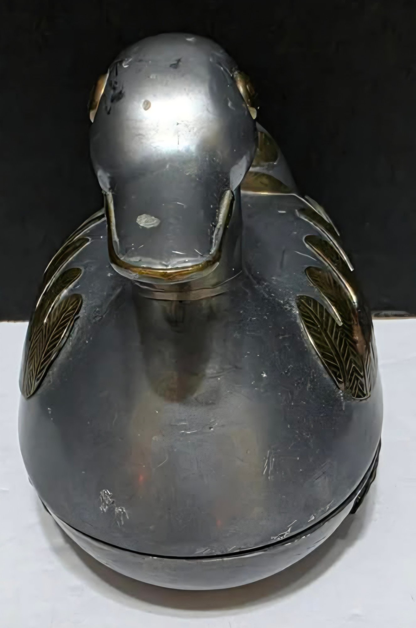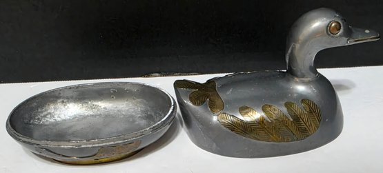 Vintage duck-shaped trinket box made of pewter with brass wing and tail accents. Measures 5 x 3.25.