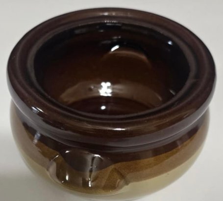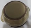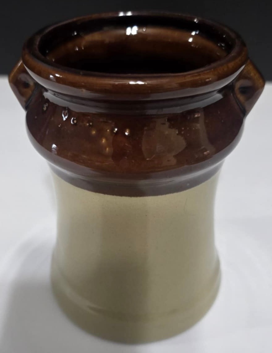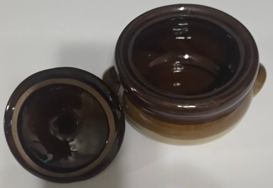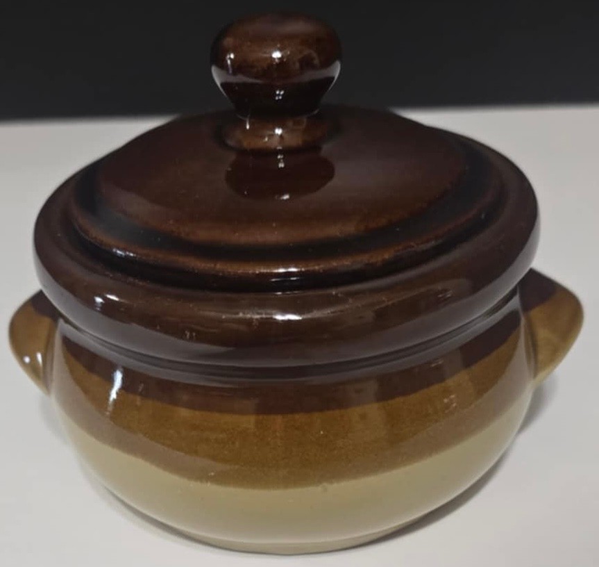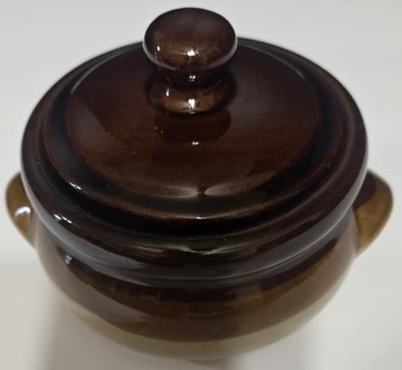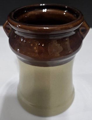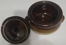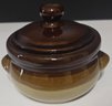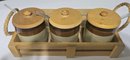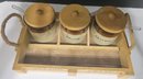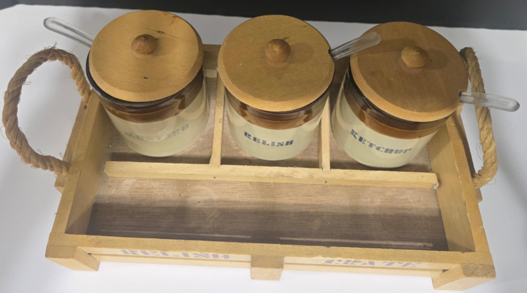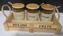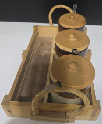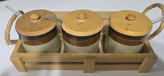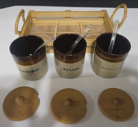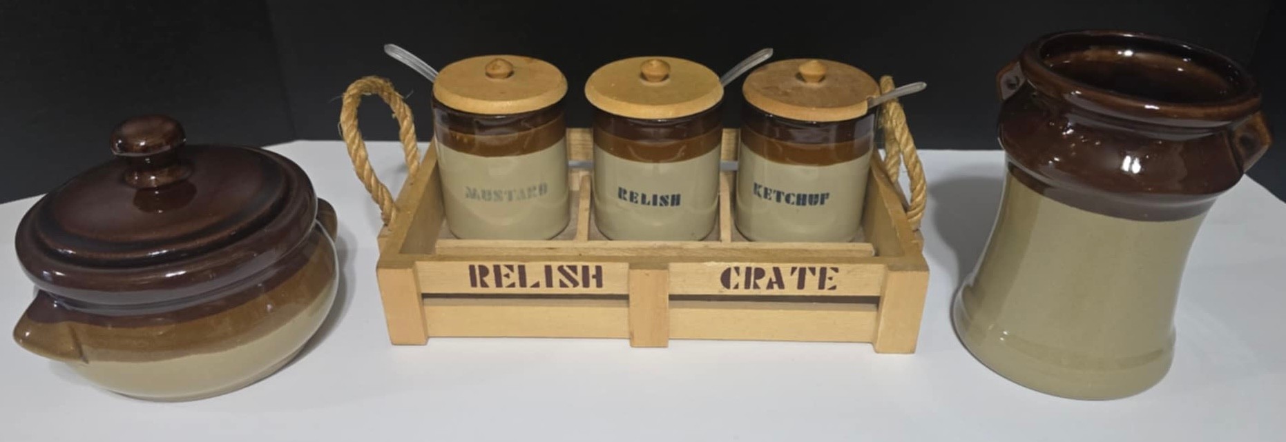 Vintage Enesco wooden relish crate and stoneware condiment jar set. And vintage glazed pottery lidded bean pot, w/ utensils holder.
