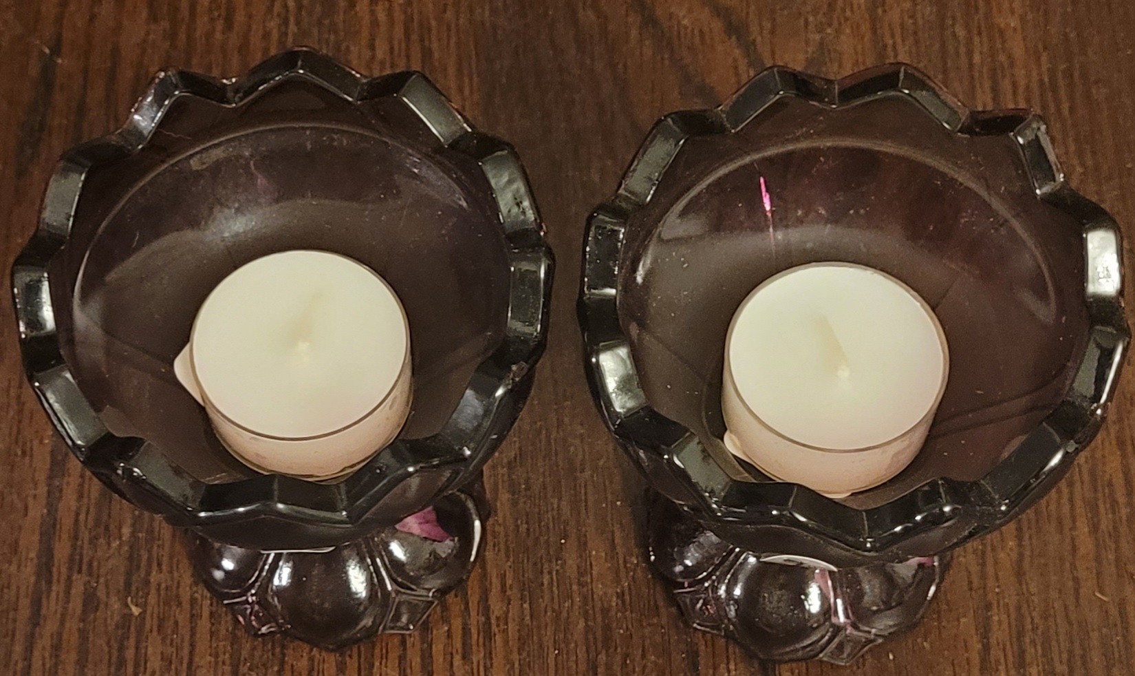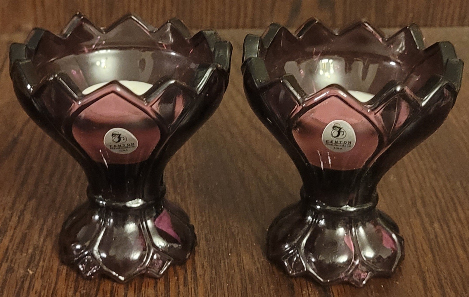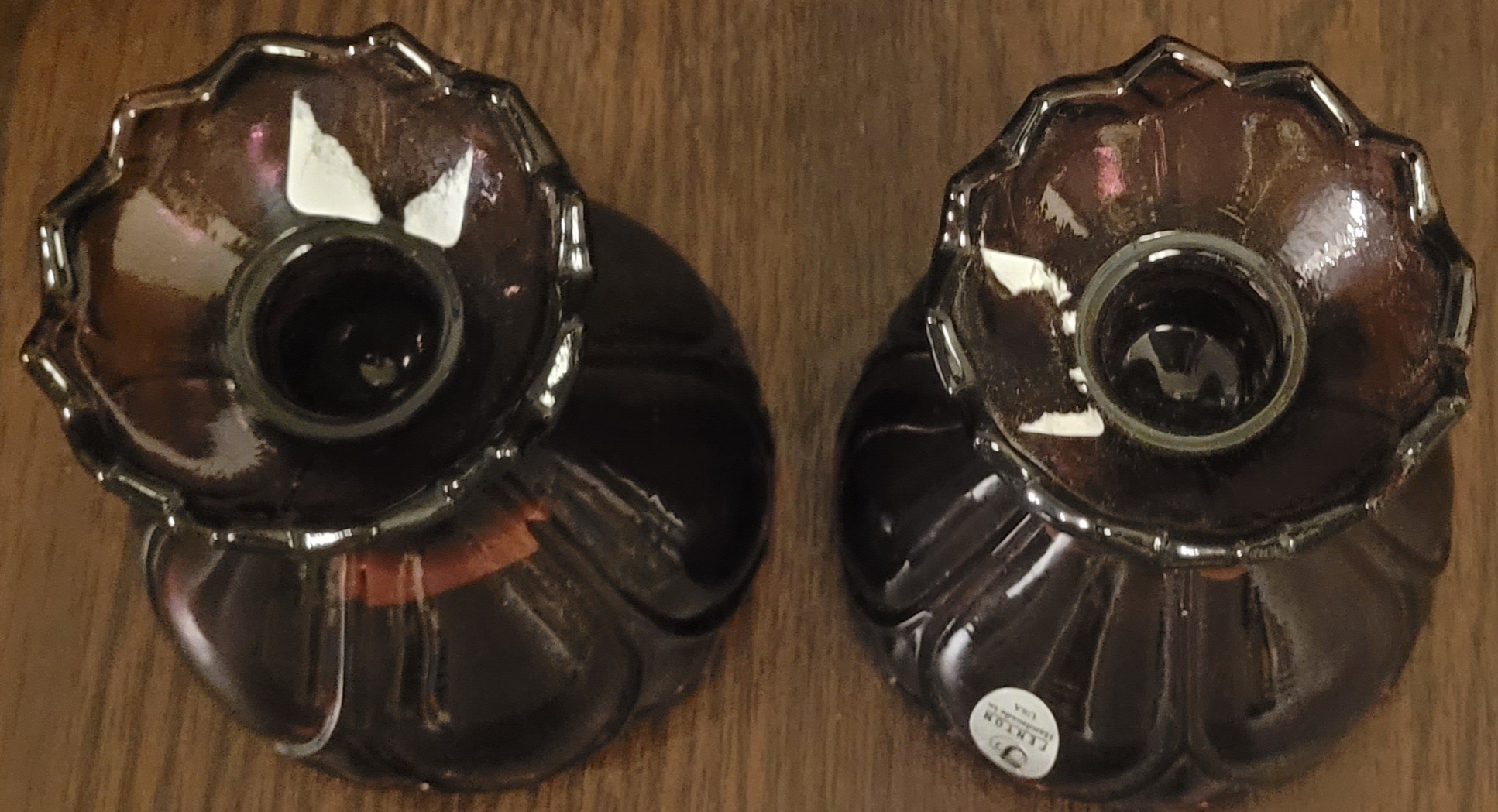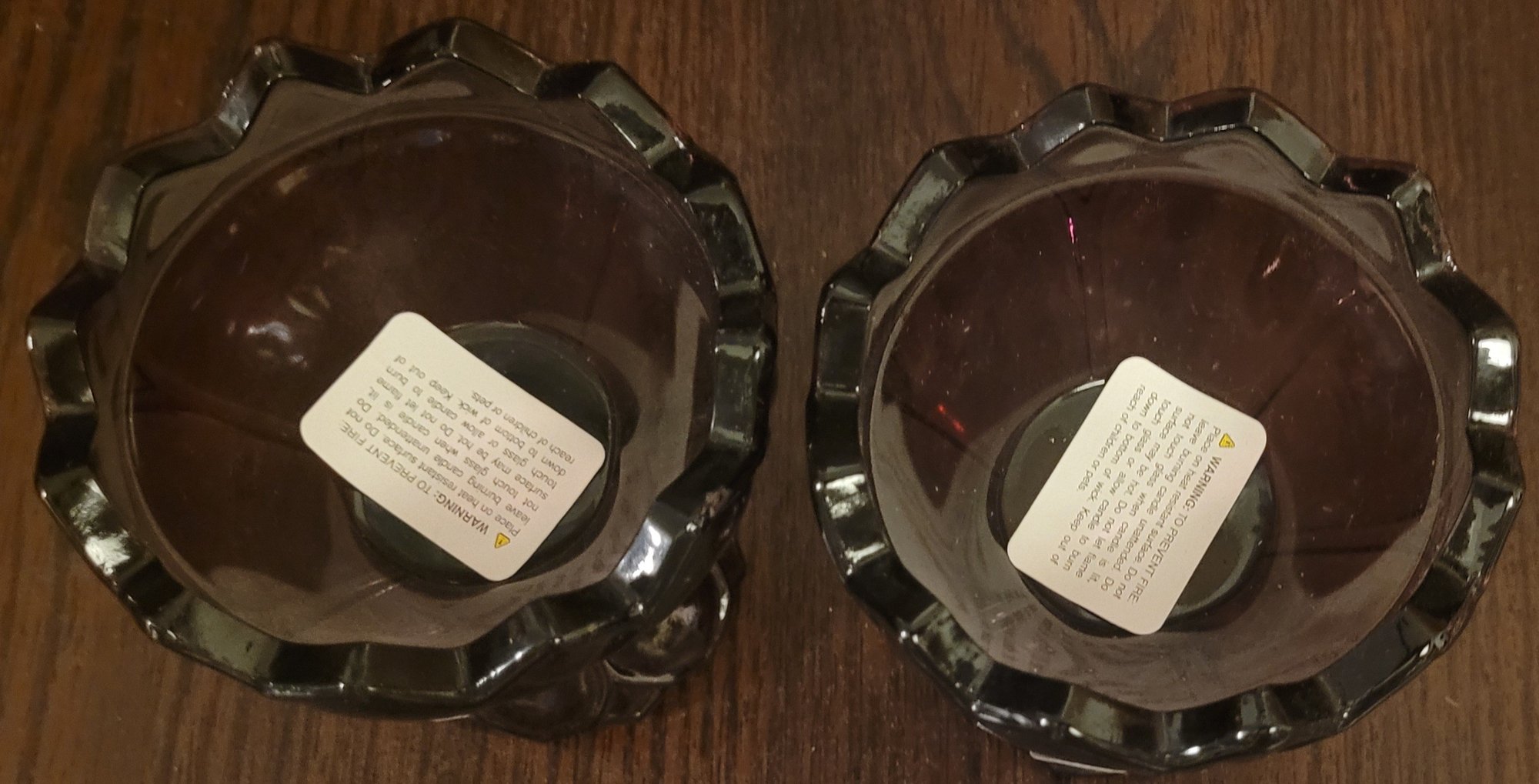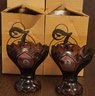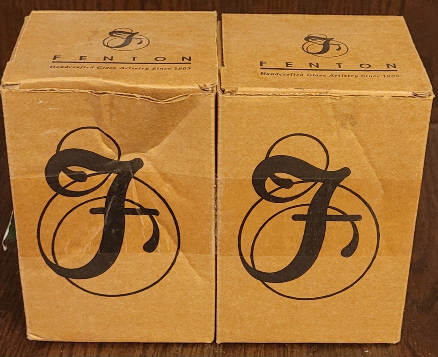 Each of these measure 4" tall by 3.625" in diameter. One does have a small chip on the top. Both come in the original boxes. See pictures for details.