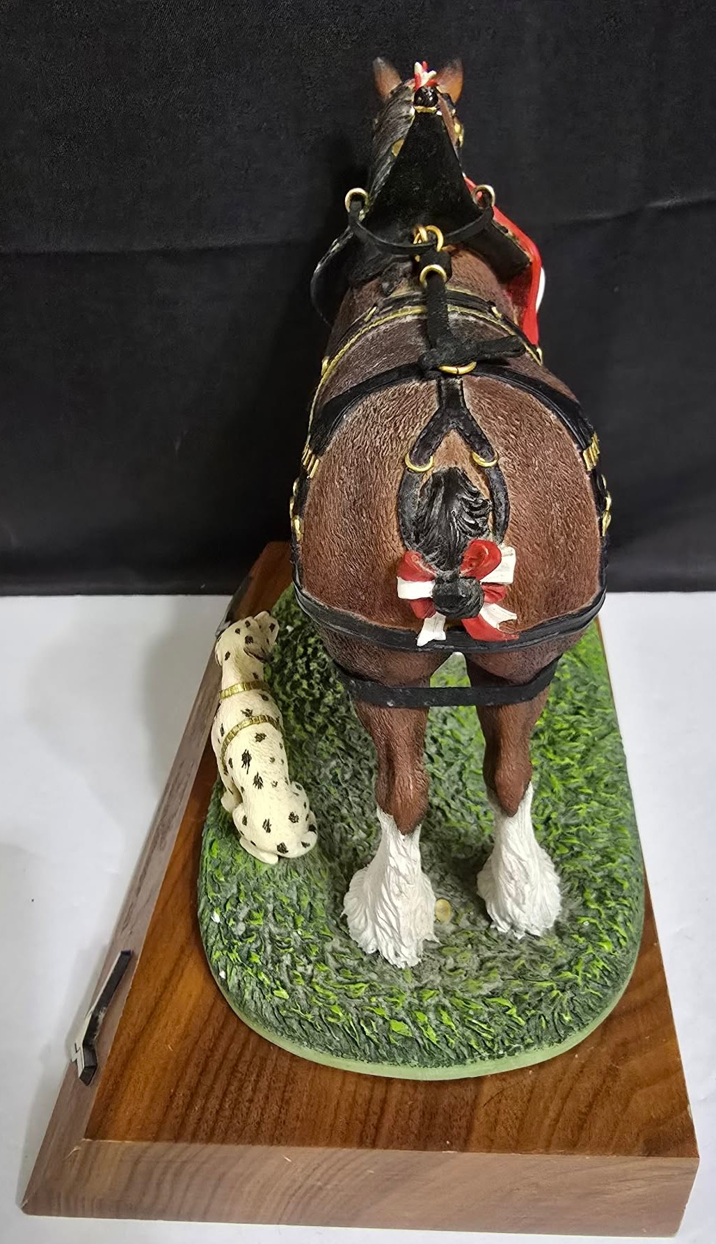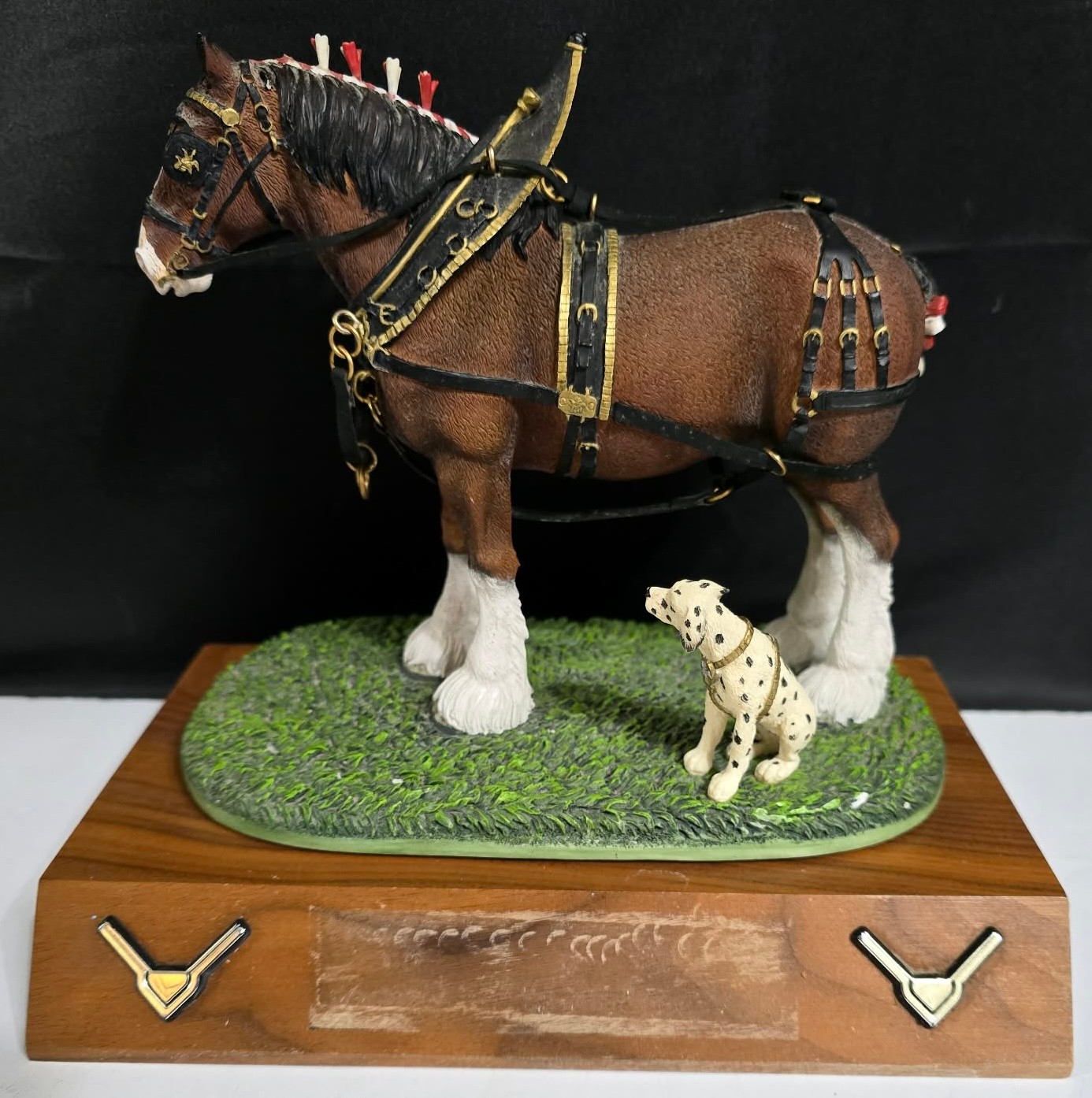 Vintage figurine is from the Anheuser-Busch Clydesdale Collection, titled "Full Parade Dress," and features the iconic Budweiser horse paired with a Dalmatian dog on a wooden base. Measures 8.5 x 5.5 x 7. Front plate has been removed. No cracks or chips noted.