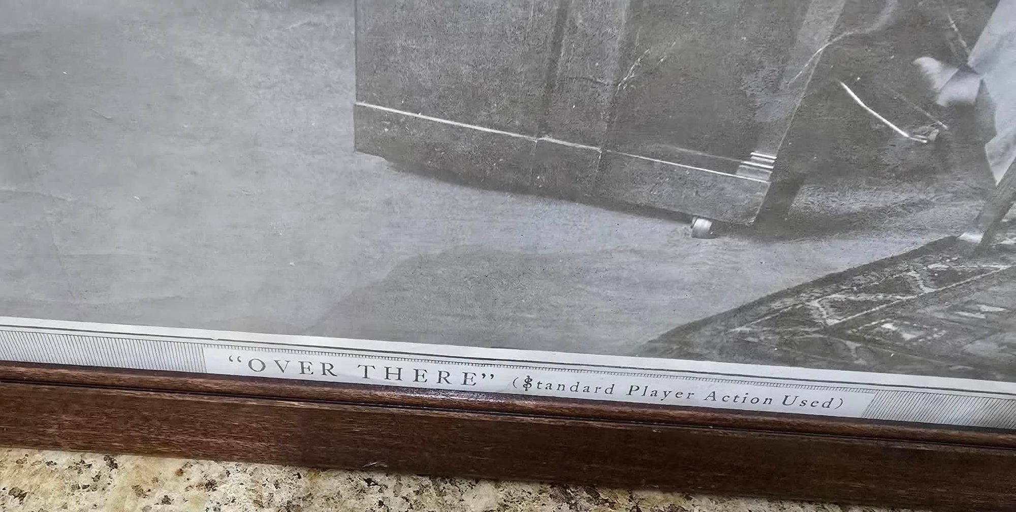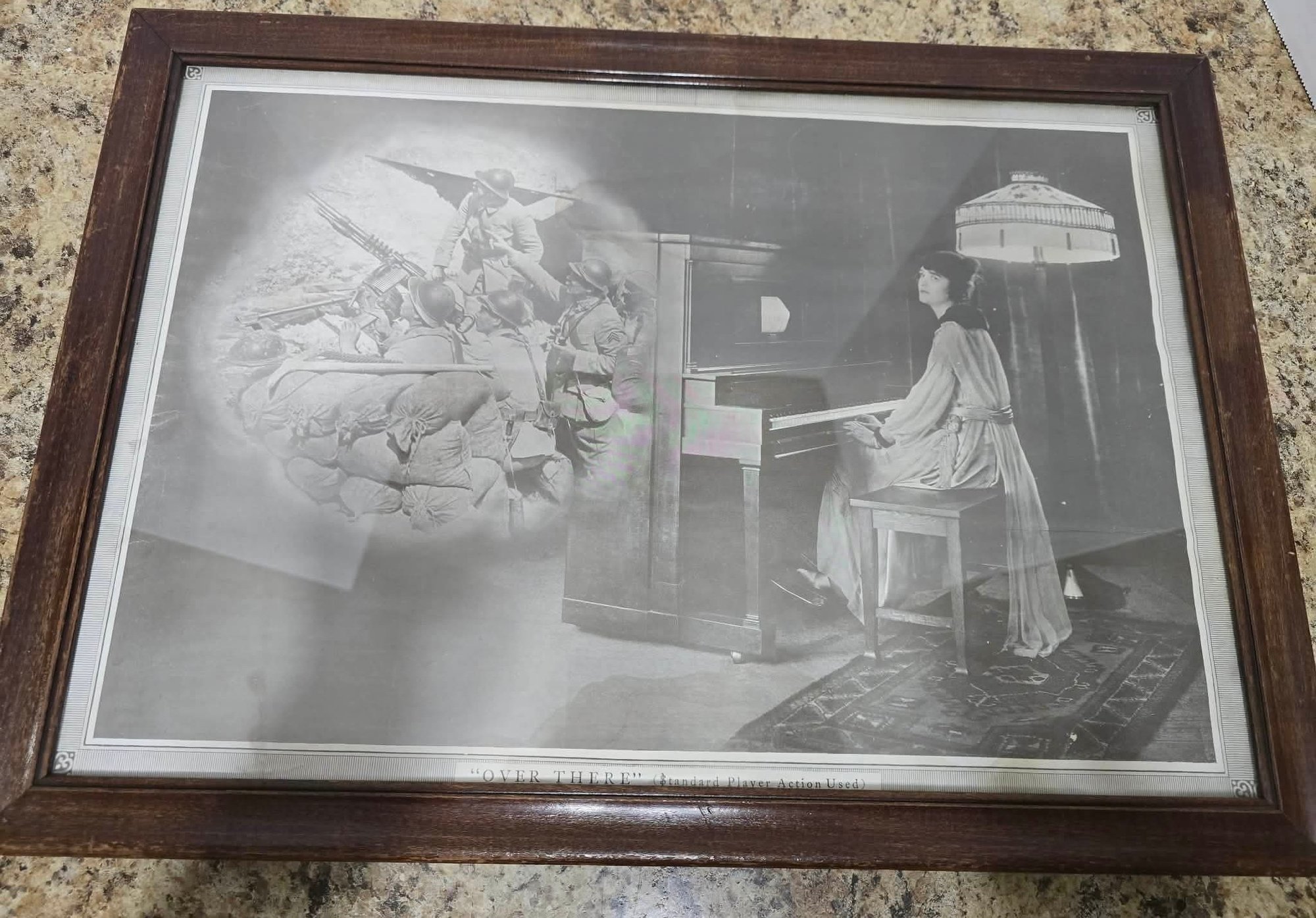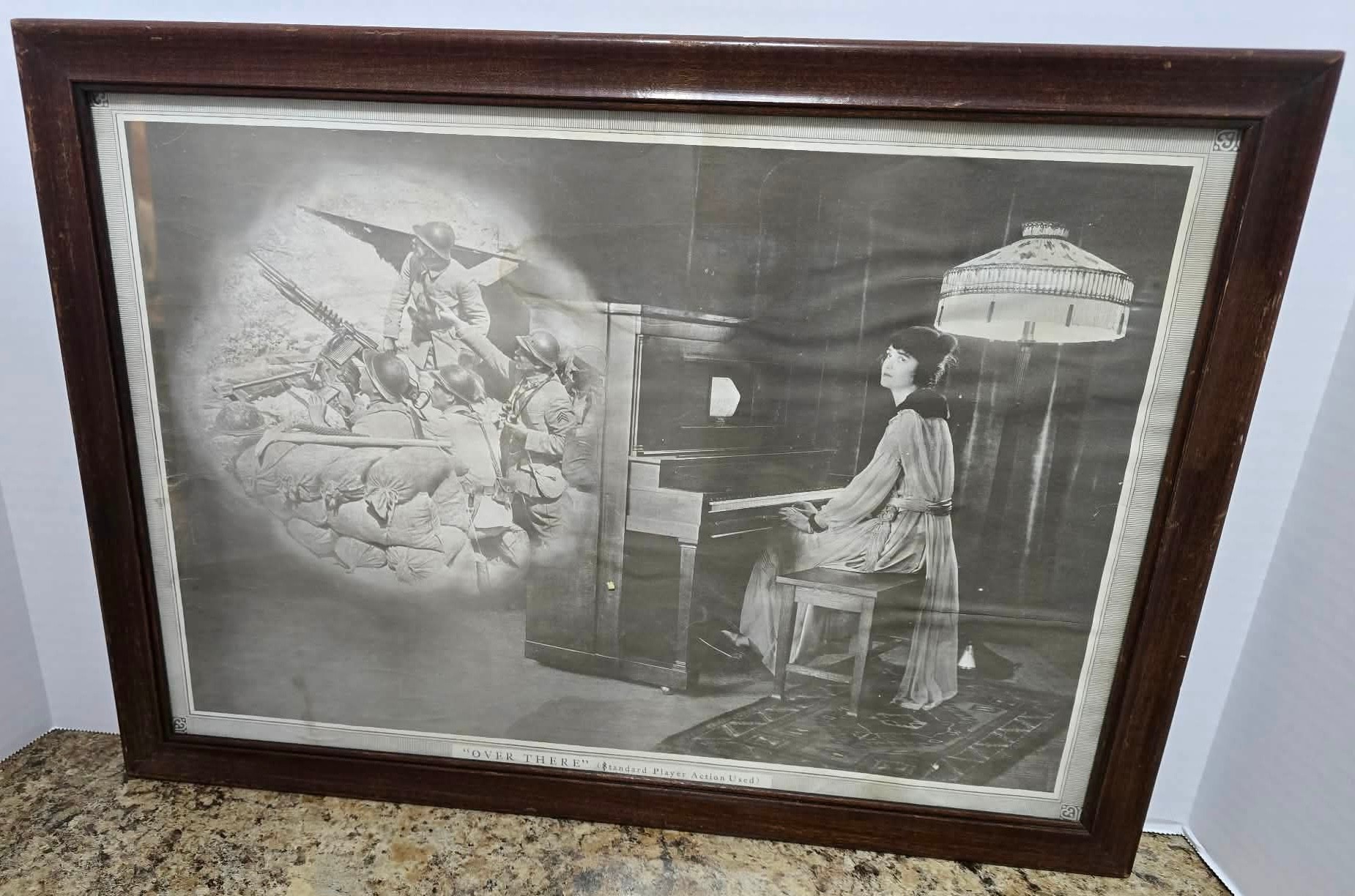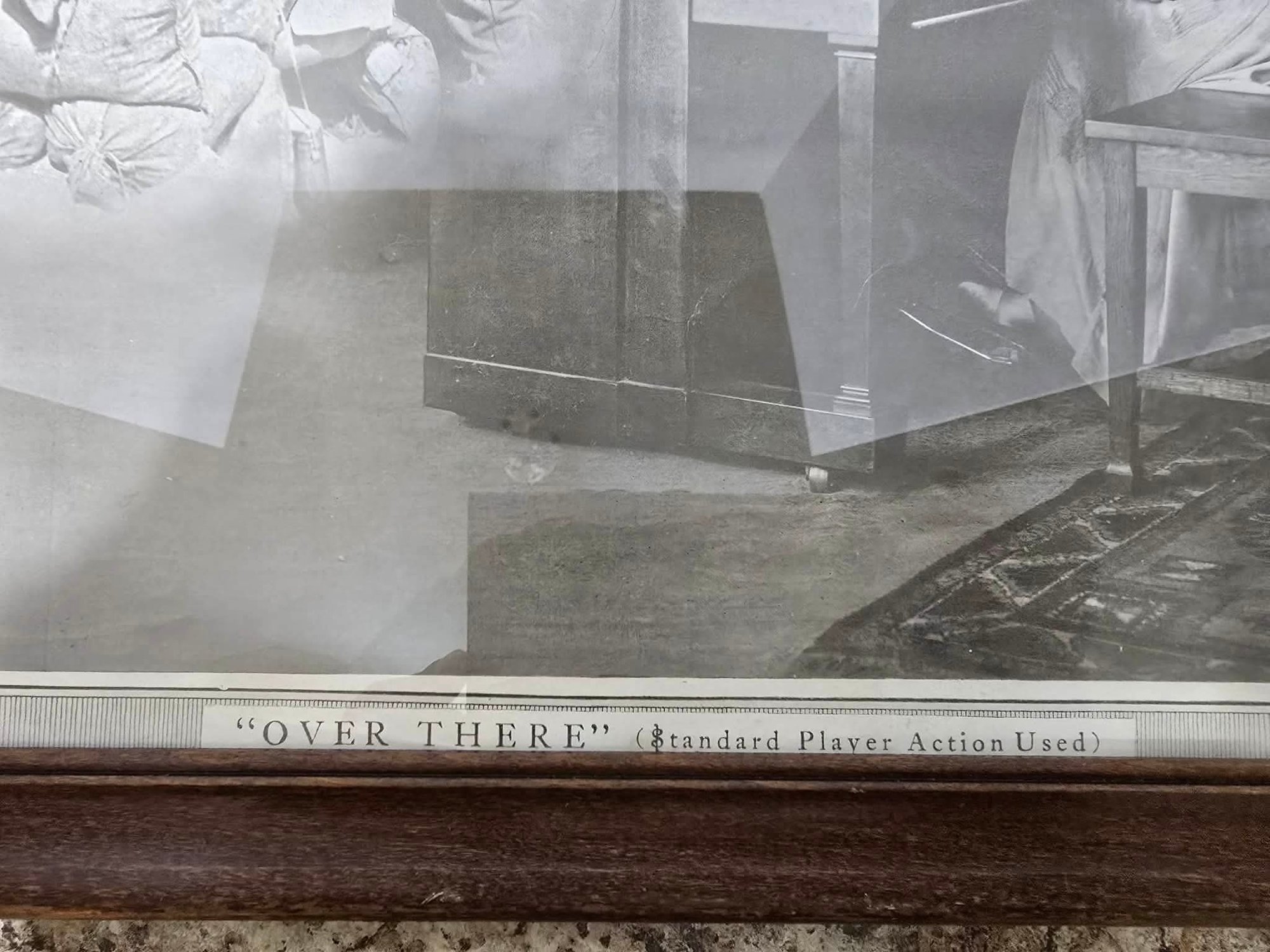 Vintage framed print entitled "Over There," featuring a young woman playing a player piano while imagining soldiers in battle. Some damage to print. Looks stained in spots and crinkled. Measures 18.5 x 13.