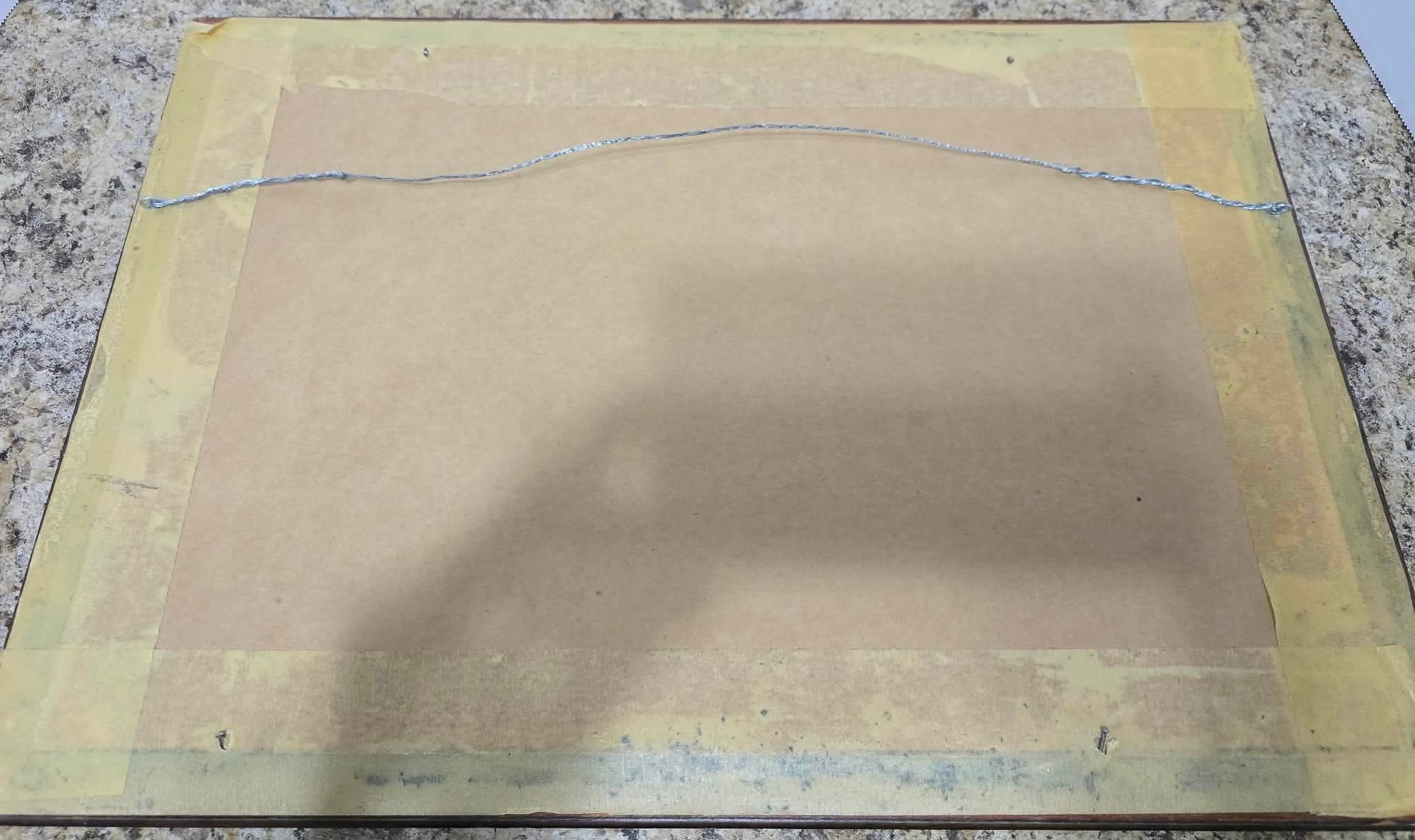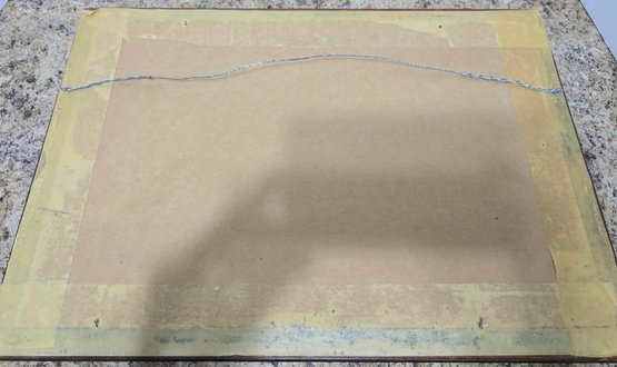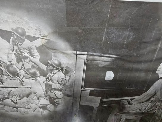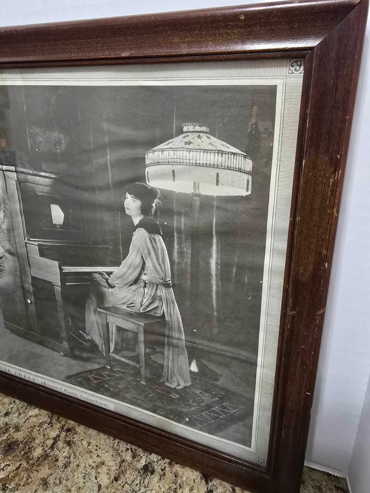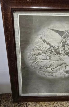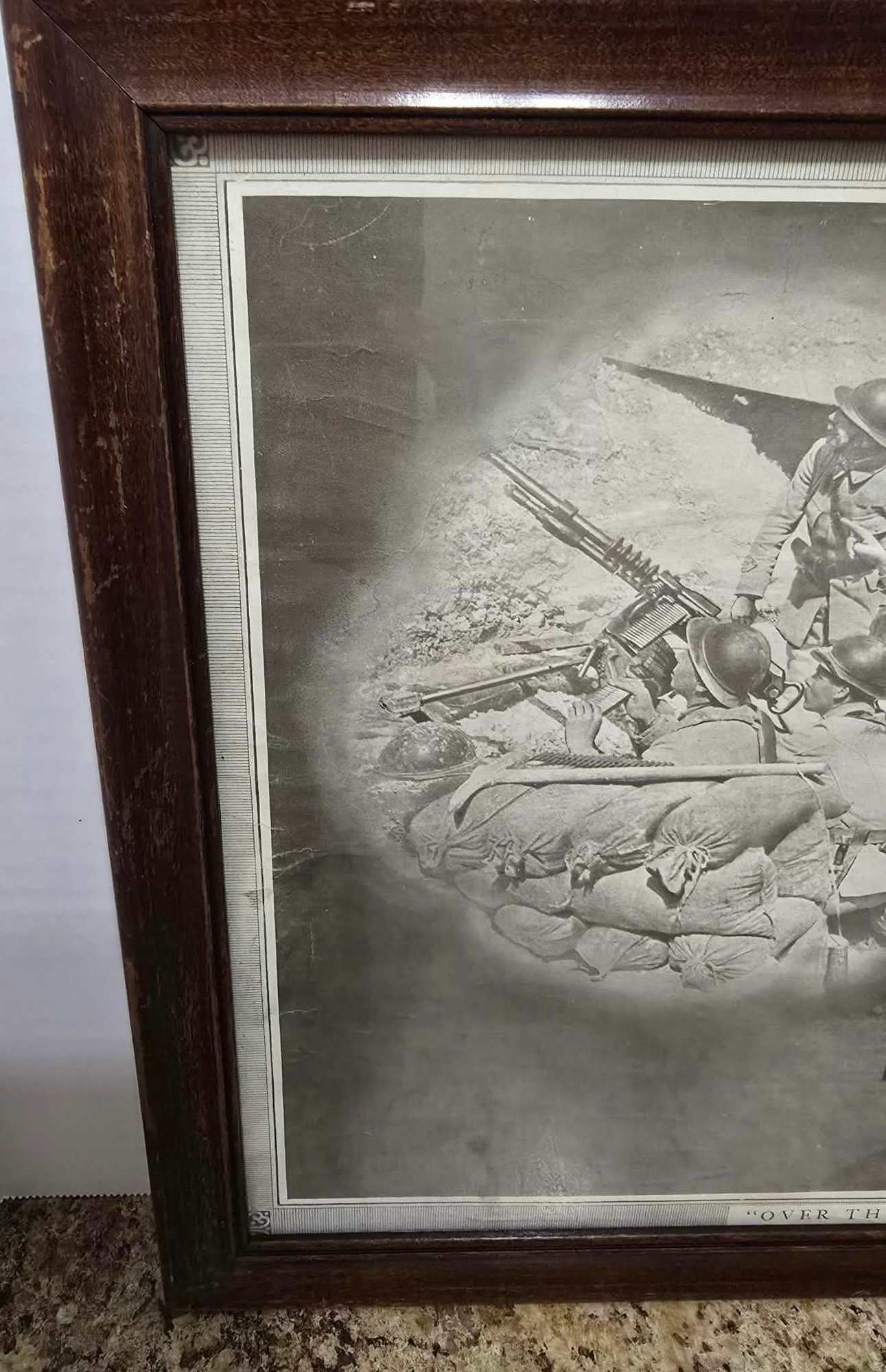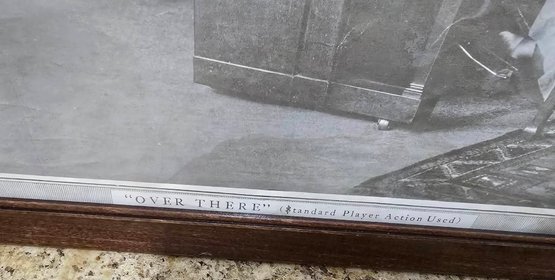 Vintage framed print entitled "Over There," featuring a young woman playing a player piano while imagining soldiers in battle. Some damage to print. Looks stained in spots and crinkled. Measures 18.5 x 13.