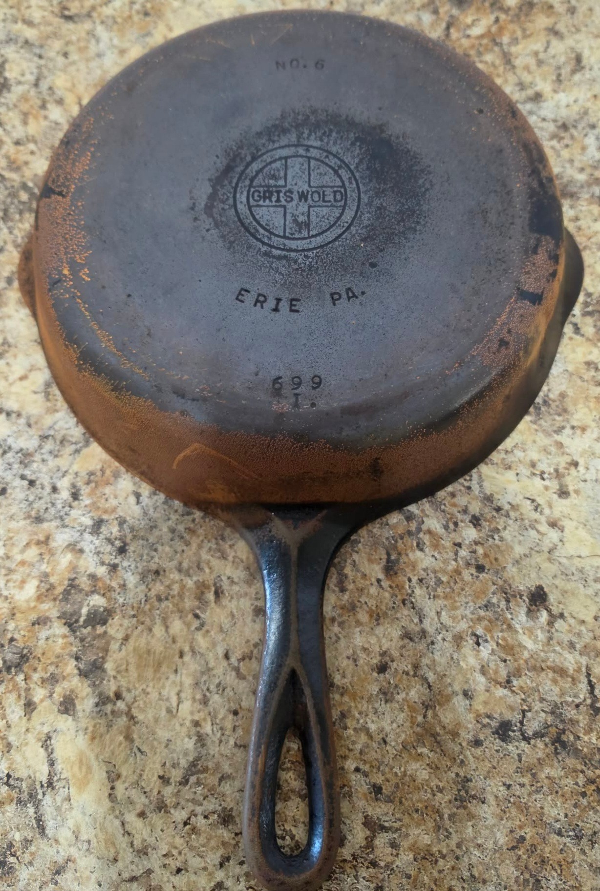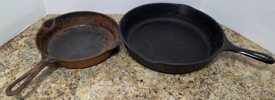 Vintage Griswold cast iron skillets. One is a no 6 and the other is 11 3/4". Needs cleaned and seasoned. Small is rusted.